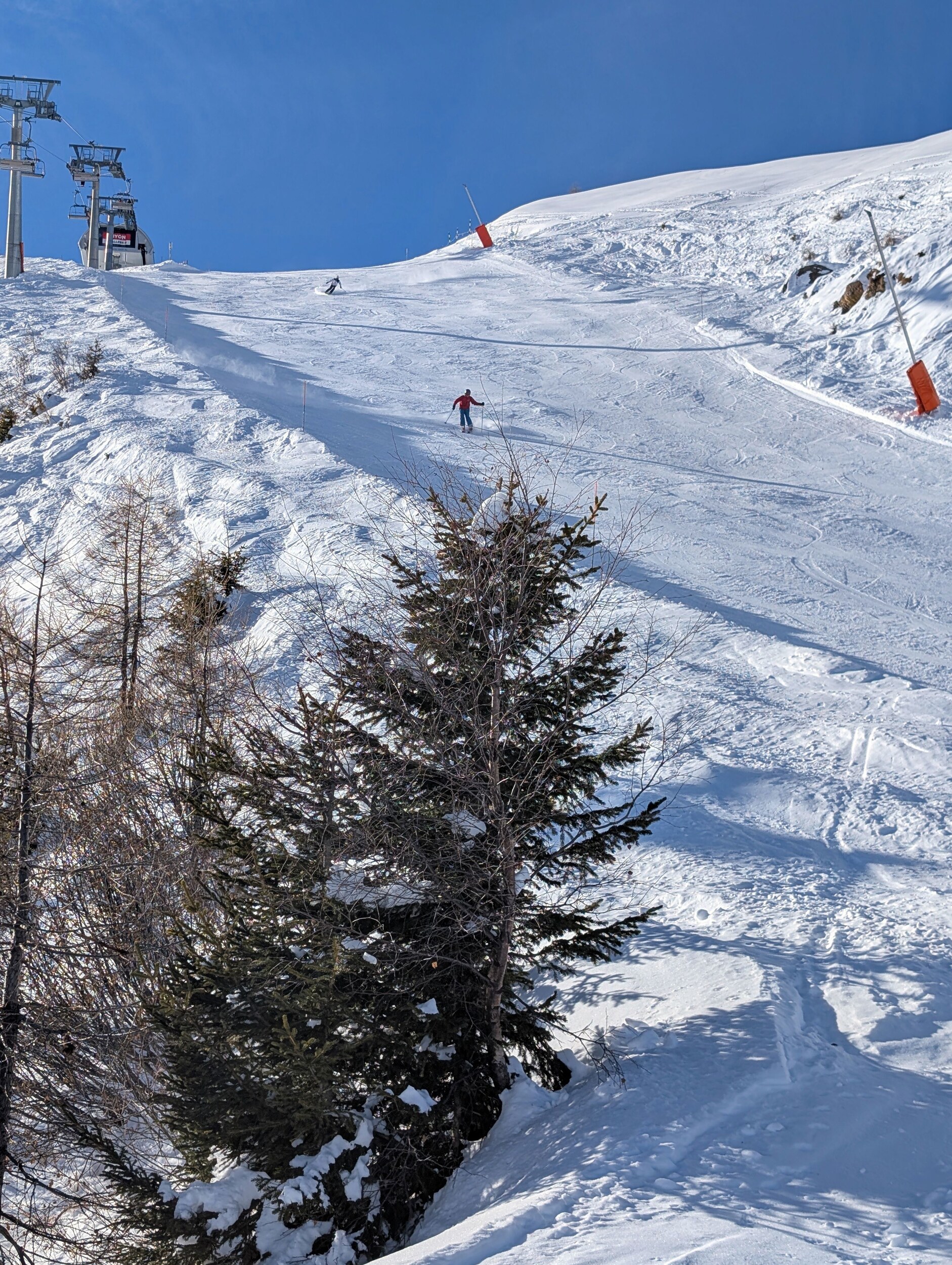 Insgesamt hatte ich nichts Besseres erwartet und es war ziemlich gut. Ein negativer Punkt ist jedoch die Abfahrtspiste in Les Masses, die geschlossen und nicht frisch präpariert ist, obwohl eindeutig genug Schnee liegt. Sie ist daher komplett vereist.