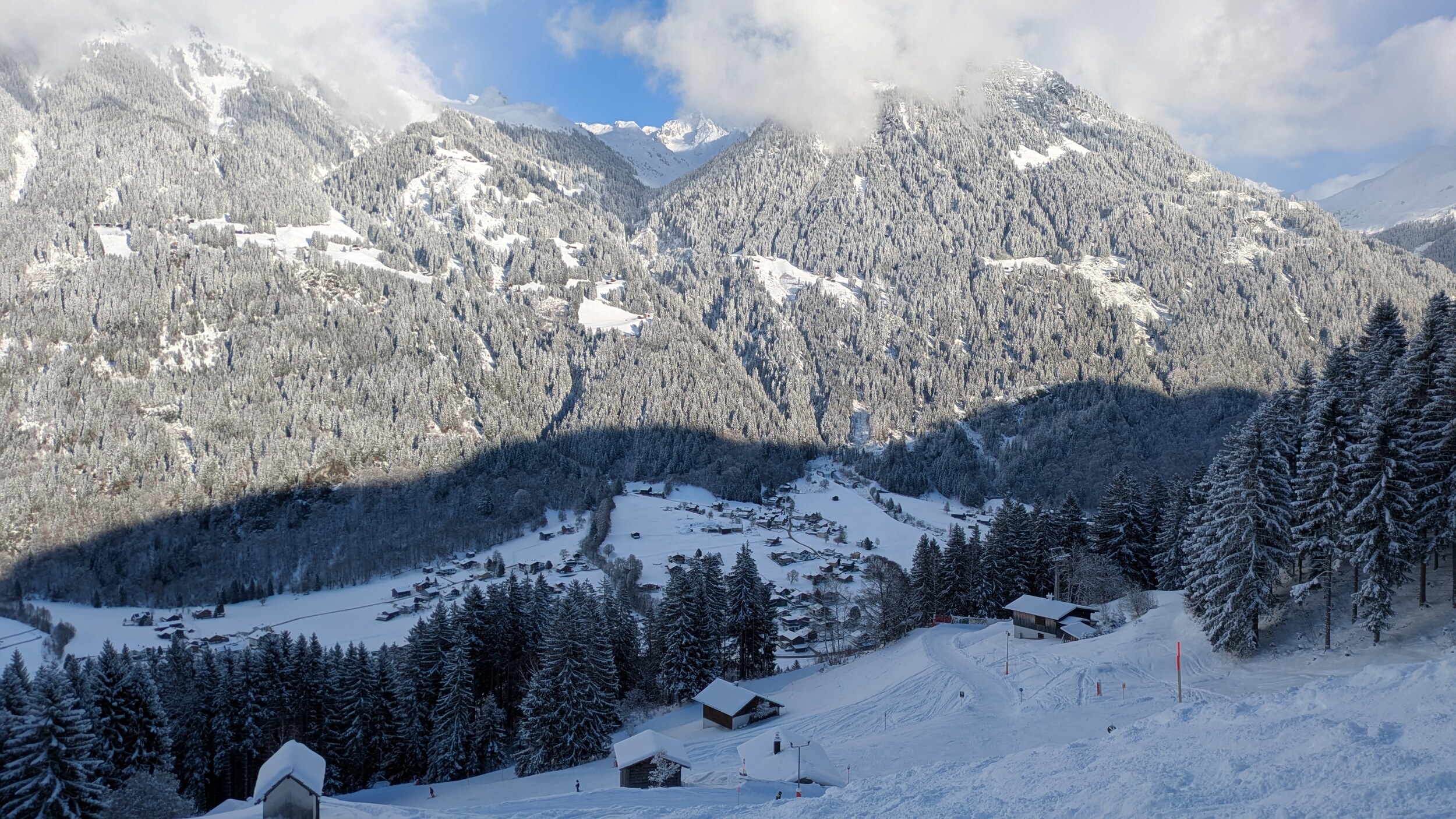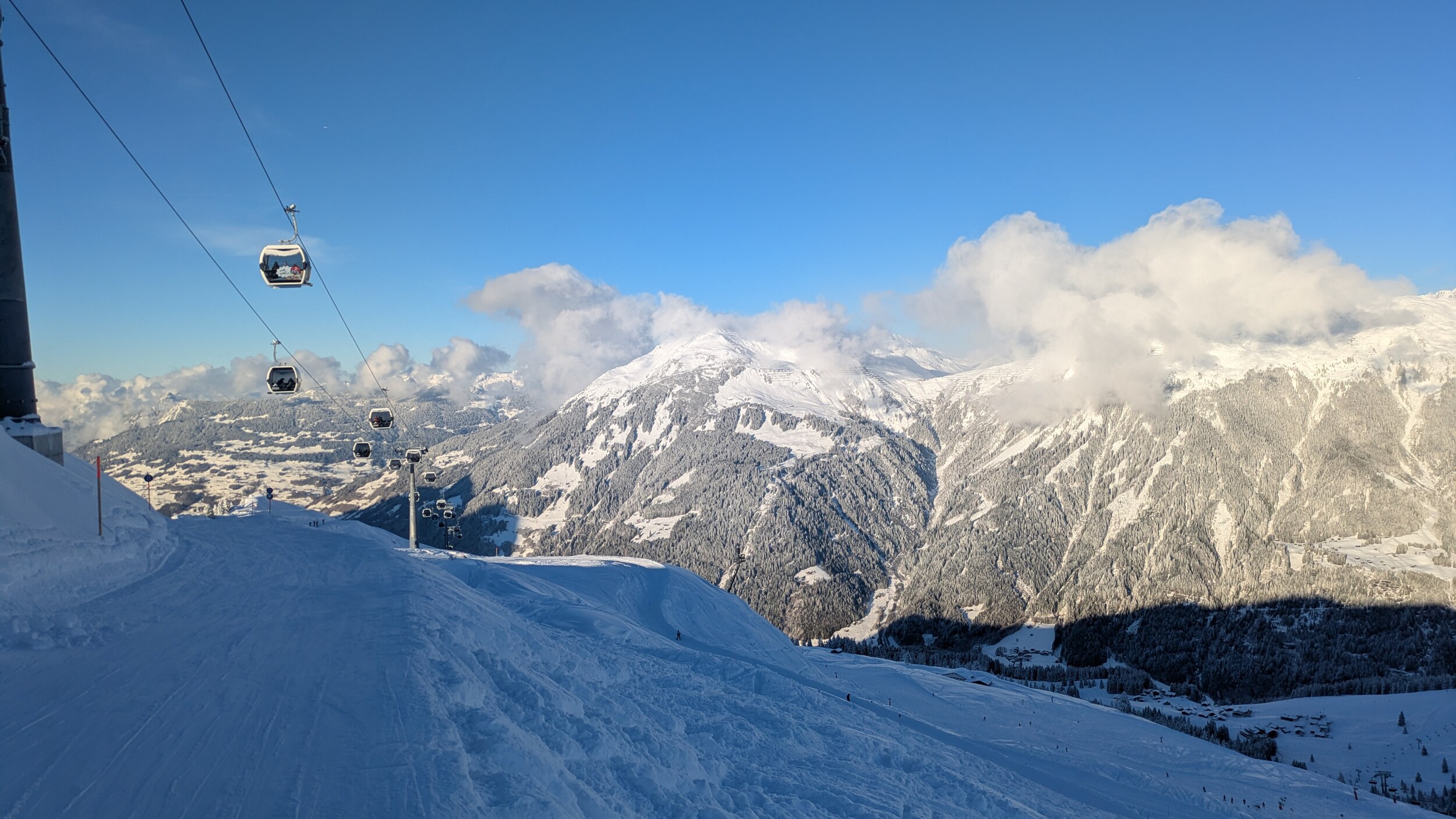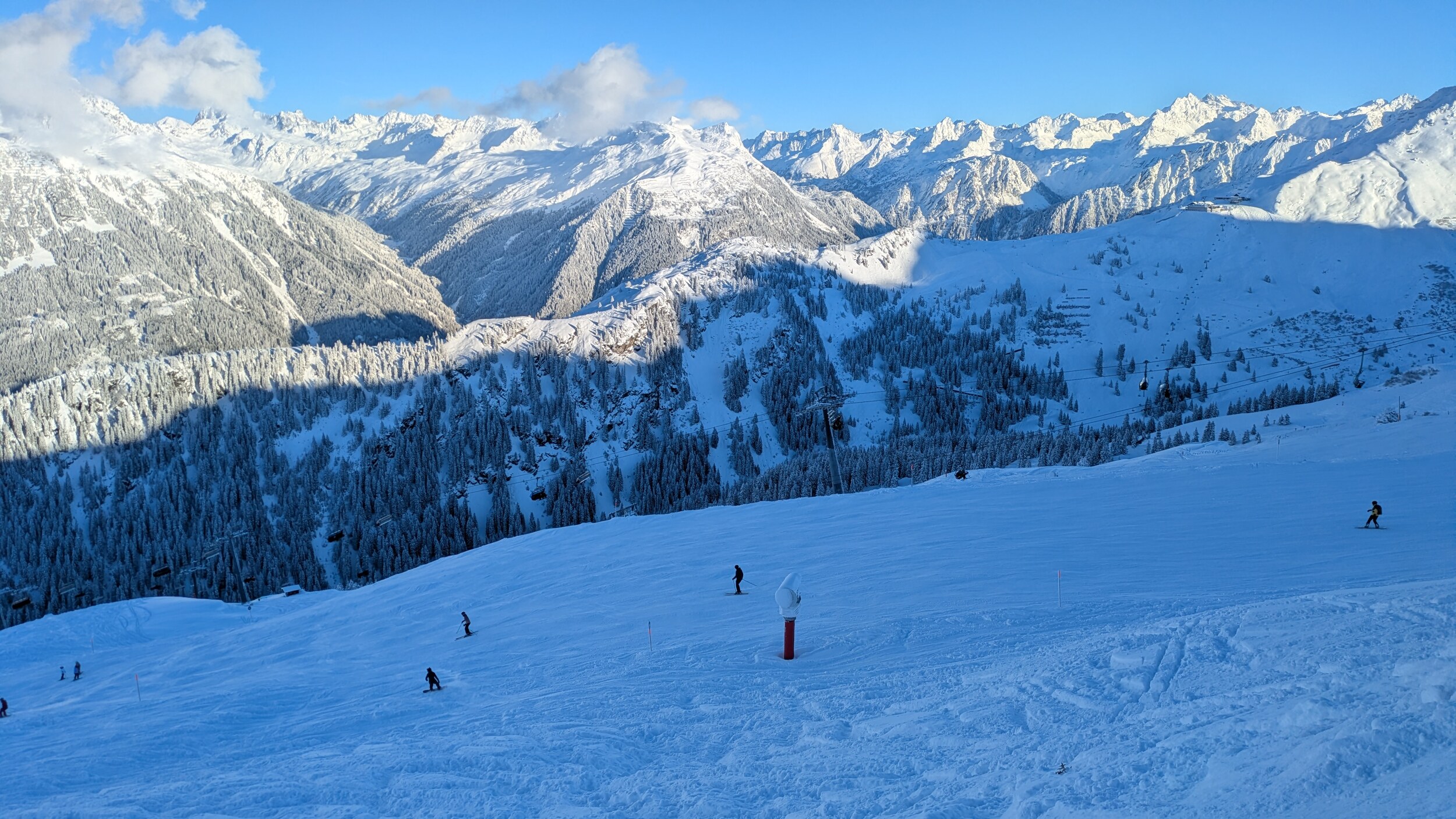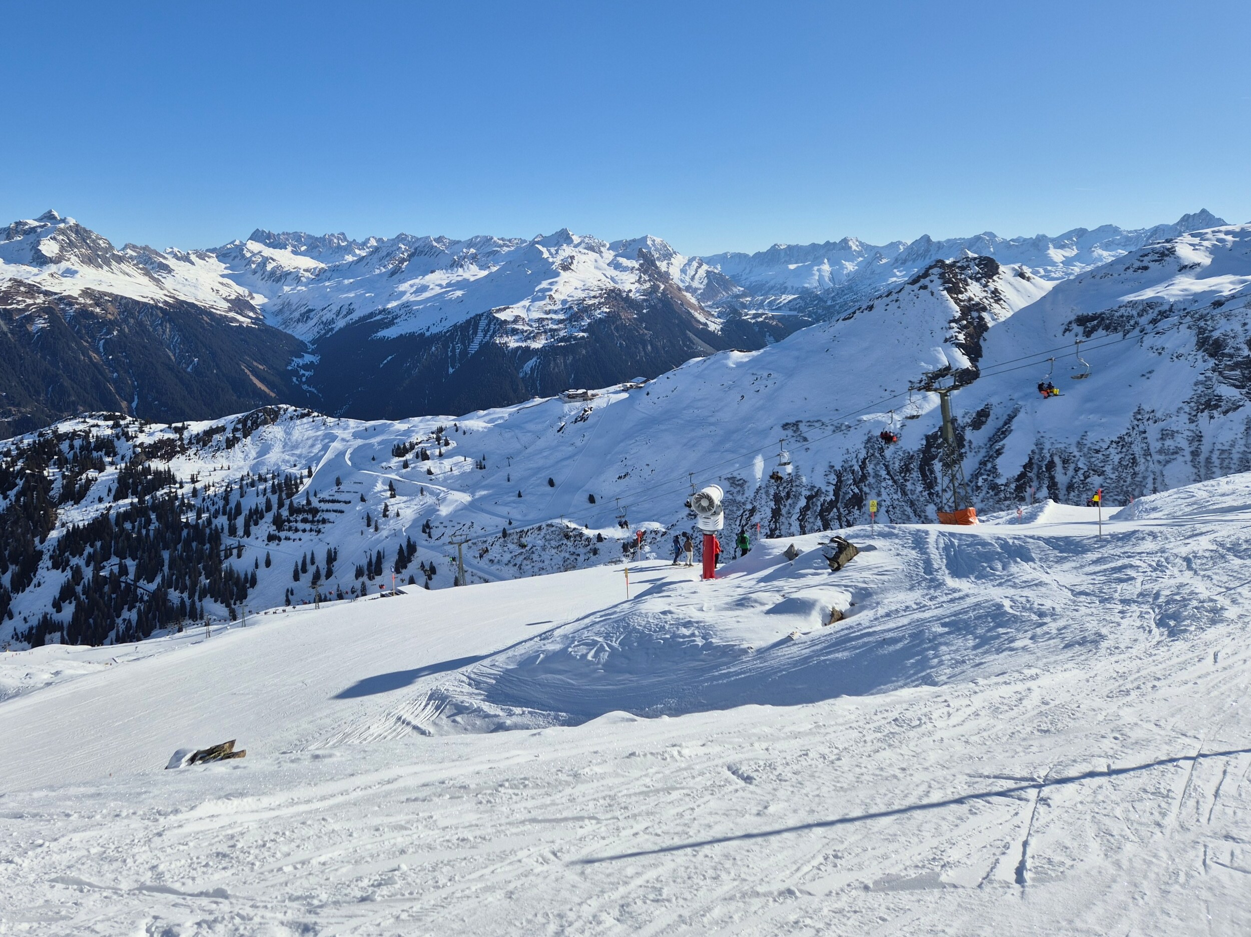 Heute (11.01.) war mein erster von vier Skitagen im Montafon. Ich war ausschließlich heute in Silvretta Montafon, nach Gargellen und eventuell auch nach Golm geht es in den nächsten Tagen. Was soll ich sagen? Im Ort meiner Unterkunft - Schruns - ist es sehr winterlich trotz der recht tiefen Höhenlage. Die Schneefallgrenze war heute bei 300 m. Die Pisten hatten eine schöne Neuschnee Schicht. Es hat ordentlich geknirscht beim Fahren. Jetzt kommt jedoch das "Aber": Das Skigebiet ist nicht so meins. Es besteht gefühlt nur aus Gondelbahnen von verschiedenen Ortschaften und Talabfahrten (Varianten). Es gibt kaum mal so eine hochalpine längere Skipiste (so zwischen 2 und 4 km Pistenlänge) in ausreichender (!) Breite, wo man mal so richtig carven kann. Zum Beispiel die Pisten an der Hochalpila-Bahn... Nur die rote 11 war offen für so eine große Gondelbahn. Und diese rote 11 war überwiegend keine 20 Meter breit. Wenn dann da auch nur einige Leute drüber fahren, kommen bei dem Neuschnee wie heute sehr zeitig die Buckel auf die Piste. Naja, ich schau mal was die nächsten Tage so bringen. Immerhin tolle Panoramen hier.