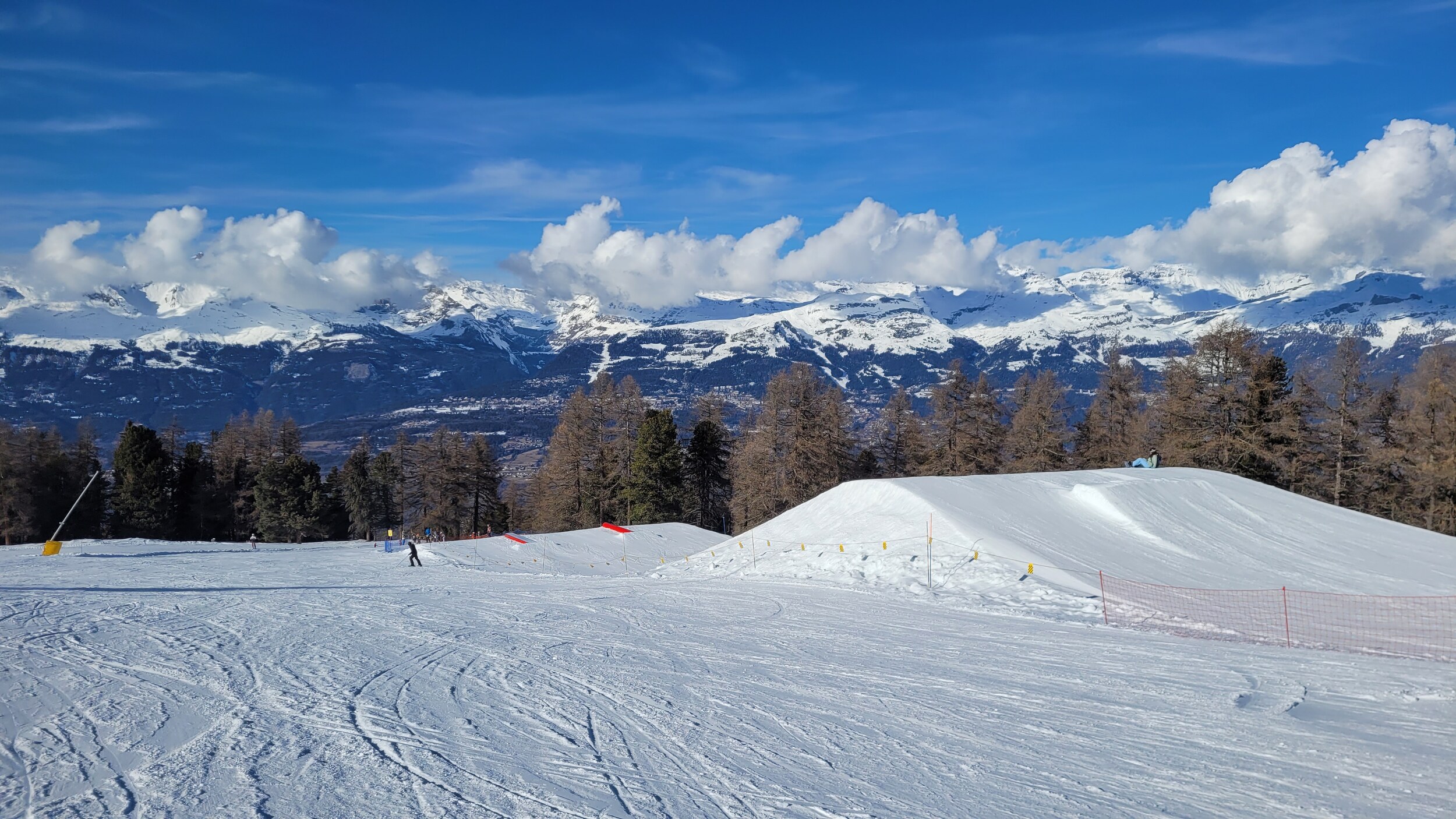 An der Bergstation Crêt du Midi war der Wind recht stürmisch, und der erste Abschnitt der Piste (neben dem Förderband) war stark verweht. Sobald man jedoch auf den nordseitigen Waldpisten ist, spürt man kaum noch Wind. Die Sicht blieb während des ganzen Skitags sehr gut.