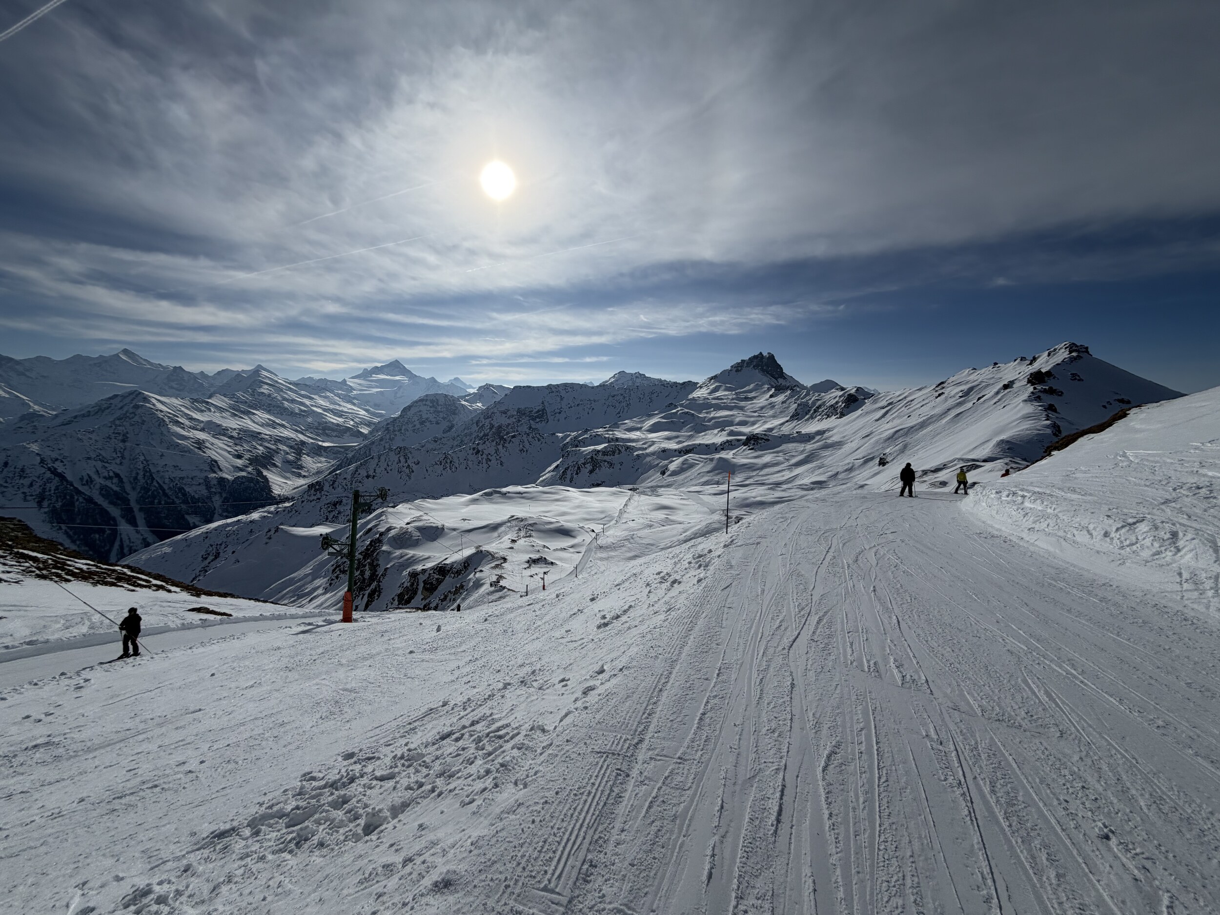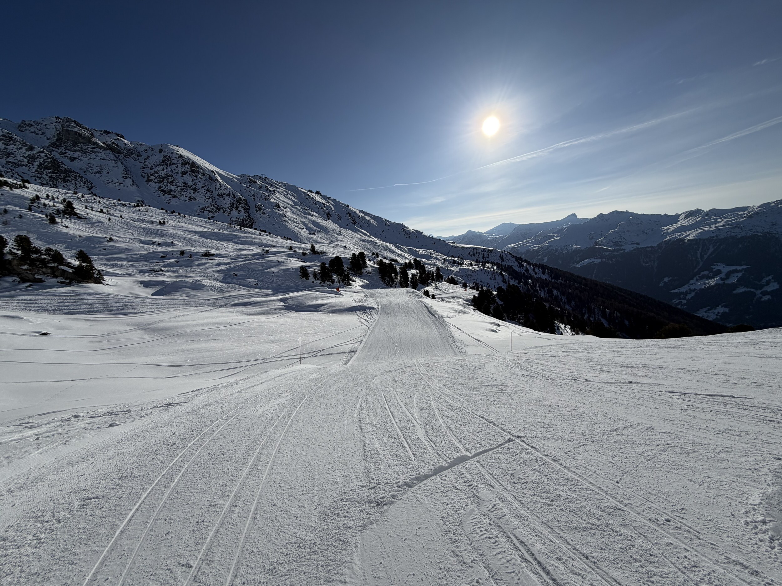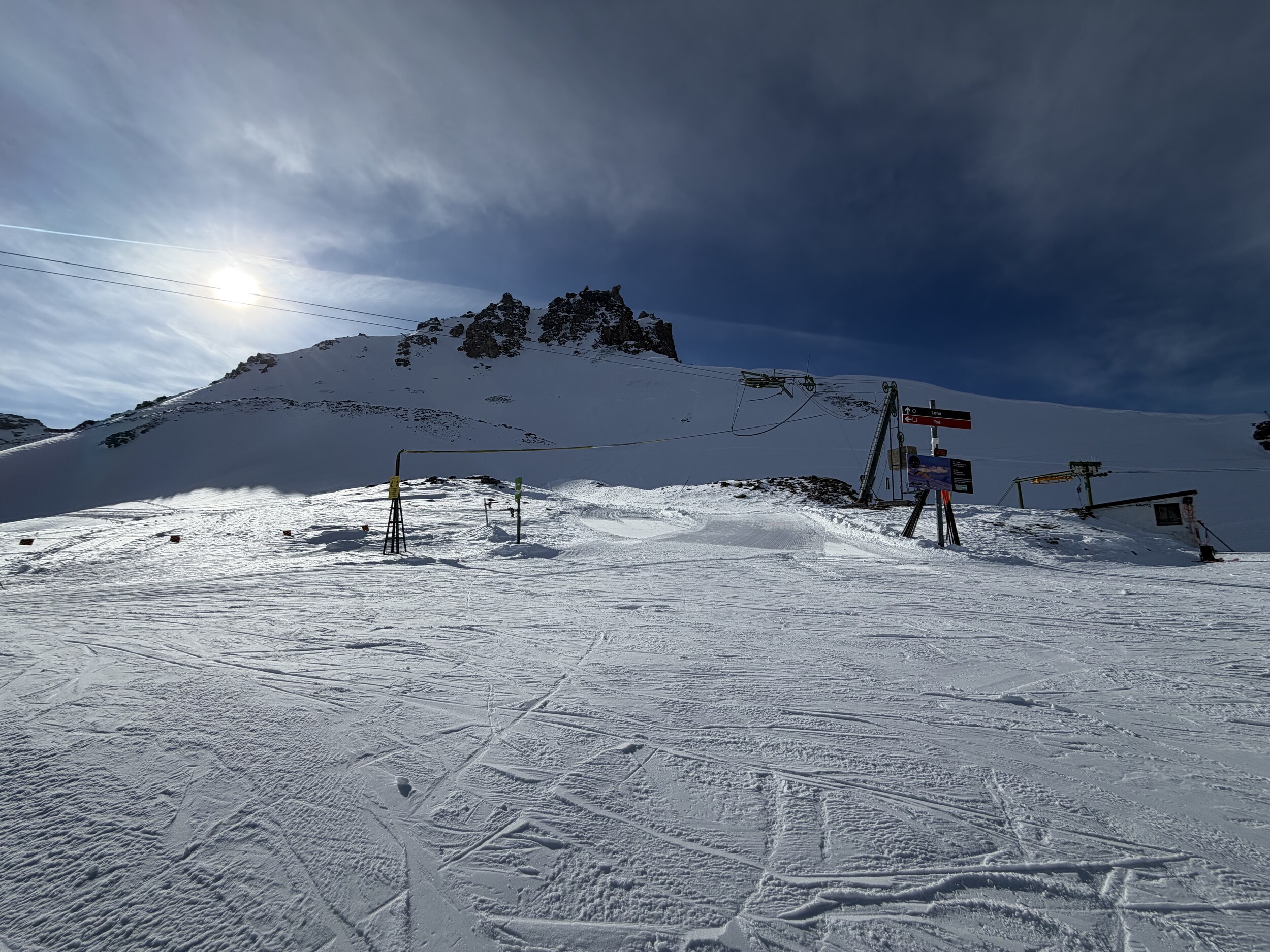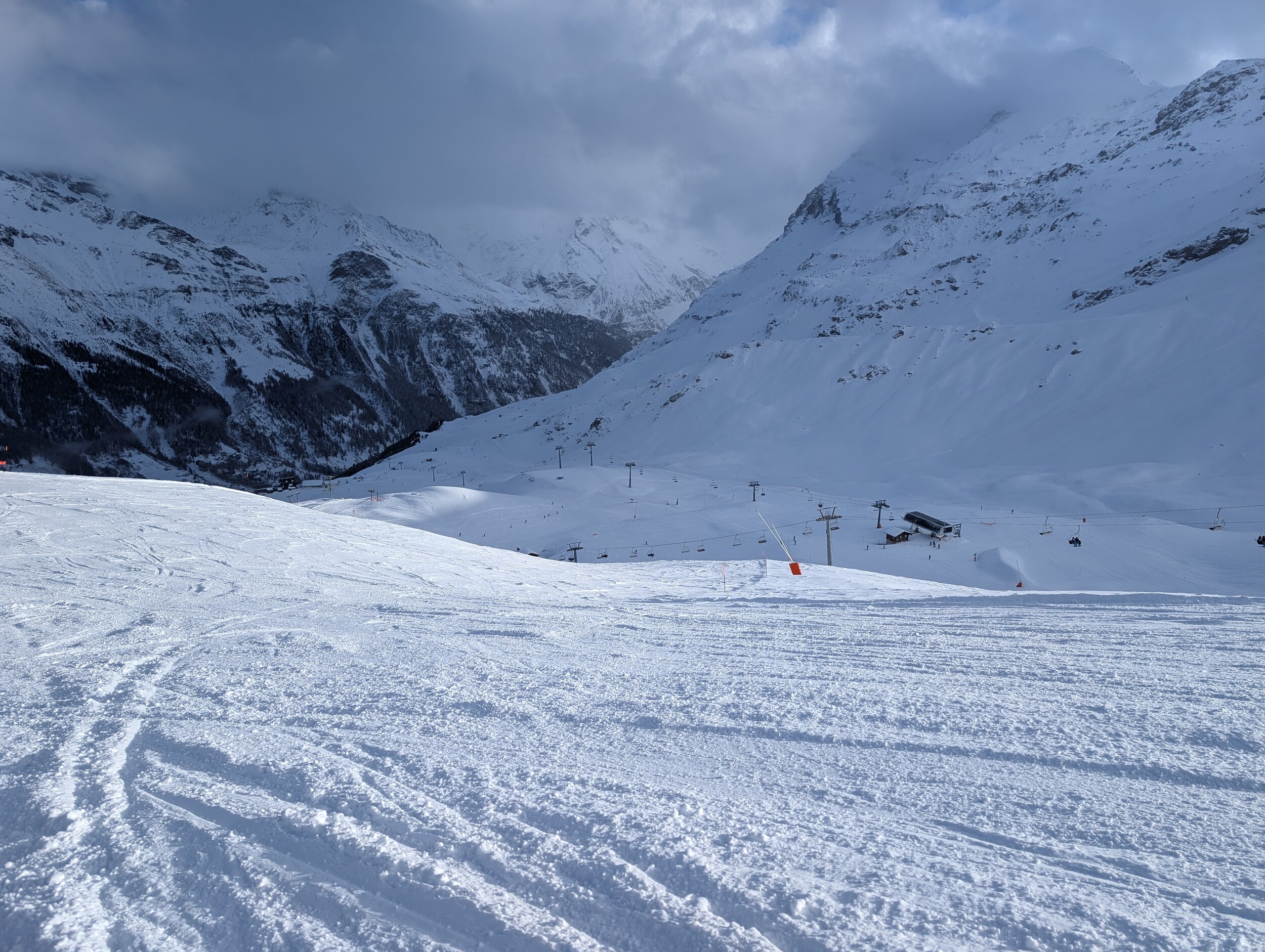 Da nichts los ist, sind die Pisten bisher kaum zerfahren, ich glaube bei mehr Andrang wäre das bald nicht mehr so cool. Um 1 liess ich es dann sein nach einem sehr guten Vormittag insbesondere an Tracuit und der Talabfahrt.
