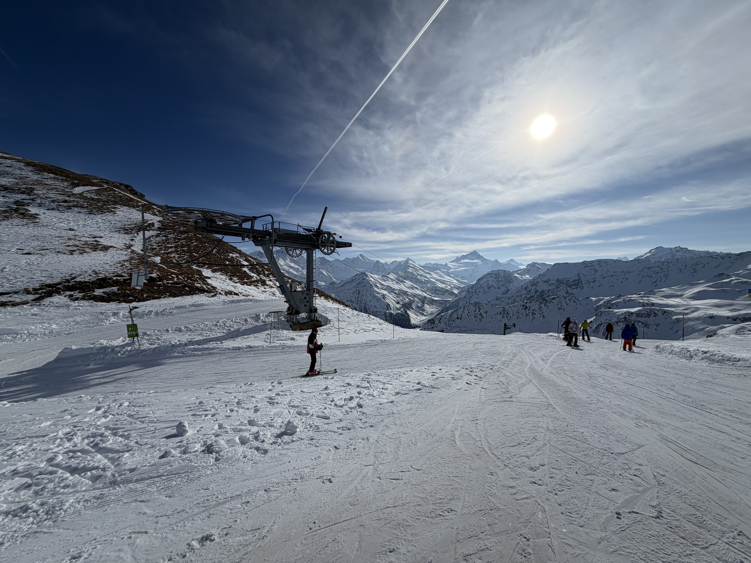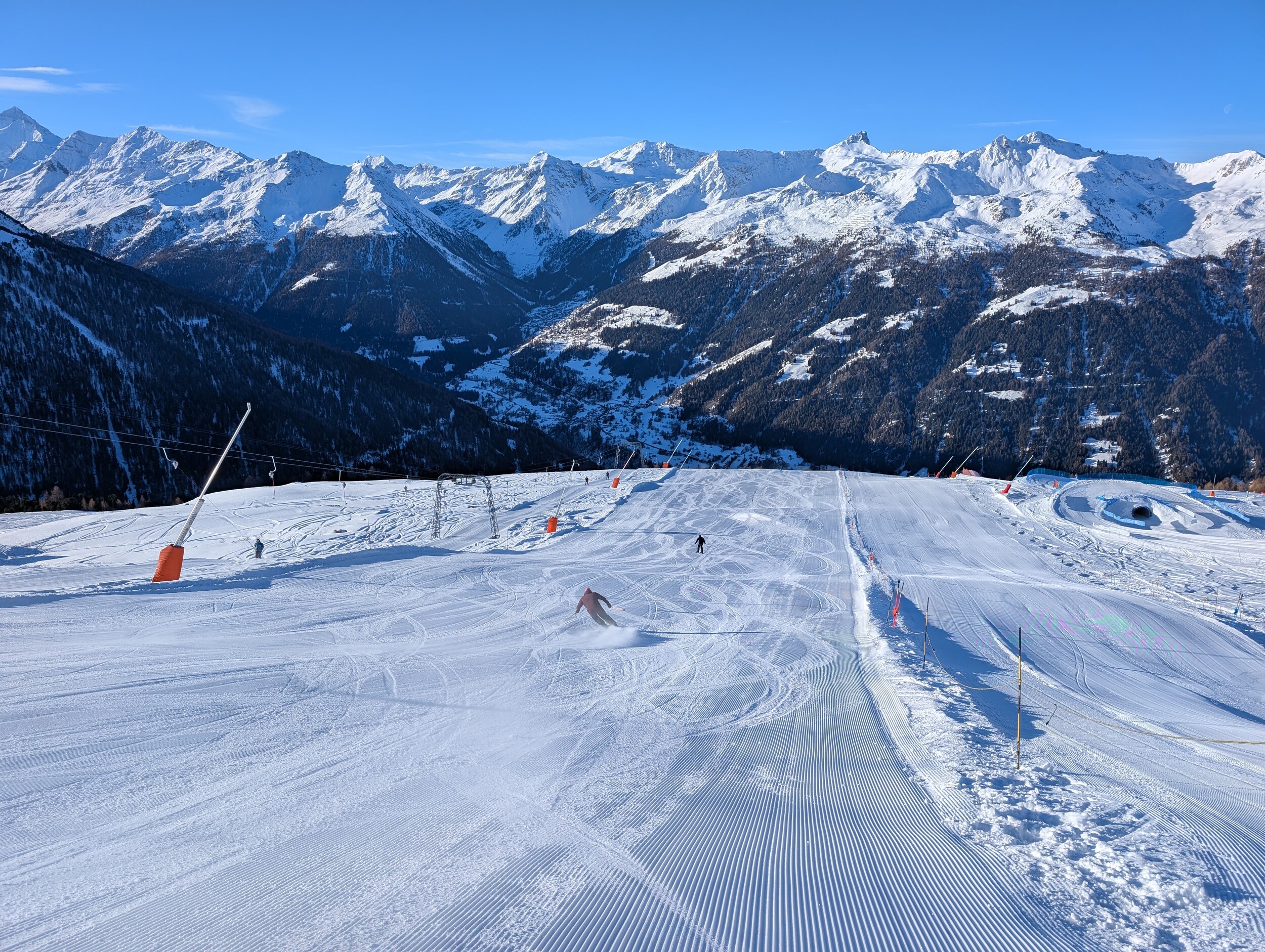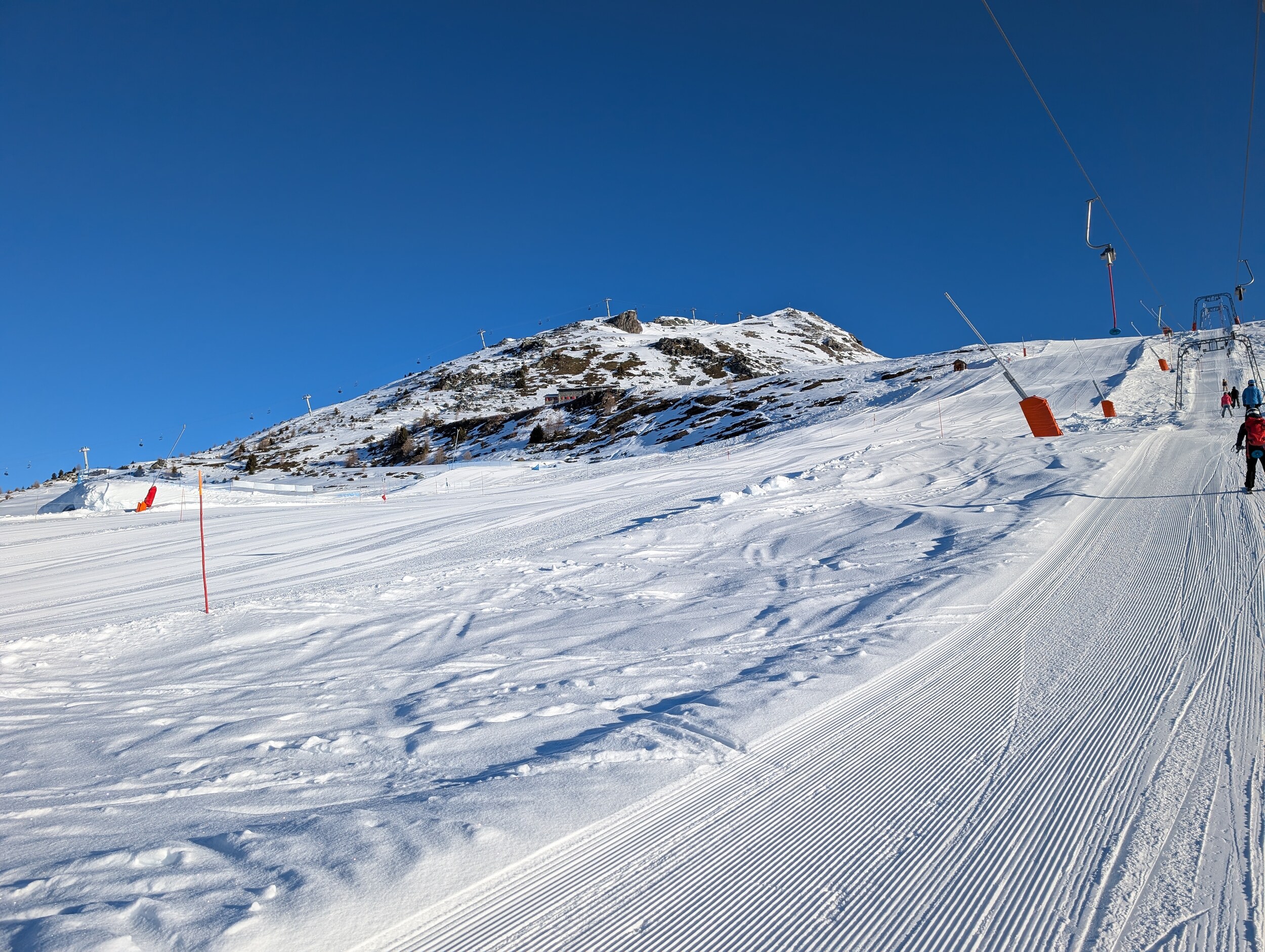 Die Öffnung verzögerte sich bis 10 Uhr, und an der Talstation bildete sich eine riesige Schlange. Die EUB lief mit reduzierter, aber stabiler Geschwindigkeit von 4 m/s, entsprechend bewegte sich die Warteschlange langsamer als üblich. Das störte jedoch nicht weiter: Der Schnee ist gut, und die Präparation ist wie immer auf gewohntem Vercorin-Niveau. Natürlich wurden die Pisten relativ schnell bucklig, aber das macht mir eigentlich Spass, und das ist mir deutlich lieber als eisige Pisten.