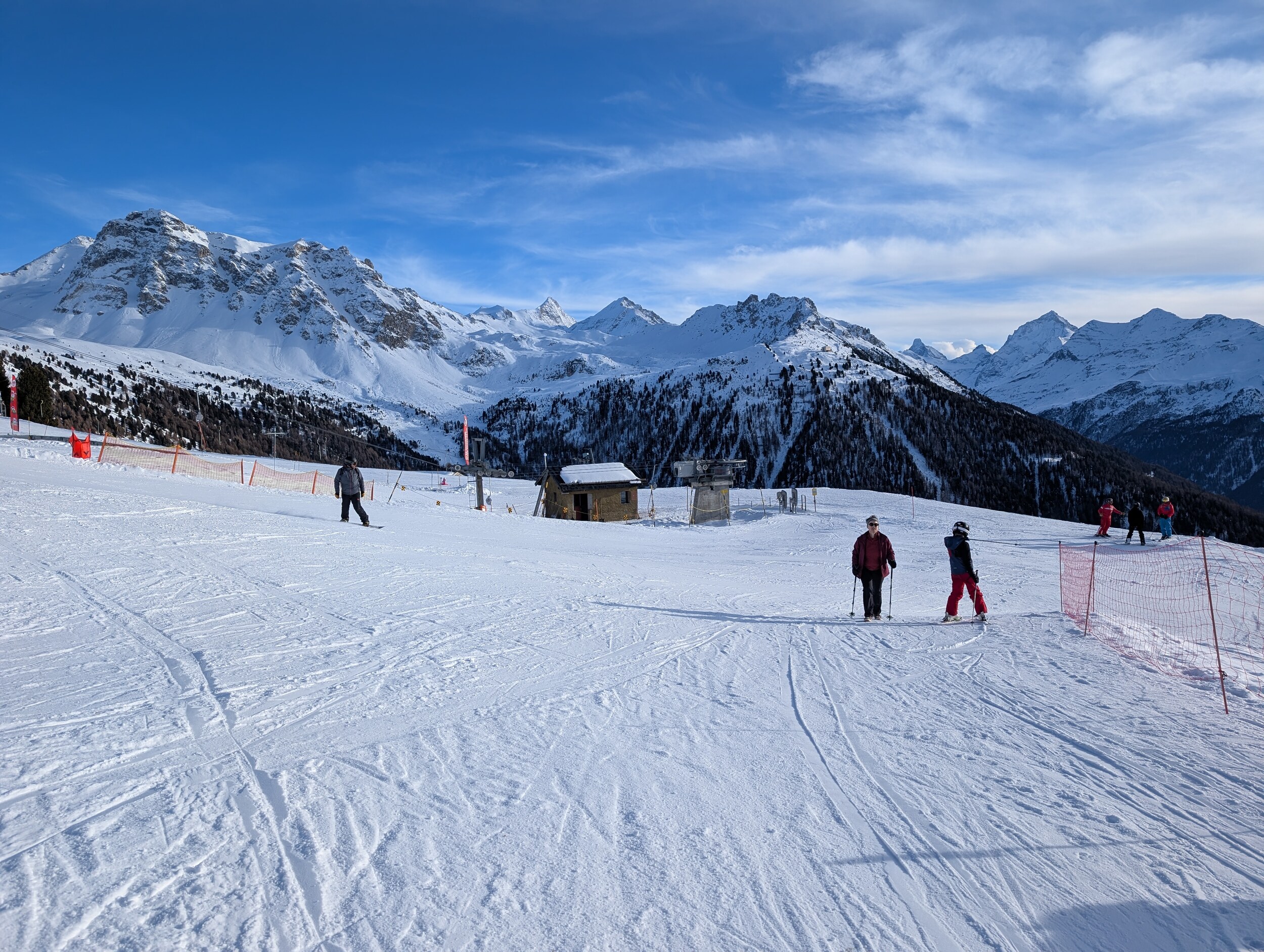 Gestern Samstag war dann St-Luc an der Reihe. Hoch ging es mit der Standseilbahn um 9 Uhr. Oben gab es dann zuerst eine Fahrt am Tignousa-Lift. Anschliessend hielten wir uns praktisch ausschliesslich rund um Col des Ombrintzes, Pas-de-Boeuf und Bella-Tola auf. Die Pistenverhältnisse waren angesichts der nicht gerade üppigen Schneelage ausgezeichnet und dank der bescheidenen Liftkapazitäten hatte man auch auf der Piste immer genügend Platz. Am Col des Ombrintzes gab es Wartezeiten von ca. 5 Minuten, am Pas-de-Boeuf waren es eher knappe 10 Minuten. Nachmittags gab es dann noch zwei Fahrten am La Fôret, die einzigen Fahrten im Sitzen während dem gesamten Tag. Allerdings auch die schlechtesten: Die Pisten waren hart bis eisig bzw. schneearm und dazu üppig mit Kamikazefahrern bestückt. Auf einen Abstecher nach Chandolin verzichteten wir dann schliesslich. Die Talabfahrt nach St-Luc war nachmittags nach 16 Uhr noch ausgezeichnet zu fahren, fast hätte ich sie noch ein zweites Mal gemacht.