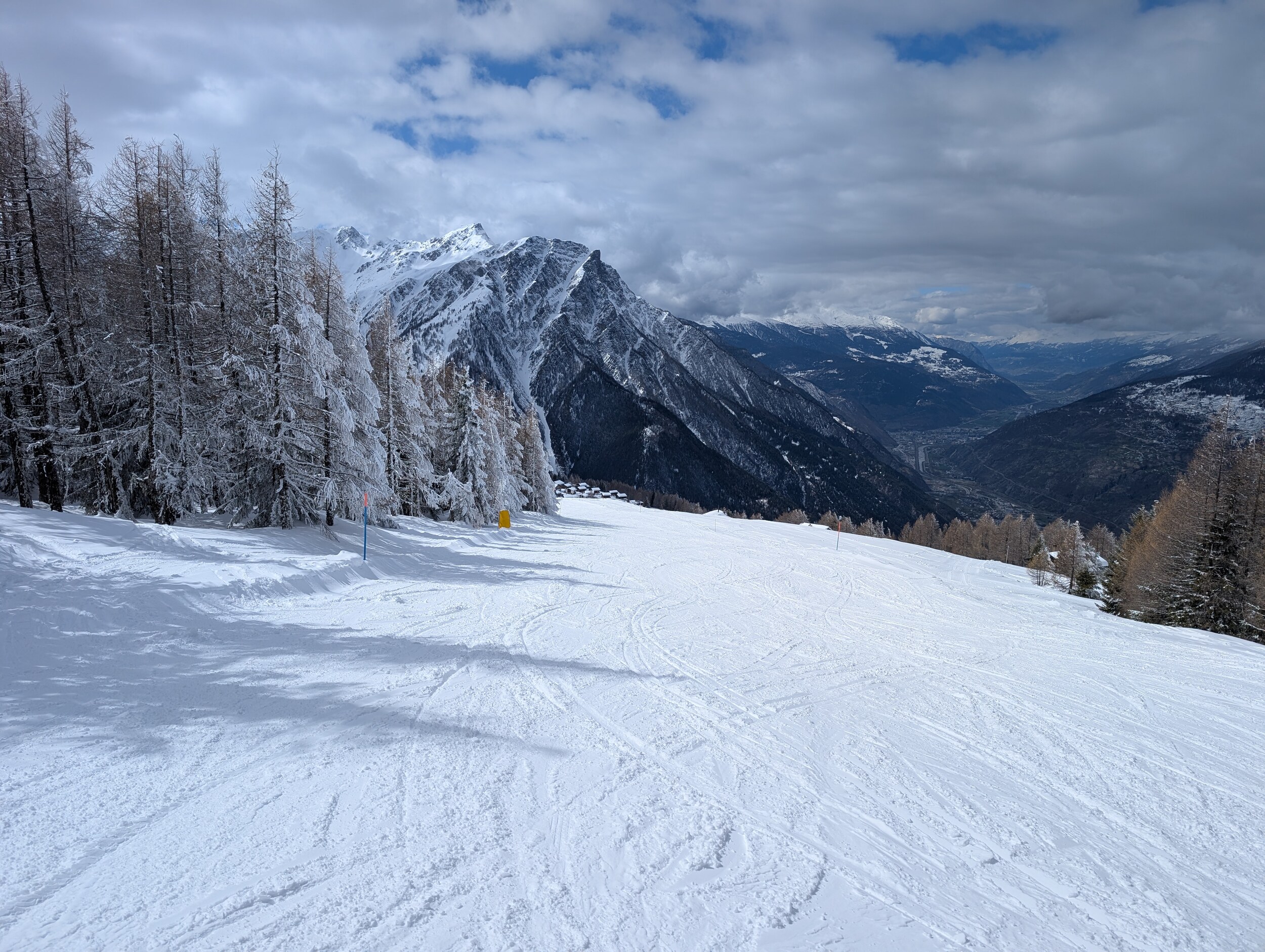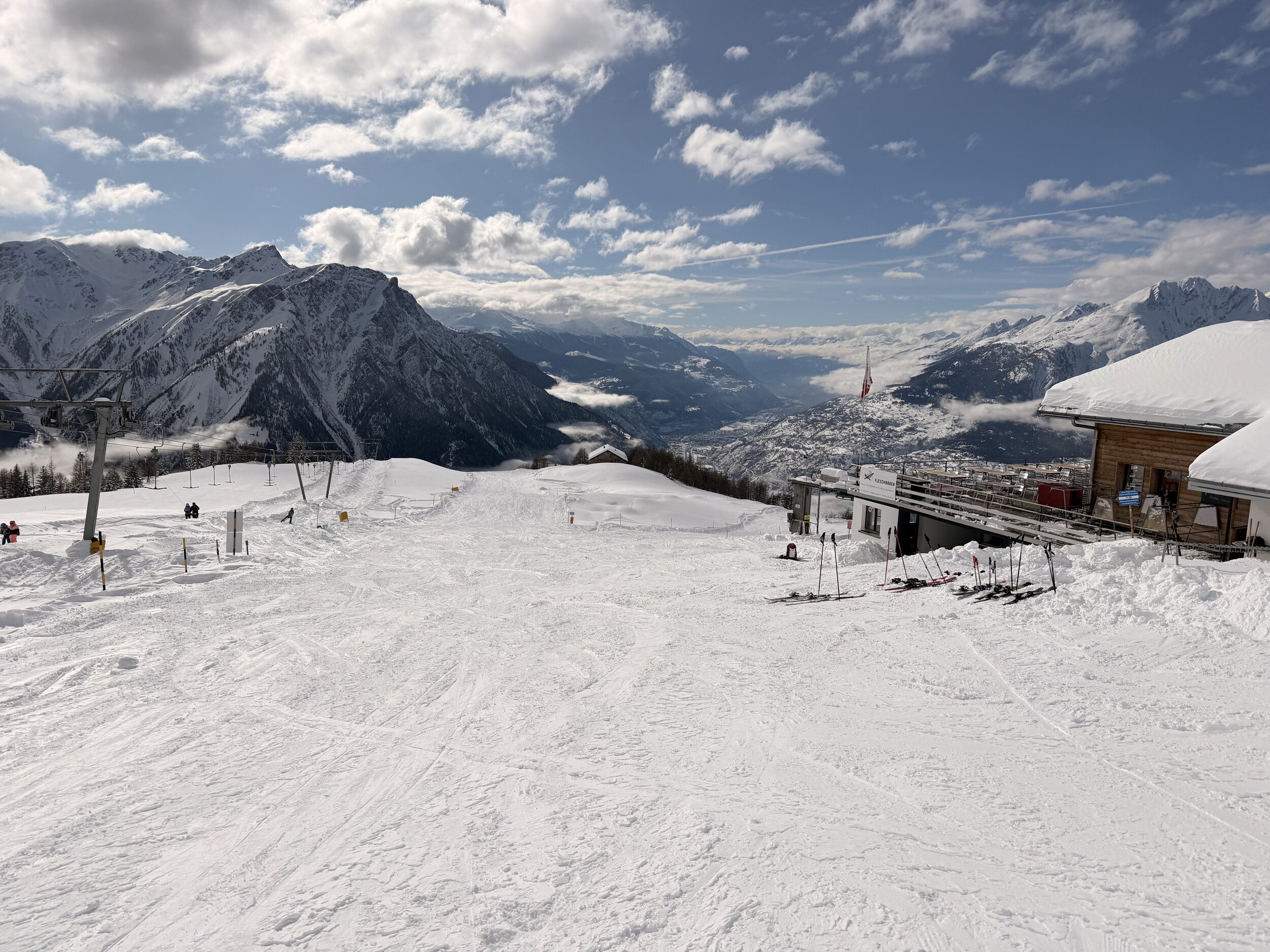 Gestern konnte ich mich morgens nicht entscheiden, ob ich auf die Piste möchte. Erst spät habe ich mich dann doch noch auf den Weg gemacht, sodass ich um 11:40 Uhr an der Talstation in Ried-Brig eintraf. Im Gegensatz zu den anderen kleinen Skigebieten rund um Visp und Brig ist hier noch bis Ostermontag Betrieb. Schneemässig wird das auch überhaupt kein Problem sein. Die Pisten sind tiefwinterlich gut in Schuss. Auf den besonders steilen Abschnitten ist es teilweise etwas eisig. Der Andrang war gestern Nachmittag sehr überschaubar und damit die Verhältnisse trotz spätem Start und etwas Neuschnee noch super. Nach 4 Stunden liess ich es dann bleiben und machte mich auf den Rückweg. So ganz ohne Sitzmöglichkeiten und mit den steilen Bügelliften wird es doch ziemlich anstrengend, gerade wenn man alleine unterwegs ist.