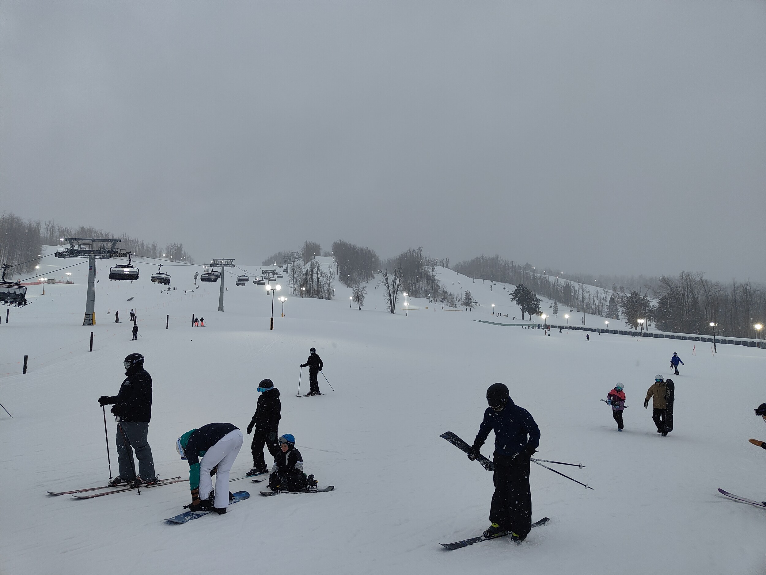 Ohio hat 6 Skigebiete. Eines davon hat weniger Höhenmeter als Alpine Valley. Aus mehreren Gründen ist Alpine Valley dennoch perfekt: Es liegt mehr oder weniger auf dem Weg und es ist auf dem Epic Day-Pass, was das Gebiet zum Schnäppchen macht. Die Sonne ist um 17.15 Uhr gerade untergegangen, die Stimmung ist sehr friedlich und die Farben sind winterschön. Das Gebiet hat drei Lifte, zwei davon erschliessen leichte Pisten, und einer ist noch einfacher. Schwierig sind die Temperaturen: -16°C.