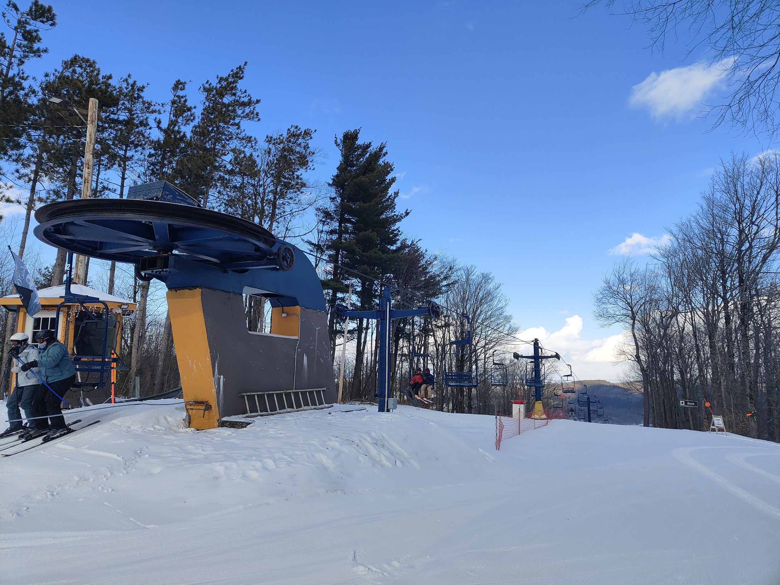 Der Tag beginnt mit milden Minus 2°C und Sonnenschein in Ithaca. Nach einer kurzen Fahrt erreiche ich Greek Peak. Auf dem Sessellift denke ich: Ithaca ist doch auch griechisch (die Insel, auf der Odysseus zu, hat das einen Bezug? Und siehe da: Der Name des Skigebiets ist eine Referenz an die vielen Ortschaften in der Region, die griechische Namen tragen. Bei der Anfahrt zum Skigebiet kriege ich beinahe eine Halsstarre, so hoch hinauf geht der Sessellift! Nach den vielen Skigebieten in den letzten Tagen, die nur einen Drittel der Höhenmeter aufwiesen bauen sich diese 290 Höhenmeter massiv vor mir auf. Zum Vergleich; Das sind leicht mehr Höhenmeter als der Clünas und der Naluns in Scuol aufweisen.