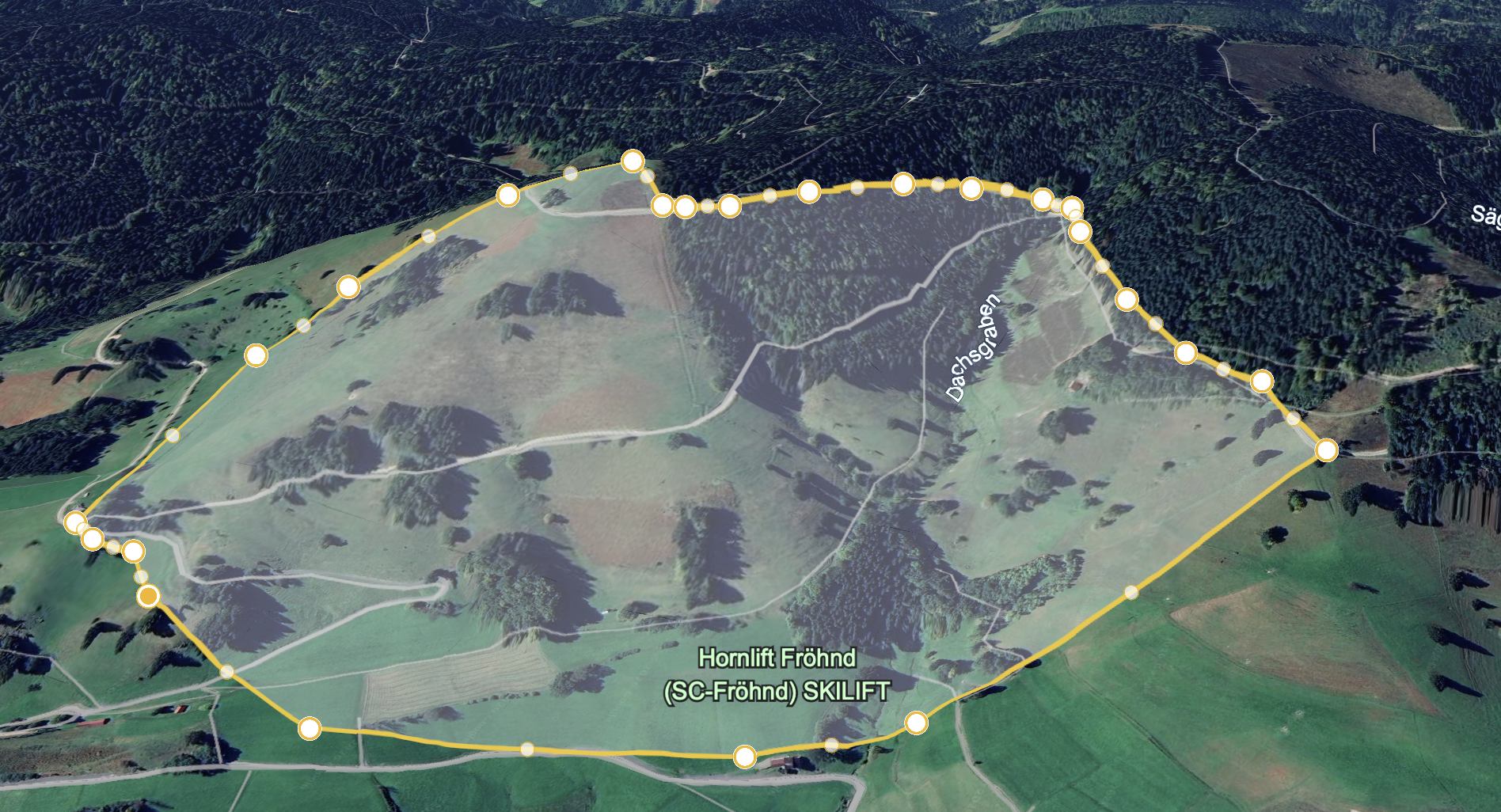 Zum Lift: Der Lift ist ca. 850 Meter lang (online findet man auch andere Angaben, 850 m sagt Google Earth) und macht dabei knapp 300 Höhenmeter. Damit erreicht er eine mittlere Steigung von 35,3 %. Ich konnte keinen Lift im Schwarzwald finden, der eine höhere Steigung aufweist. Der 2er-Sessel Weltcup, Kandelblick und Aftersteg kamen beide mit etwas mehr als 33 % mittlerer Steigung knapp an den Hornlift heran (das sind meine Ergebnisse aus einer kurzen Internetrecherche und nicht empirisch belastbar), wobei zwei von den Liften deutlich kürzer sind als der Hornlift. In Summe lässt sich festhalten: lang, steil und viel Fläche. Die Fläche wollte ich ebenfalls nachprüfen und habe einmal die gesamte fahrbare Fläche mithilfe von Google Earth bestimmt. Ich kam auf unglaubliche 660.000 m^2. Zudem gibt es auch eine Flutlichtanlage.