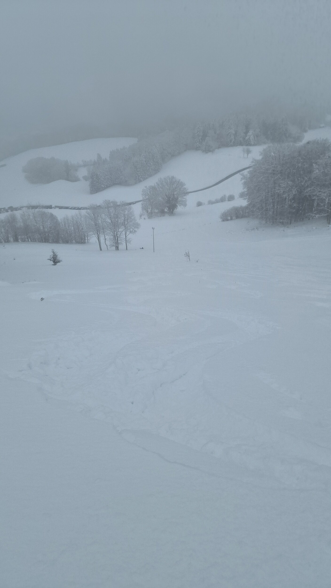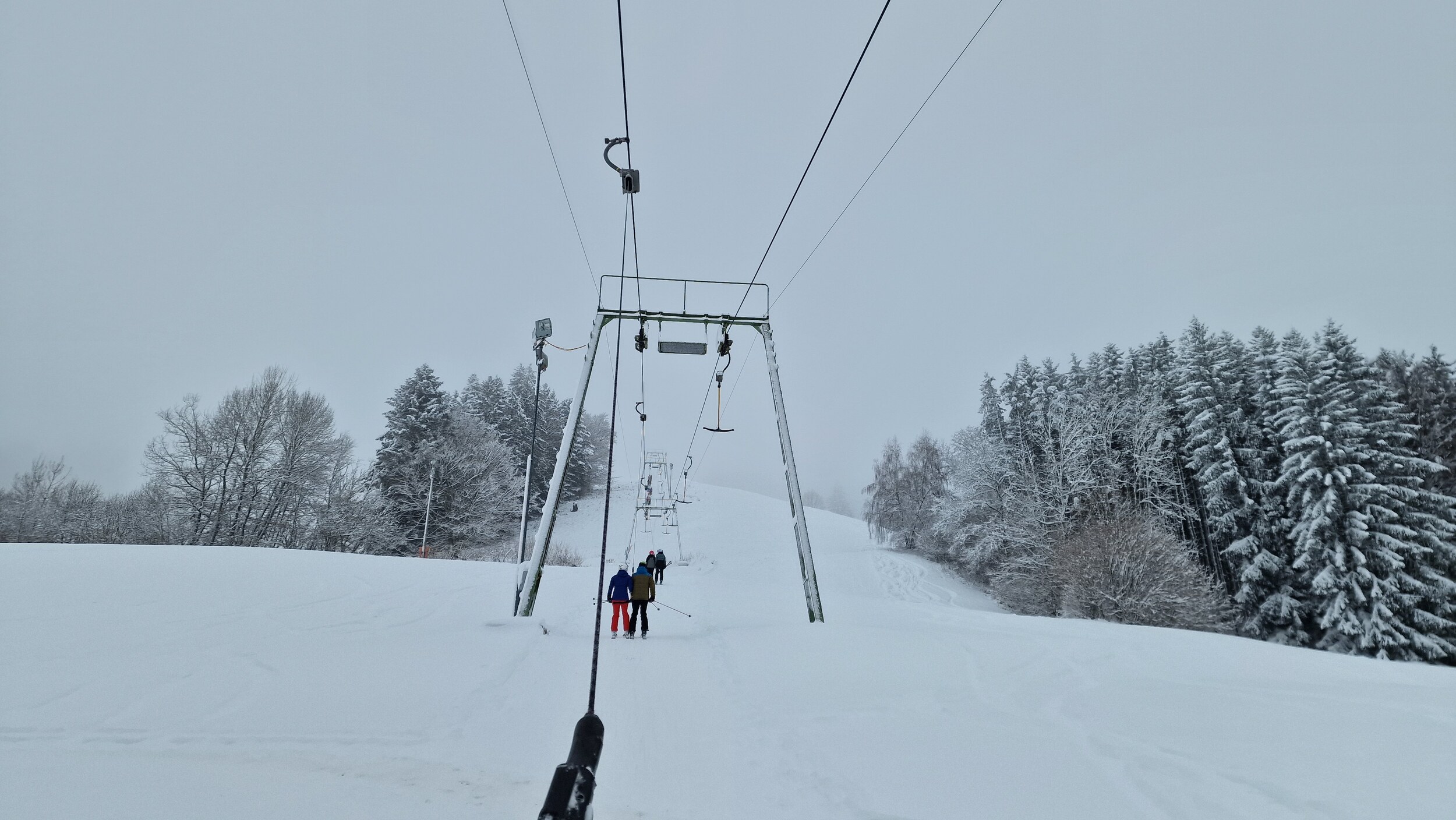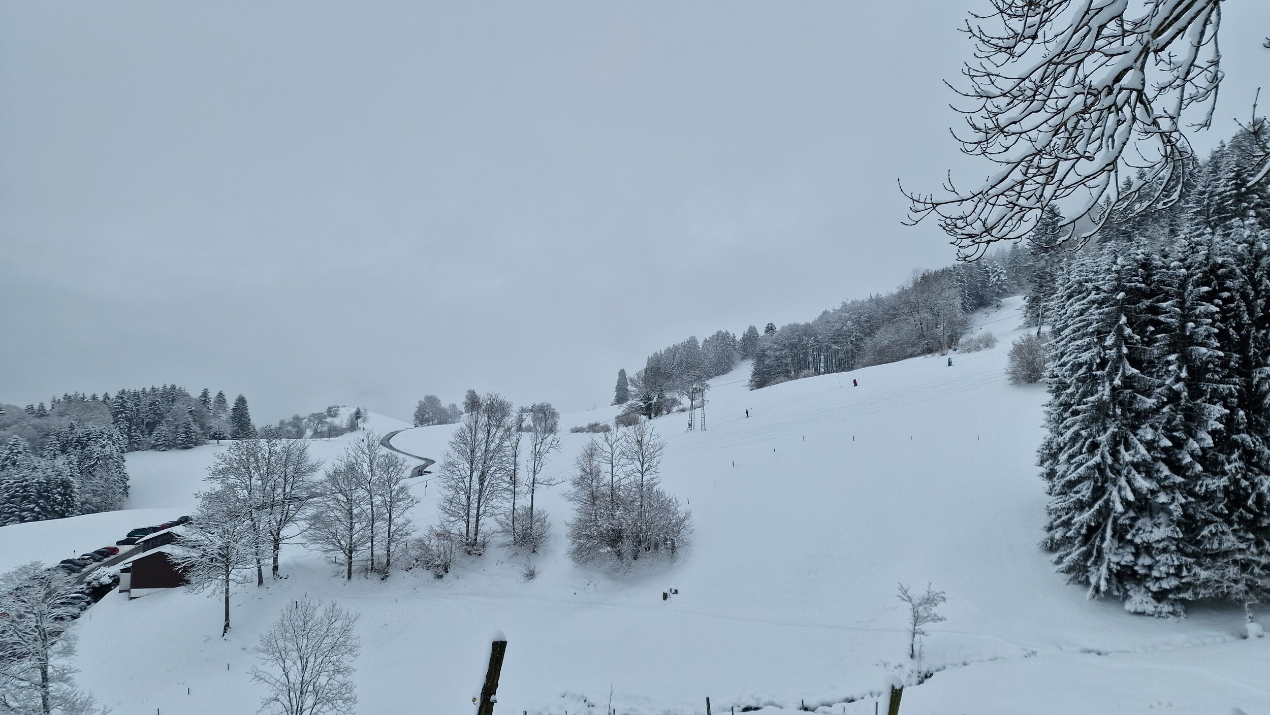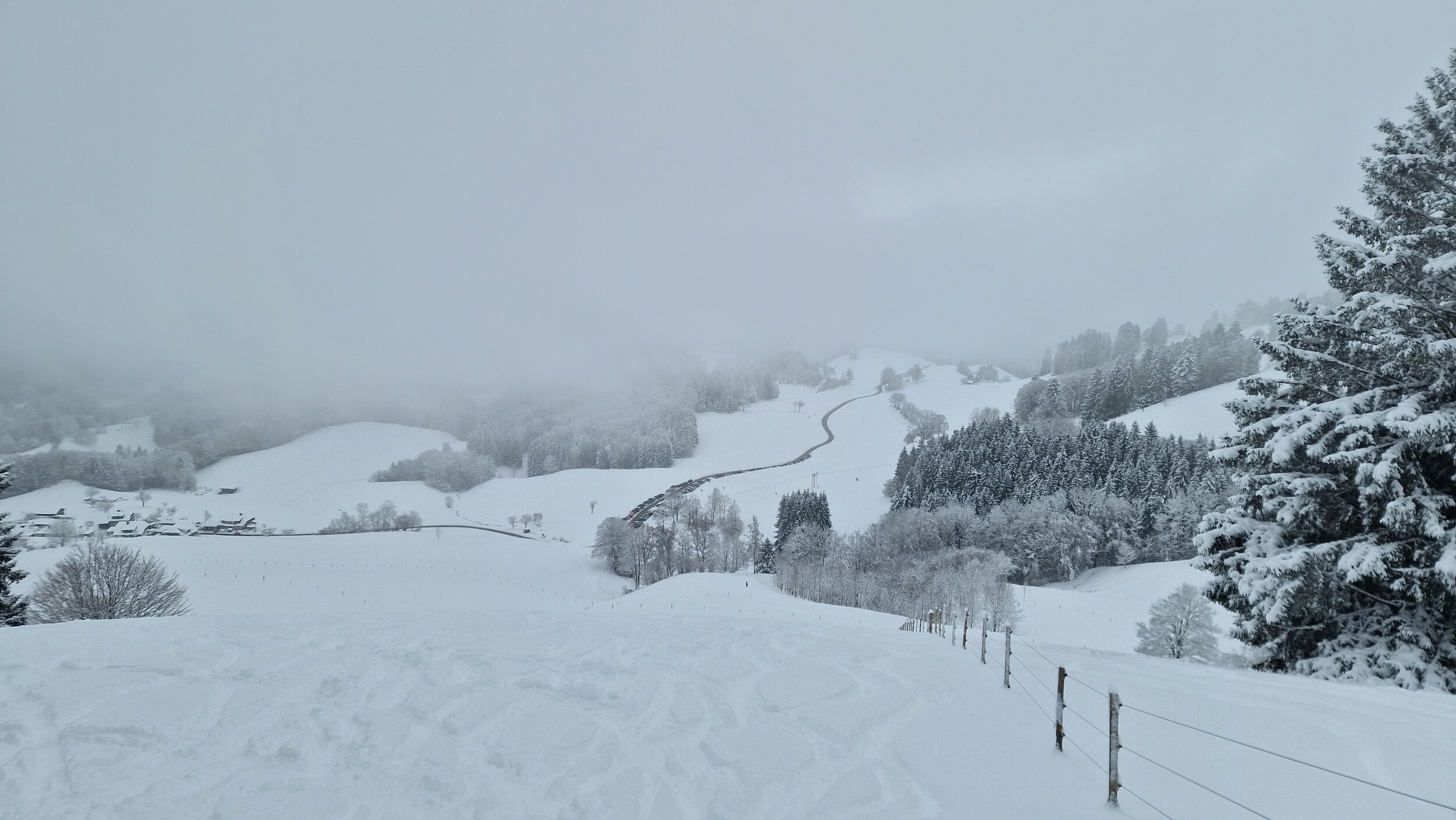 Fazit: Ich kenne keinen Schlepplift im Schwarzwald, der einem eine solch große Fläche erschließt. Die Varianten an diesem Hang sind schier grenzenlos und das alles in einem durchaus anspruchsvollen Gelände. Man hat zwar einen Sponsor im Rücken, doch bei der niedrigen Höhe und dem hohen Anteil an ehrenamtlicher Arbeit wird dieser Lift wohl kaum noch ewig seine Runden drehen können. Daher: Wenn der Hornlift läuft und ihr irgendwie die Möglichkeit habt, hinzukommen, macht es. Es ist ein Highlight. Die gesamte Fläche welche man vom Lift gut befahren kann. Am morgen noch Nebel (es war noch schlimmer, aber da hab ich keine Bilder gemacht) Tiefschnee Es war gut besucht, die meisten Bügel waren belegt. Man musste aber nie länger warten als 2 Bügel. Der Ziehweg durch den Wald Falls jemand eine Unterkunft sucht, bietet Ski in&out