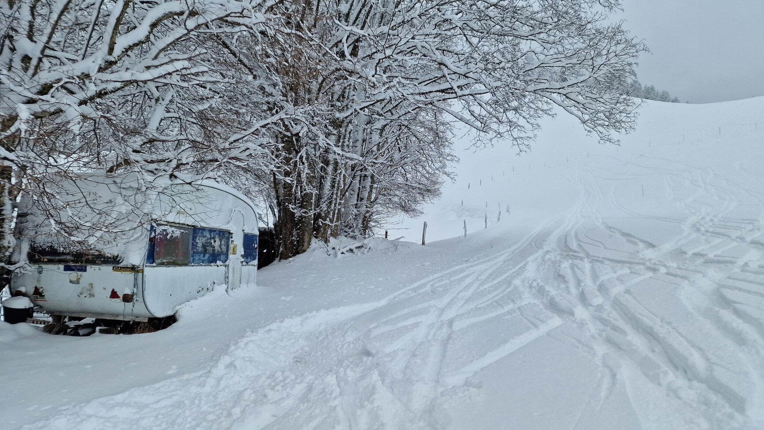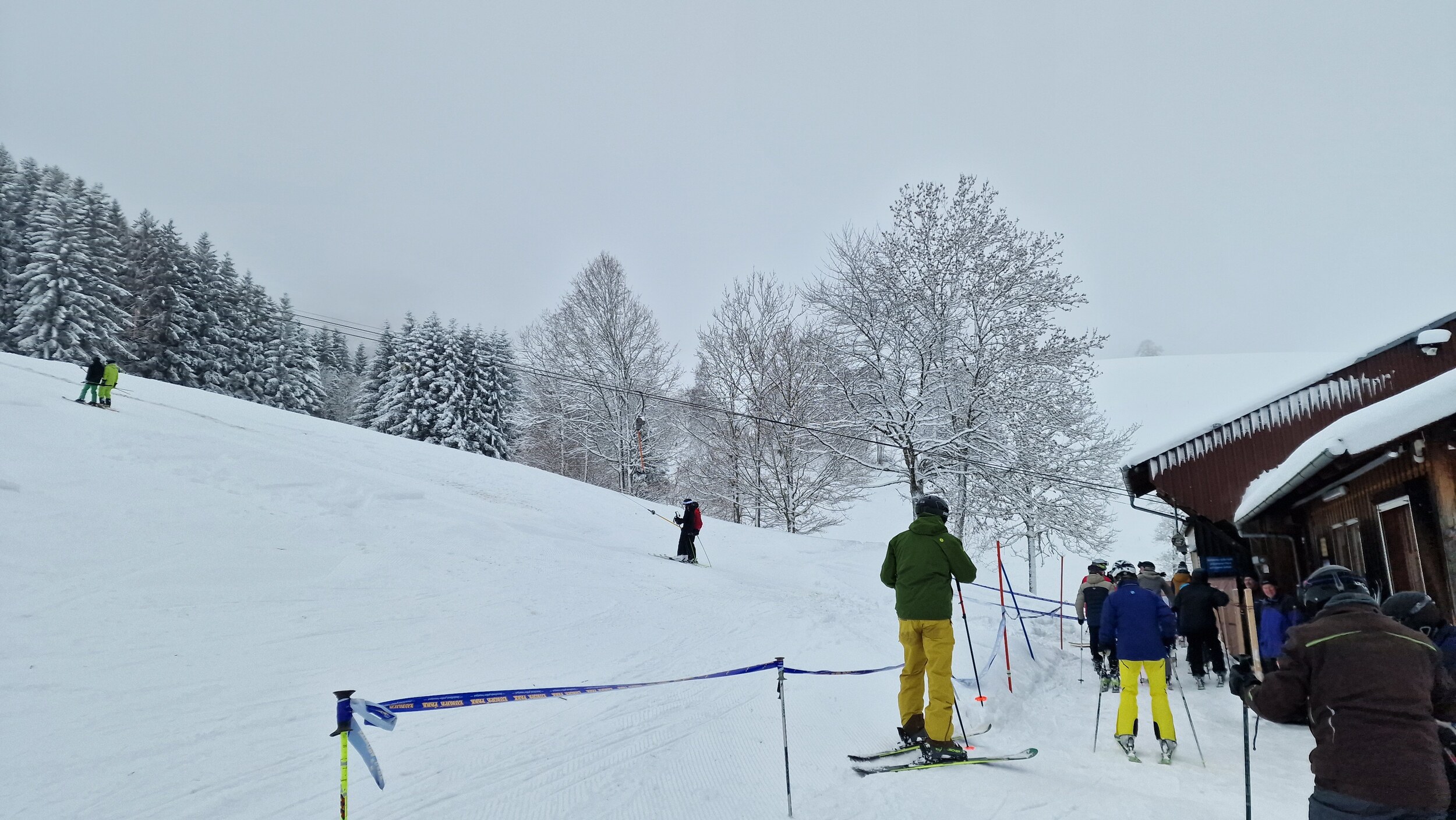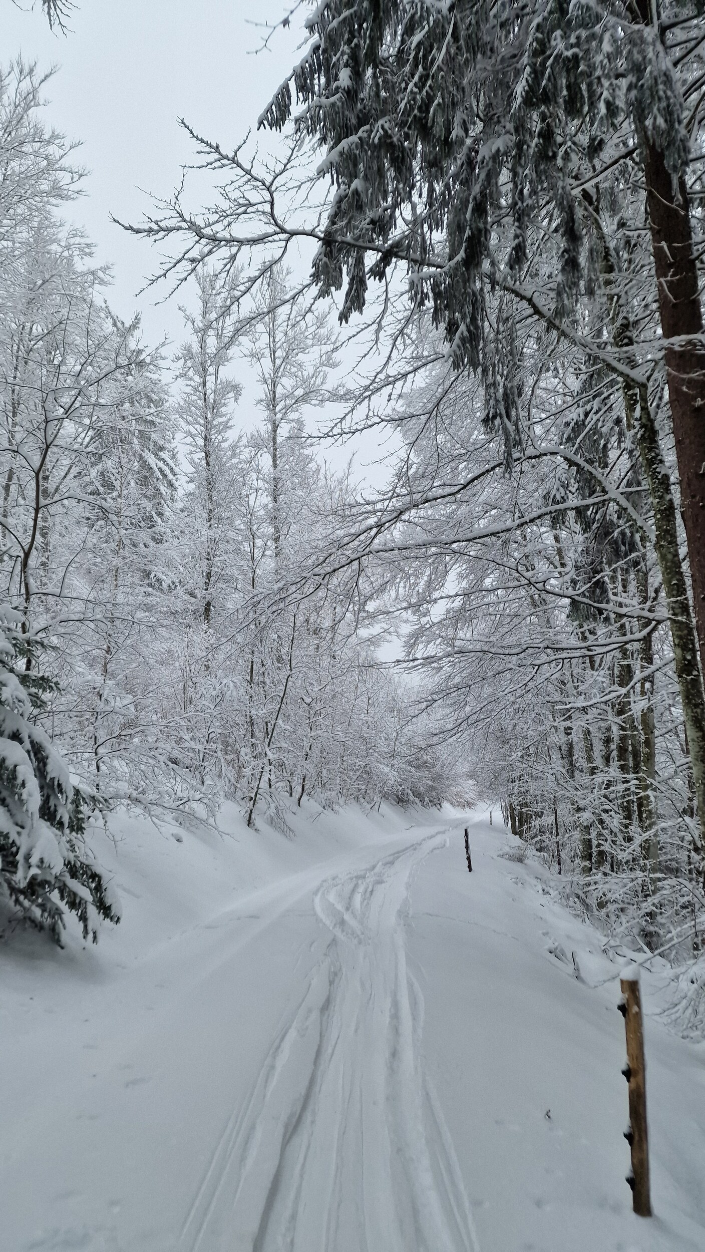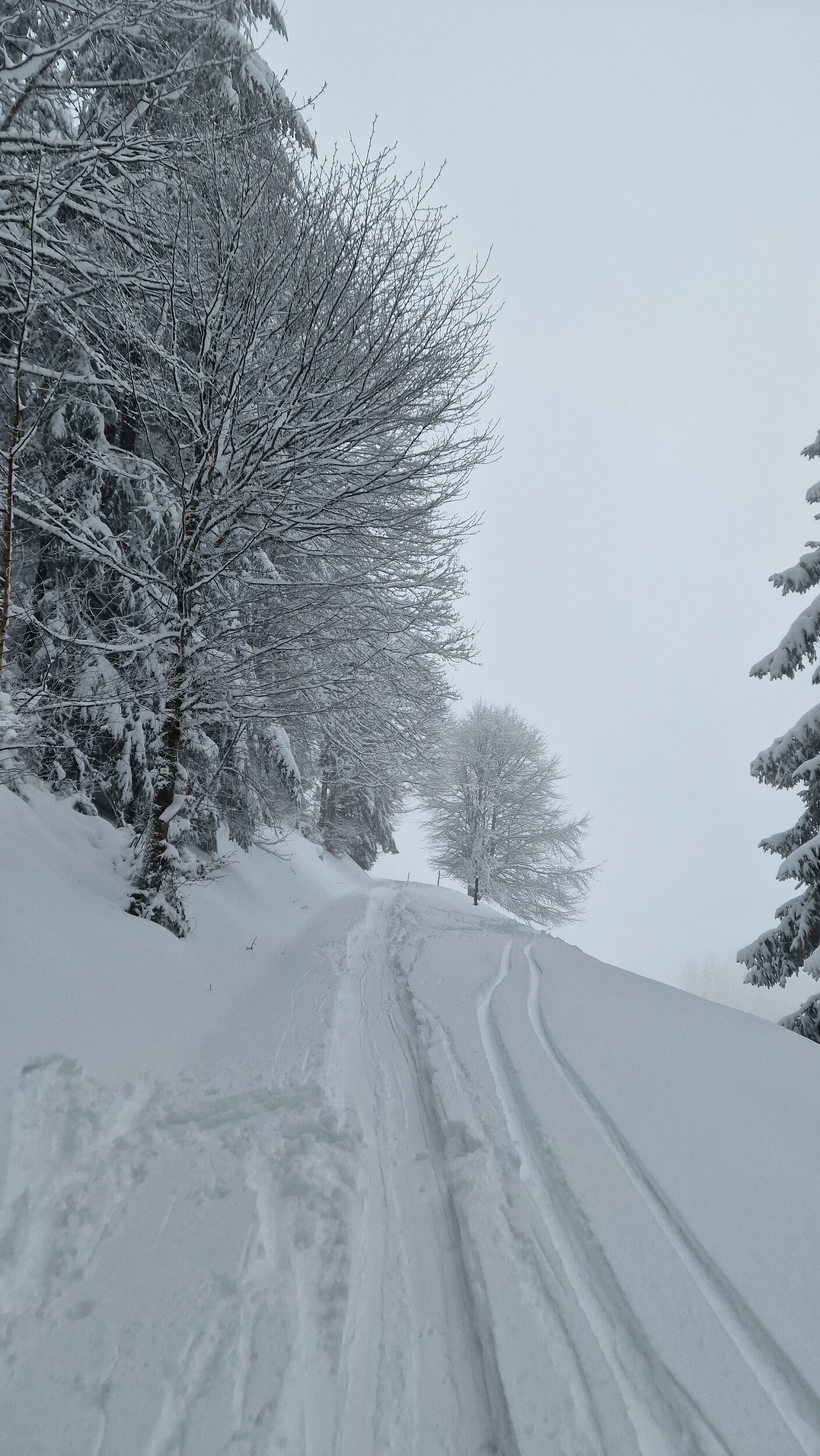 Fazit: Ich kenne keinen Schlepplift im Schwarzwald, der einem eine solch große Fläche erschließt. Die Varianten an diesem Hang sind schier grenzenlos und das alles in einem durchaus anspruchsvollen Gelände. Man hat zwar einen Sponsor im Rücken, doch bei der niedrigen Höhe und dem hohen Anteil an ehrenamtlicher Arbeit wird dieser Lift wohl kaum noch ewig seine Runden drehen können. Daher: Wenn der Hornlift läuft und ihr irgendwie die Möglichkeit habt, hinzukommen, macht es. Es ist ein Highlight. Die gesamte Fläche welche man vom Lift gut befahren kann. Am morgen noch Nebel (es war noch schlimmer, aber da hab ich keine Bilder gemacht) Tiefschnee Es war gut besucht, die meisten Bügel waren belegt. Man musste aber nie länger warten als 2 Bügel. Der Ziehweg durch den Wald Falls jemand eine Unterkunft sucht, bietet Ski in&out