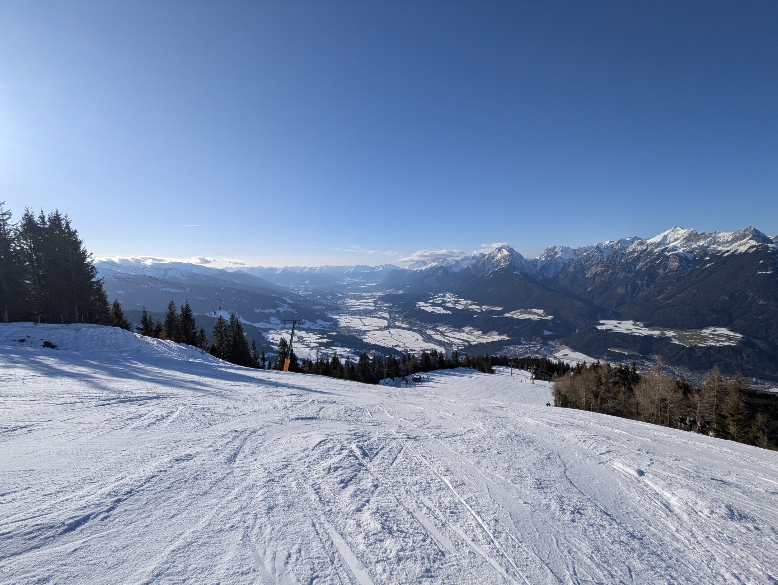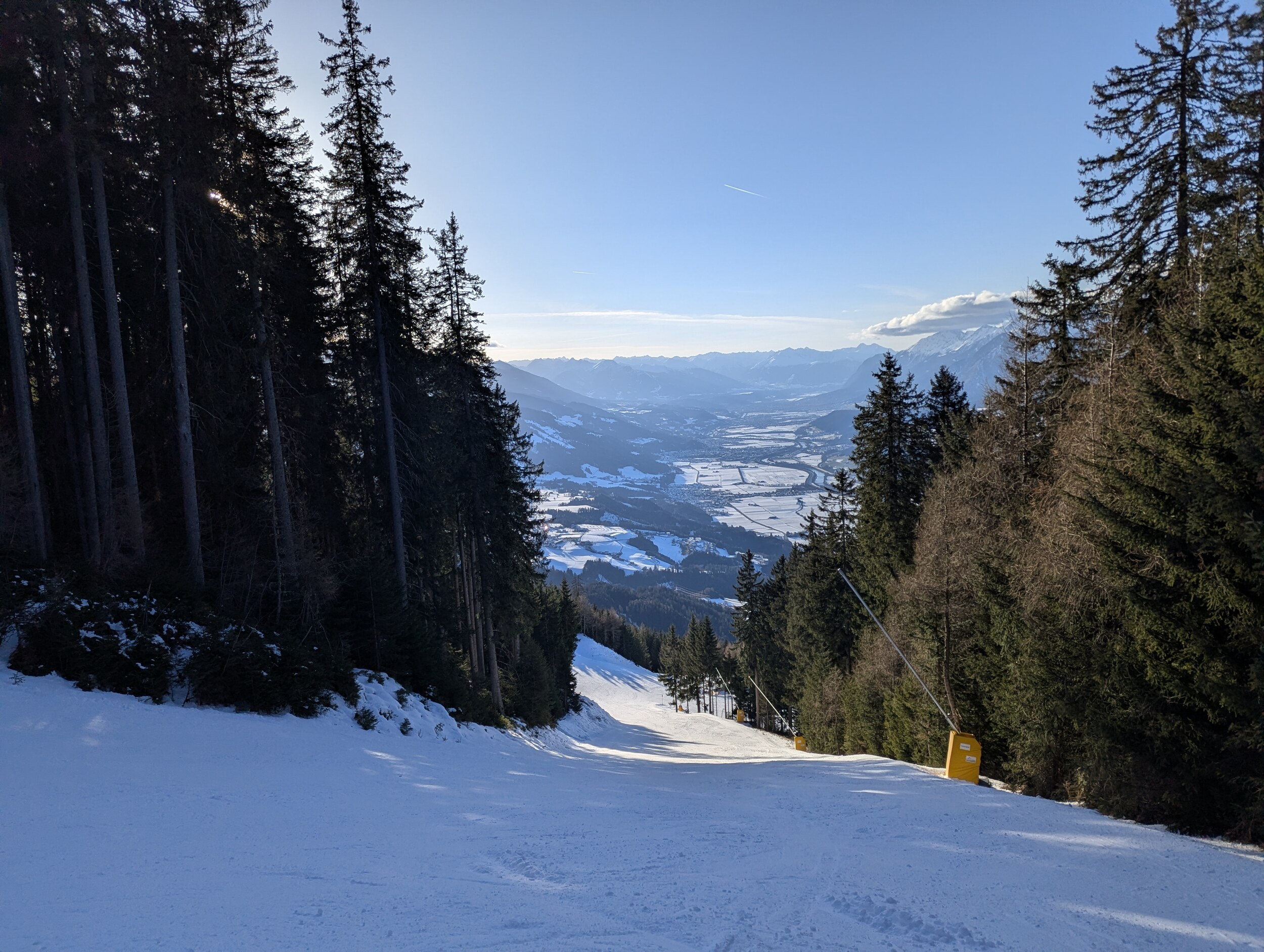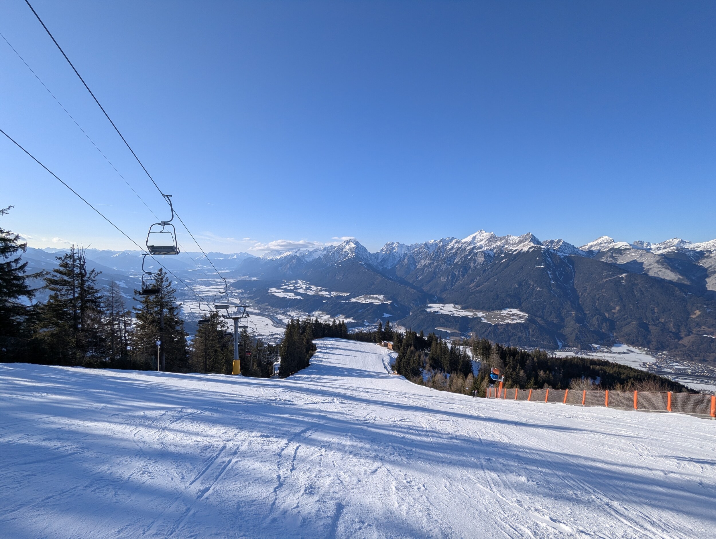 Nach der Einzelliftesafari nun zum Abschluss noch am Kellerjoch, hier war ich schon ein paar Jahre nicht mehr. Seitdem wurde ein Speicherteich gebaut und gut in die Beschneiung investiert. Leider gibt es aber auch den ESL in der ehemaligen zweiten Sektion nicht mehr, sodass es doch eine ziemlich langwierige Fahrt bergauf ist.