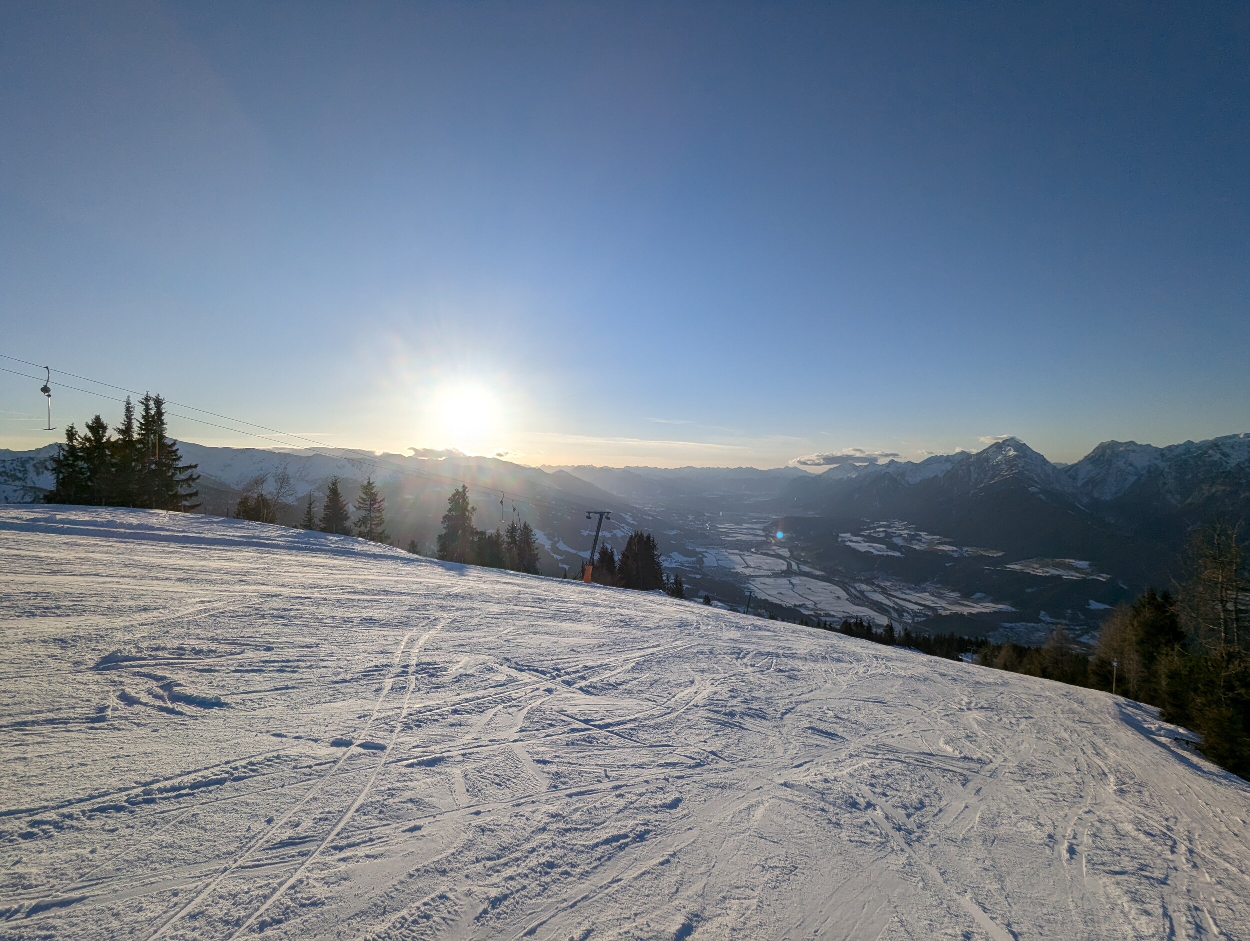 Schöne Stimmung auf den letzten Abfahrten, Pisten hielten gut, beide Varianten machten bis zum Ende Spaß. Dem Schnee in Inntal konnte man durch den Föhn beim Schmelzen zusehen.