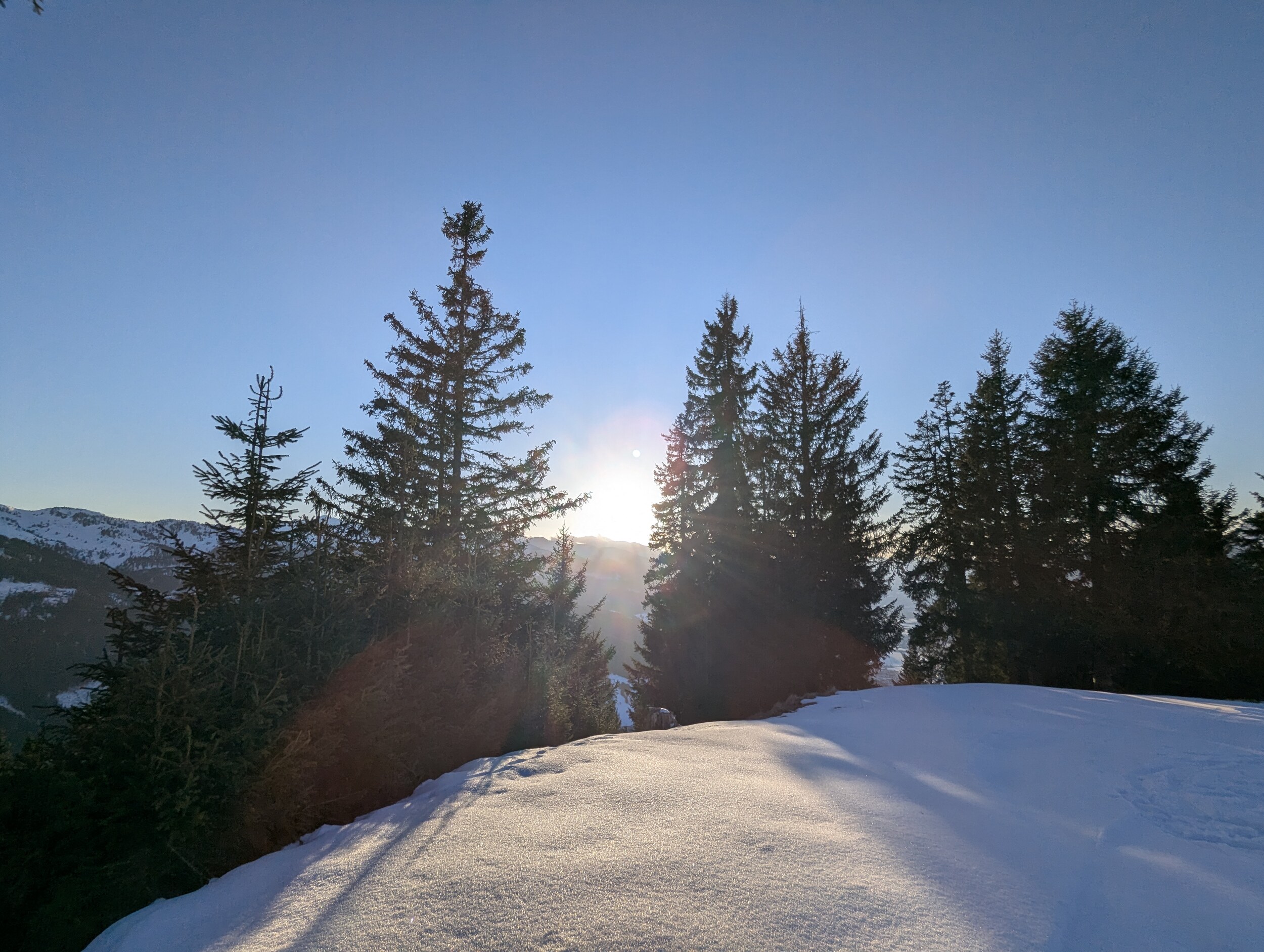 Los ist nicht viel, mehr Tourengeher als Skifahrer, immer direkt in den Lift. Westlich geneigte Hänge firnen leicht auf.