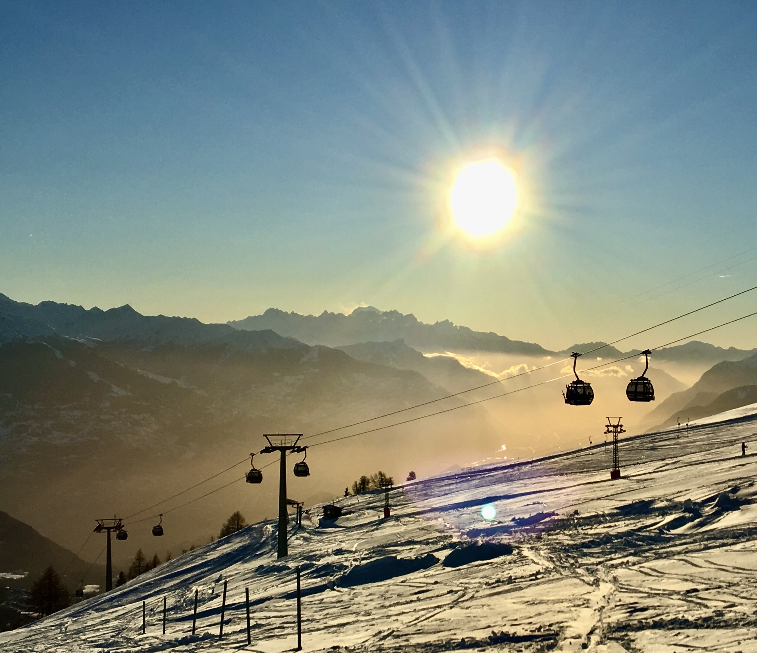 Blick zurück. Das Gebiet besteht aus einer Luftseilbahn, einer 3SB, einem Skilift sowie einem Kinderland und Übungshang.