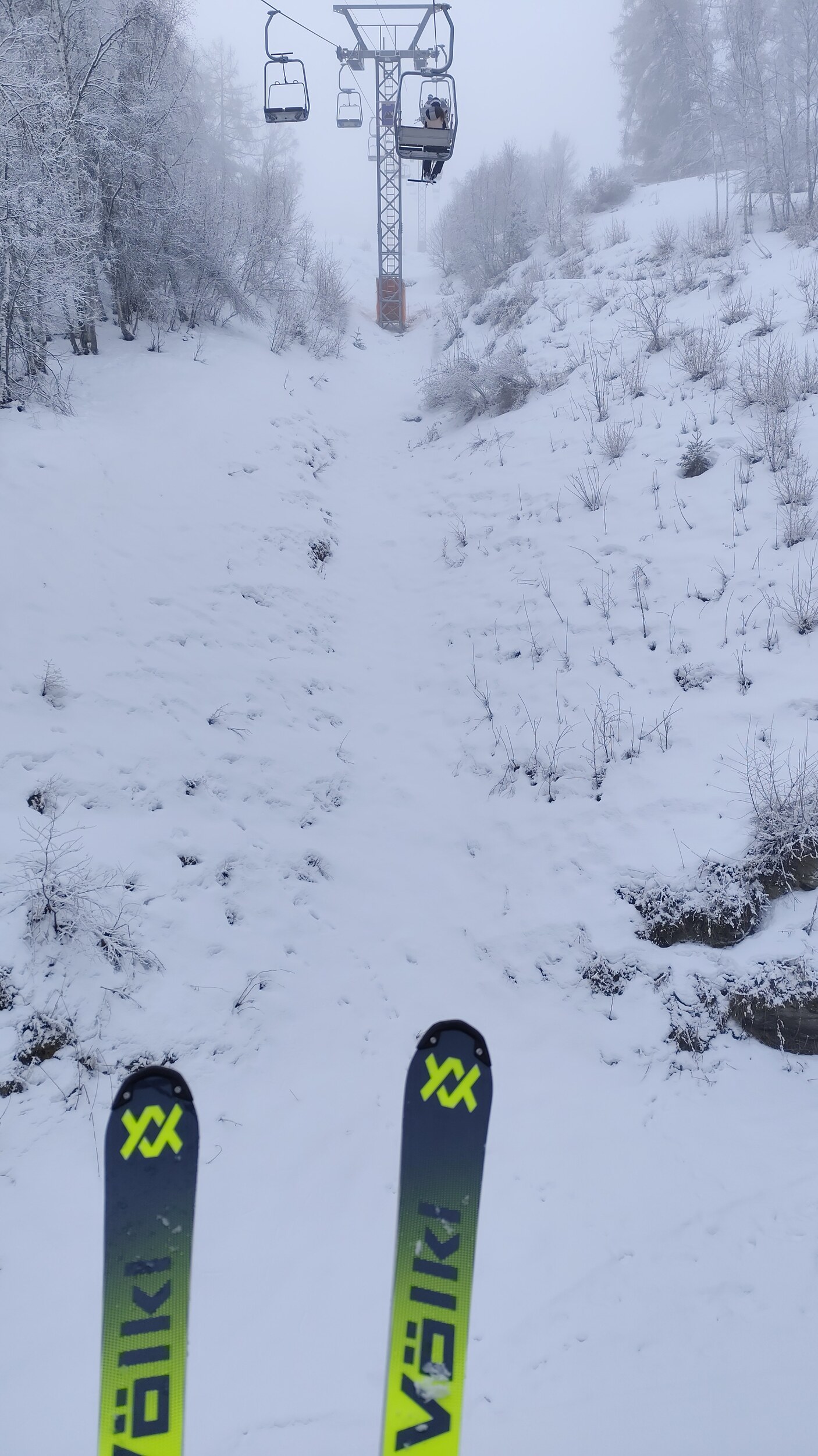 Danach bin ich nach Eischoll gefahren, um 2-3 Abfahrten zu machen (Verbindung zwischen Eischoll und Unterbäch ist geschlossen). Nur der Sessellift und die rote Talabfahrt sind geöffnet. Es war fast niemand da. Es war Nachmittag und der Schnee war bereits weich. Das Skifahren war ziemlich gut, aber es fehlt wirklich Schnee (überall viele braune Spuren)... Aber keine Steine.