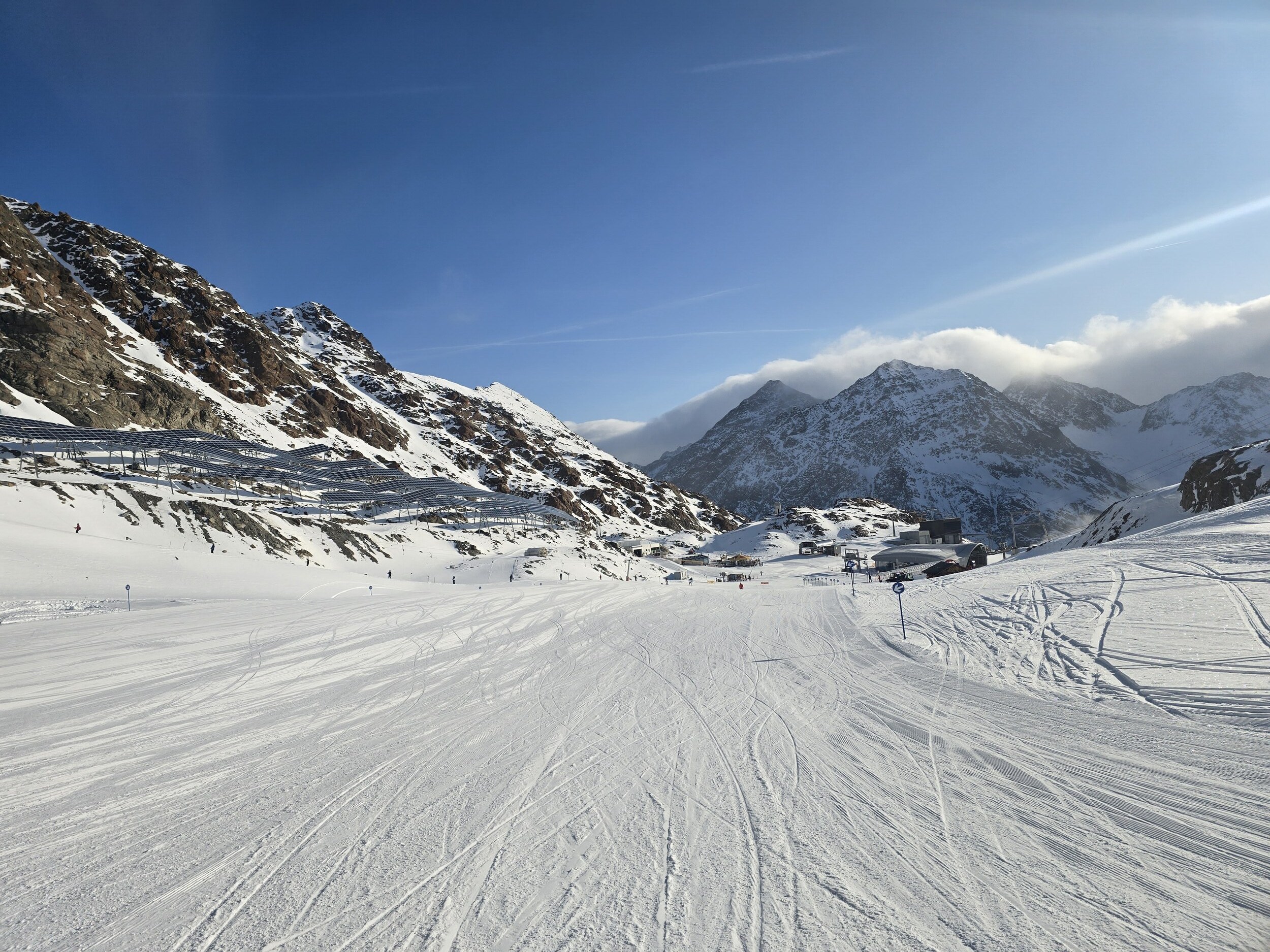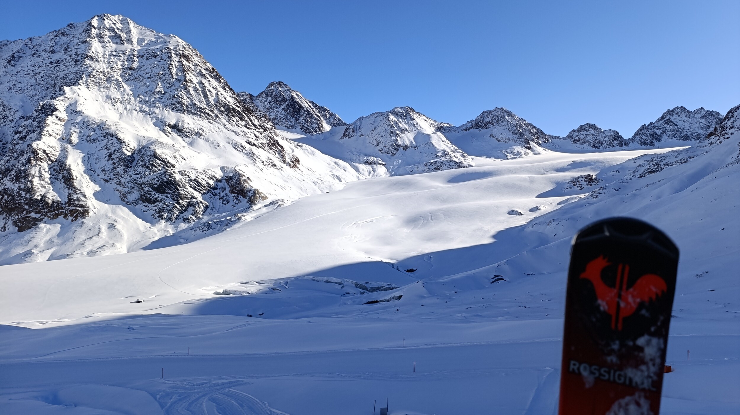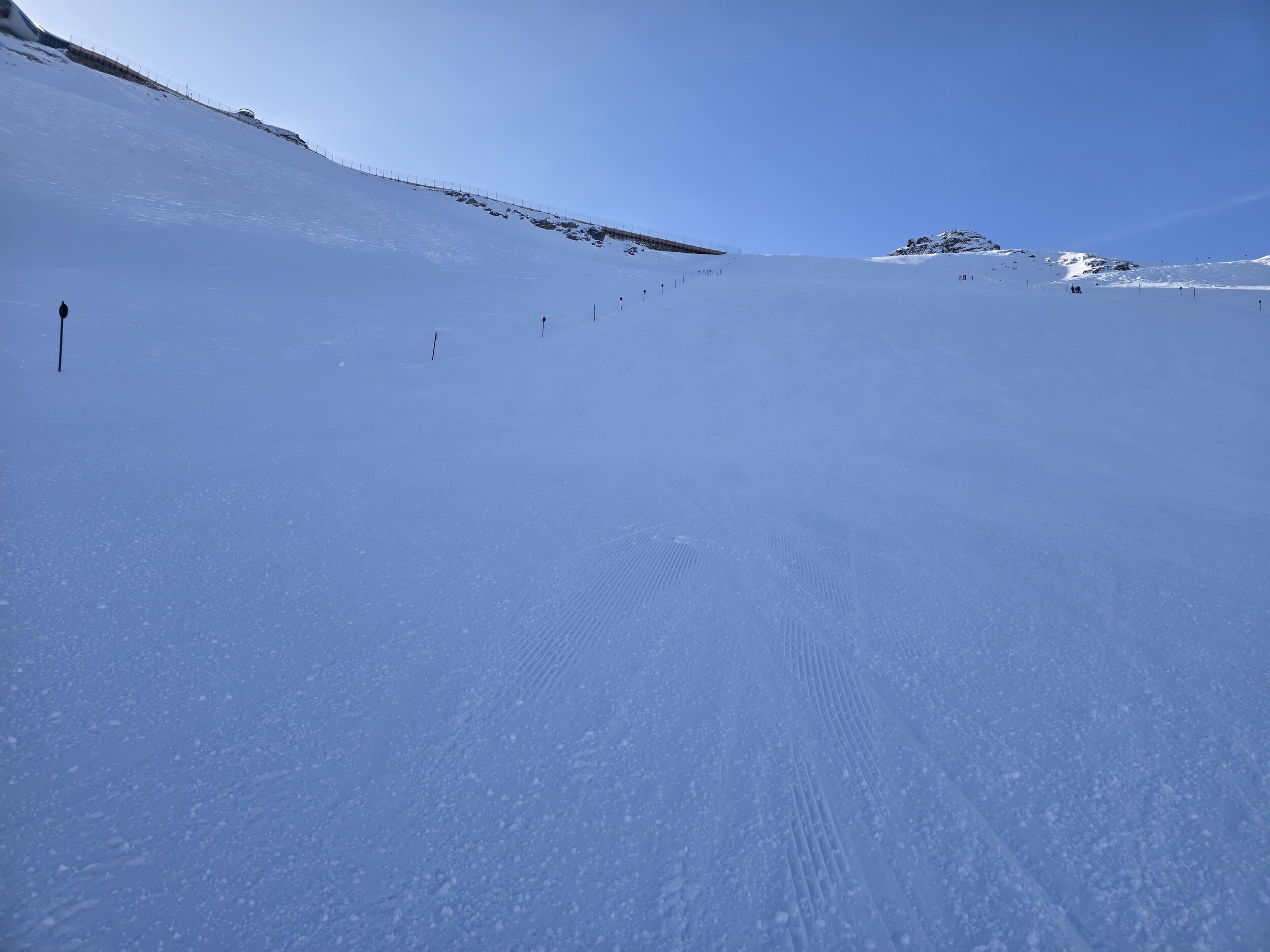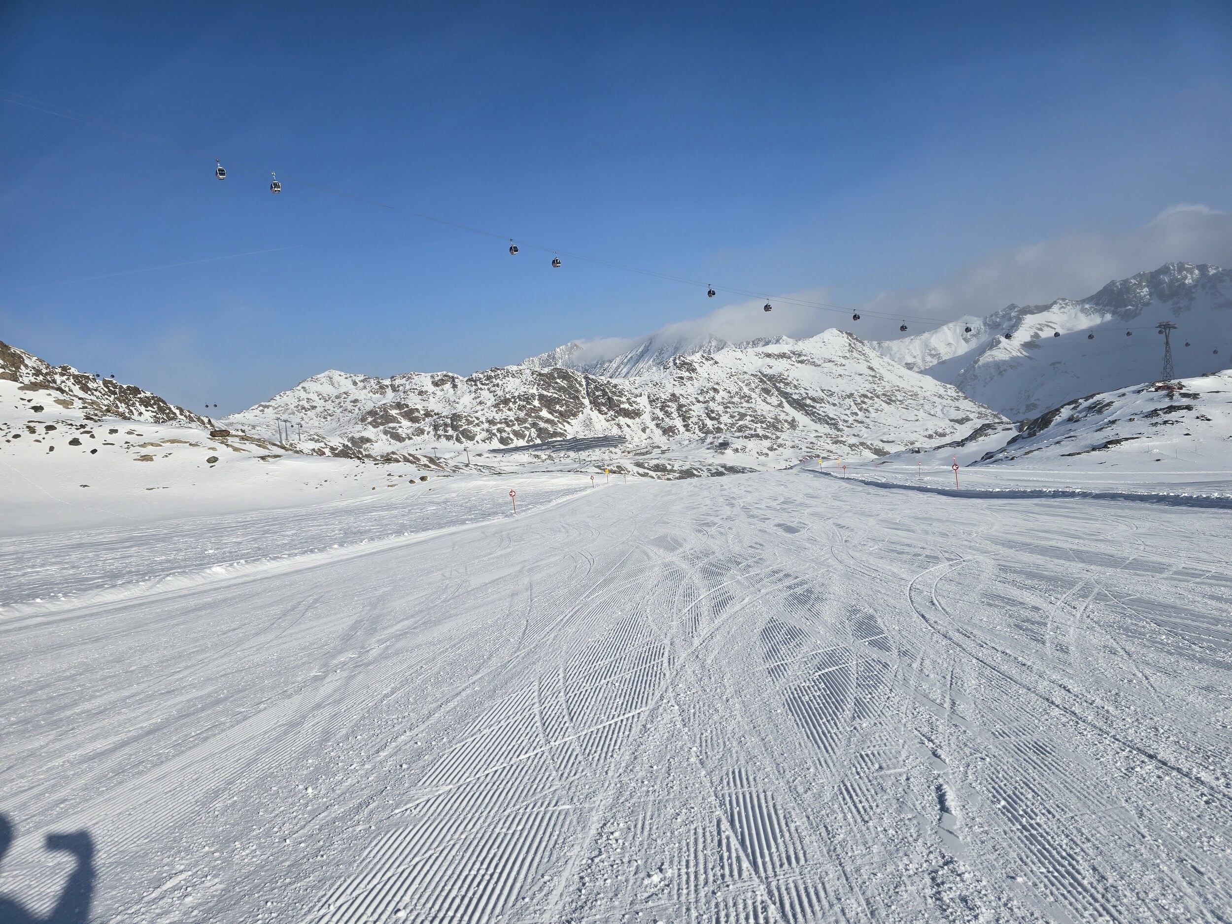 Am rifflsee ist natürlich leer, die Pisten dort halt auch zum vergessen aktuell. Am Gletscher sind die Pisten perfekt gewalzt aber noch ziemlich weich. Gut dass ich bei der Talstation vorbei gefahren bin und vom Slalom Rennski auf die all mountain gewechselt bin. Selbst mit 90er Mittelbreite fast Bootout. Mit schmalen Ski ist man heute falsch hier....