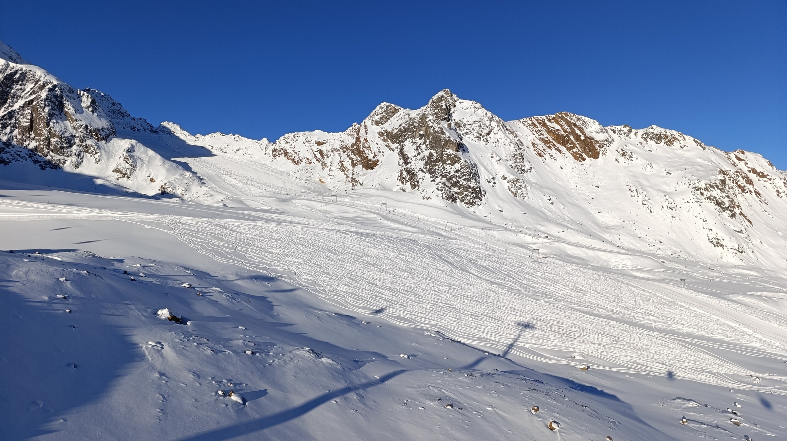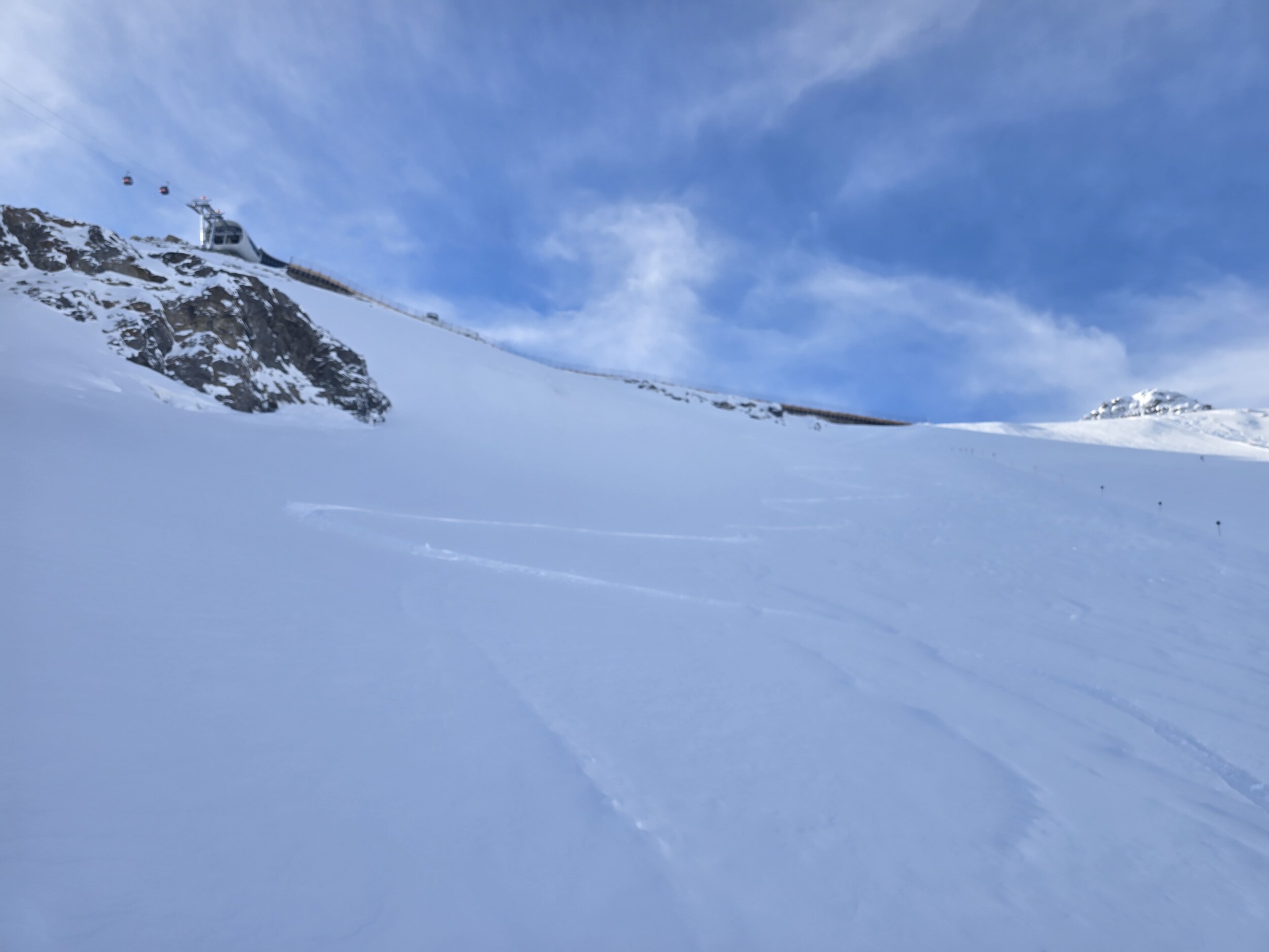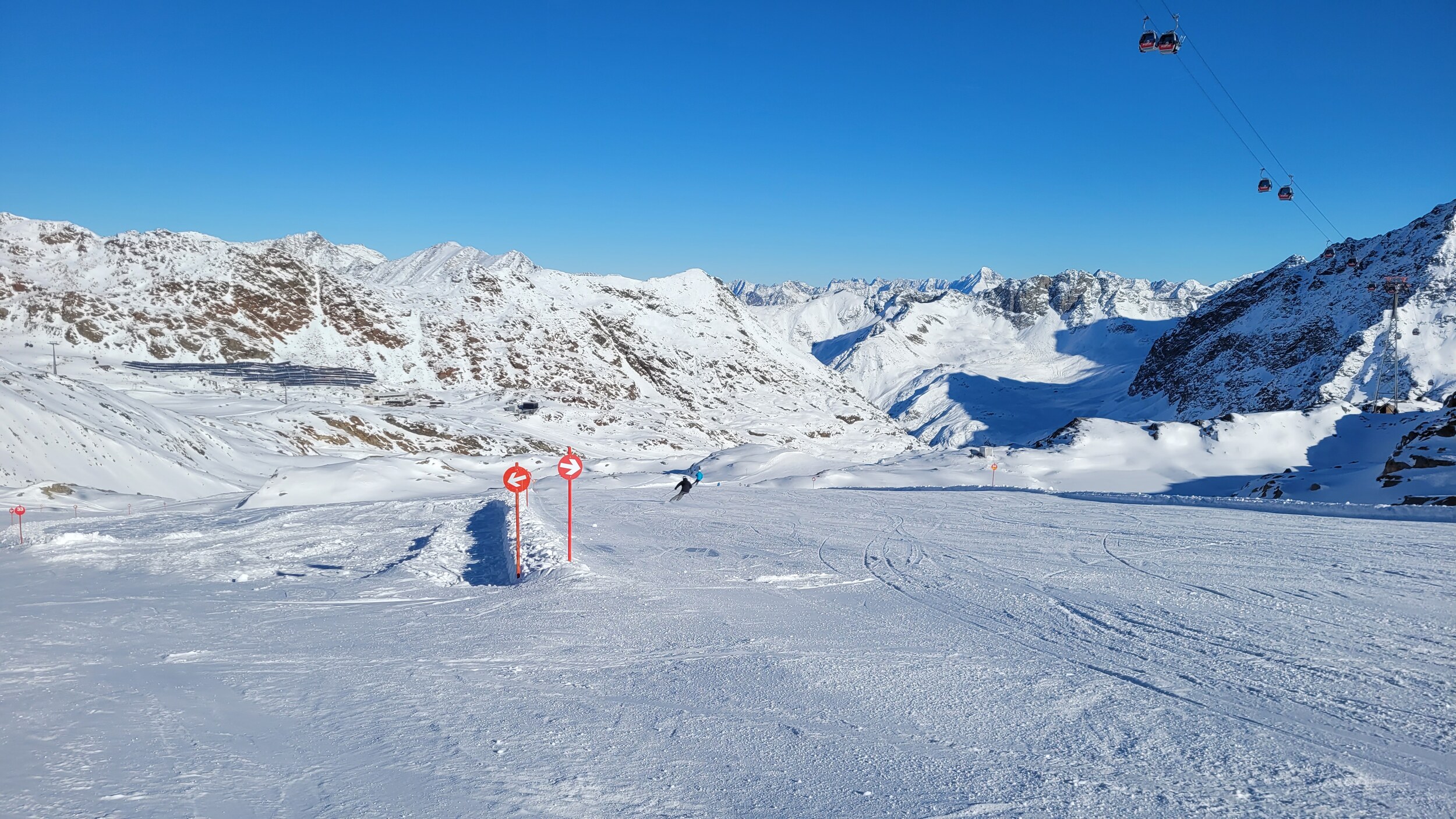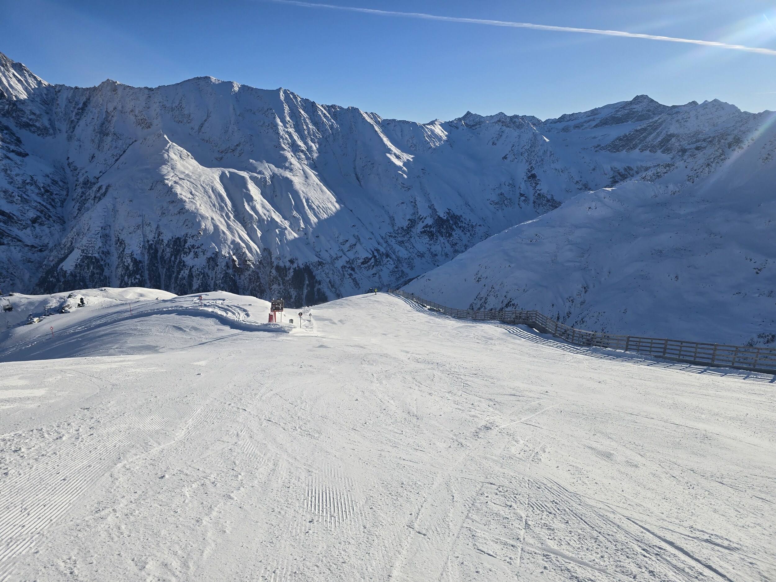 Am rifflsee ist natürlich leer, die Pisten dort halt auch zum vergessen aktuell. Am Gletscher sind die Pisten perfekt gewalzt aber noch ziemlich weich. Gut dass ich bei der Talstation vorbei gefahren bin und vom Slalom Rennski auf die all mountain gewechselt bin. Selbst mit 90er Mittelbreite fast Bootout. Mit schmalen Ski ist man heute falsch hier....