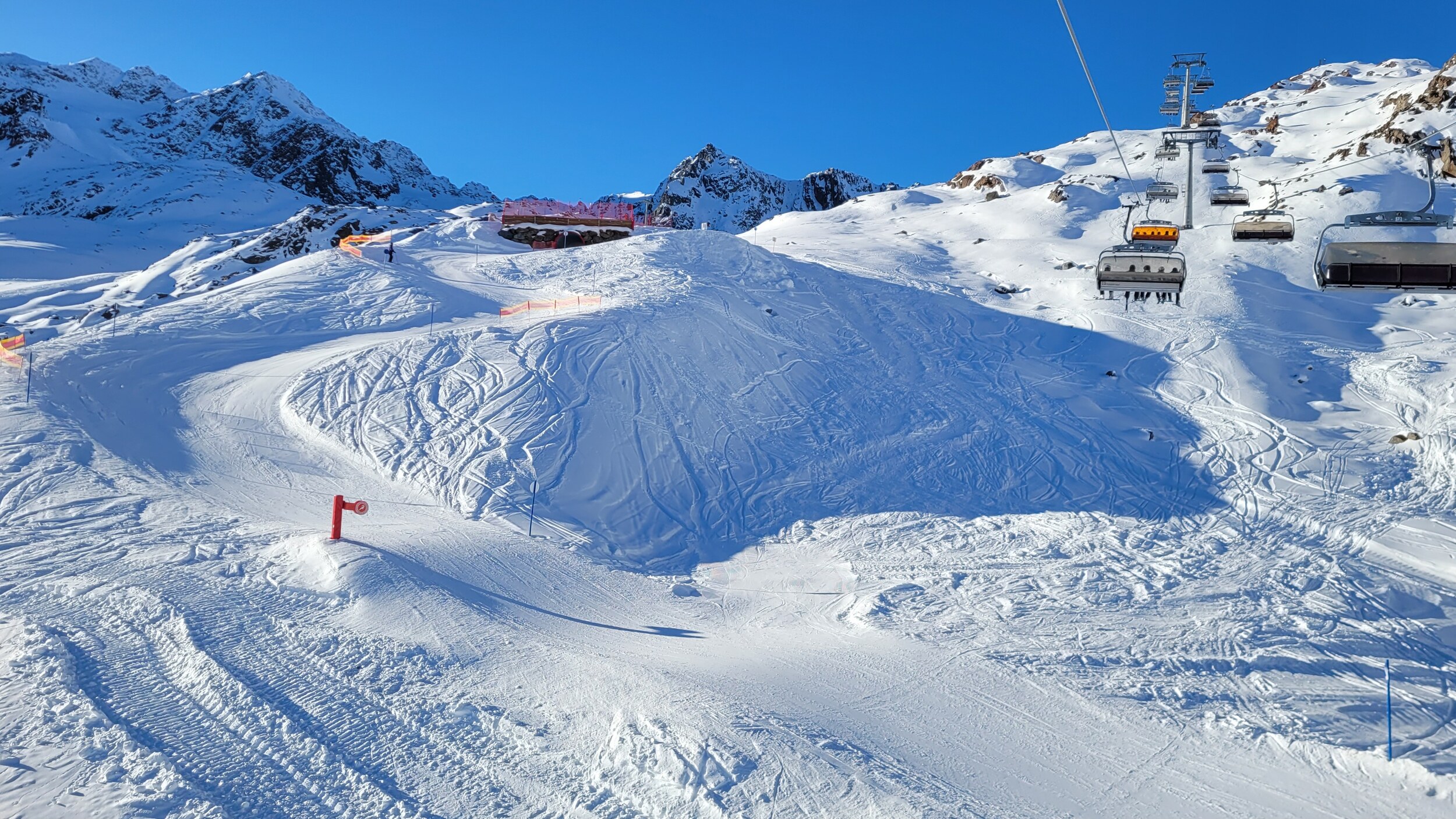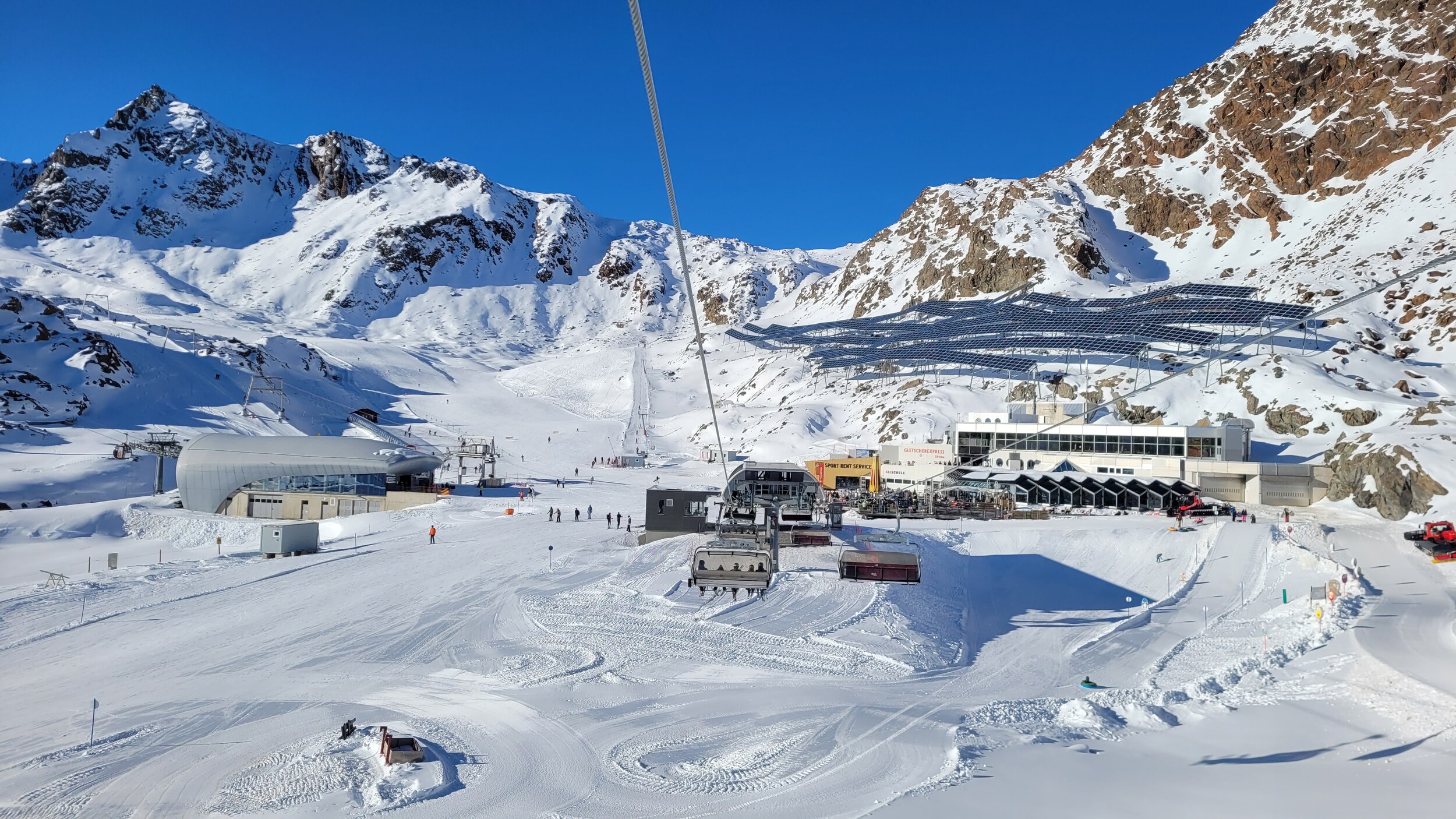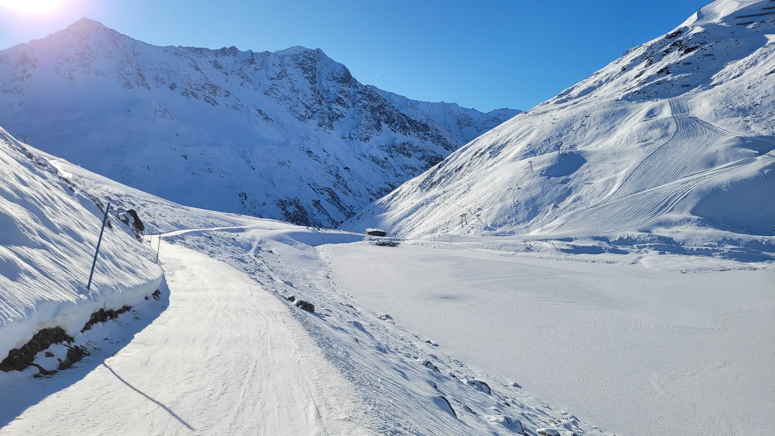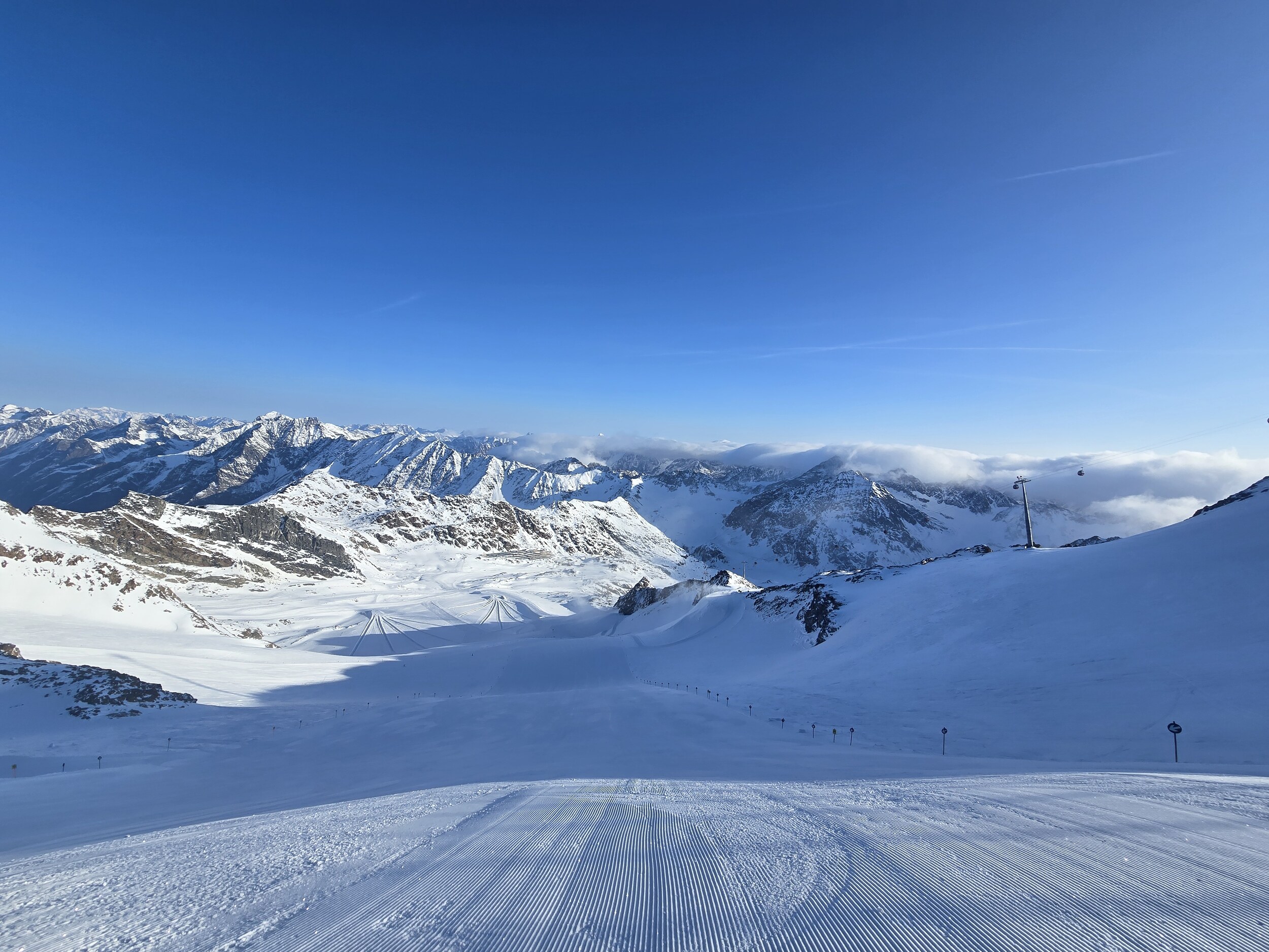 Am rifflsee ist natürlich leer, die Pisten dort halt auch zum vergessen aktuell. Am Gletscher sind die Pisten perfekt gewalzt aber noch ziemlich weich. Gut dass ich bei der Talstation vorbei gefahren bin und vom Slalom Rennski auf die all mountain gewechselt bin. Selbst mit 90er Mittelbreite fast Bootout. Mit schmalen Ski ist man heute falsch hier....
