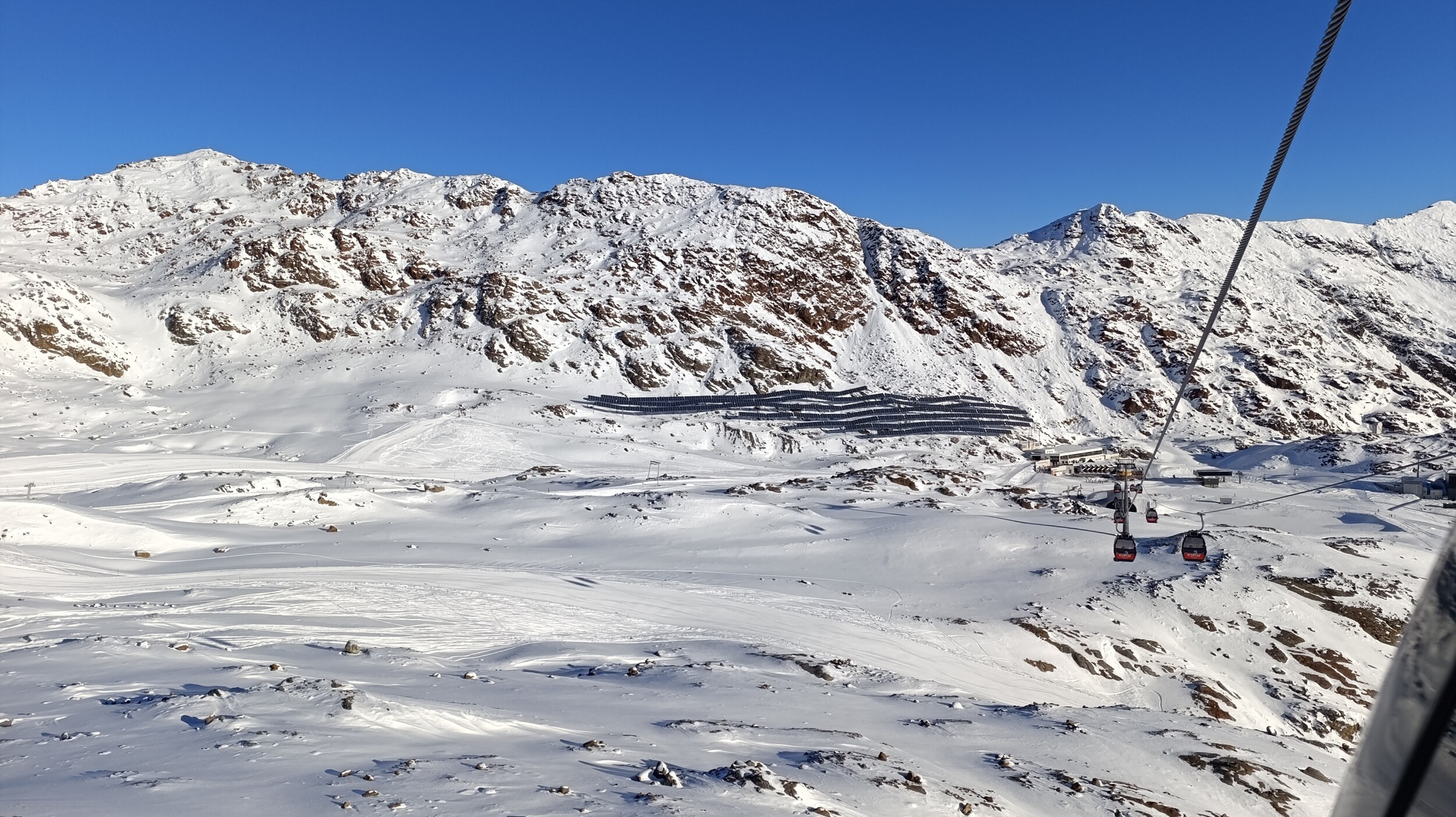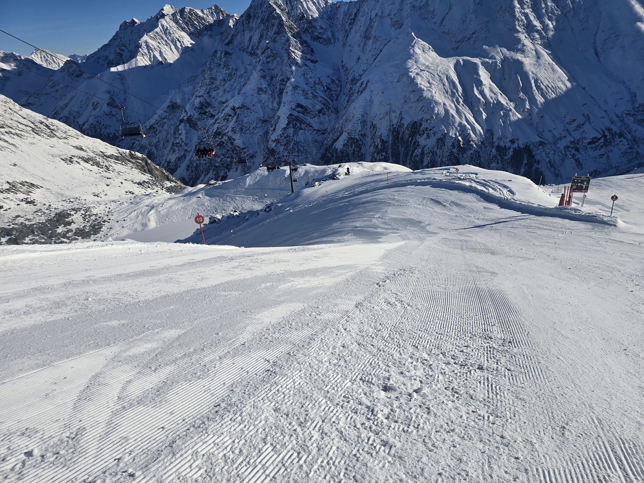 Bilder kurz nach 10:00 10:30 Oben am Mittelberg ist es ein Minenfeld. Da kann man nur Schuss runter und hoffen keinen Stein zu erwischen. Erinnert an Normalzustand oben am Grat in Ischgl. Hier wird aber schon am Talstation vor Eis und Steinen gewarnt. Aber es bräuchte einfach nur 2lkw Ladungen Schnee. Verstehe nicht dass sie die nicht von unten wo rauf bringen. Liegt ja genug 300m weiter am Gletscher.