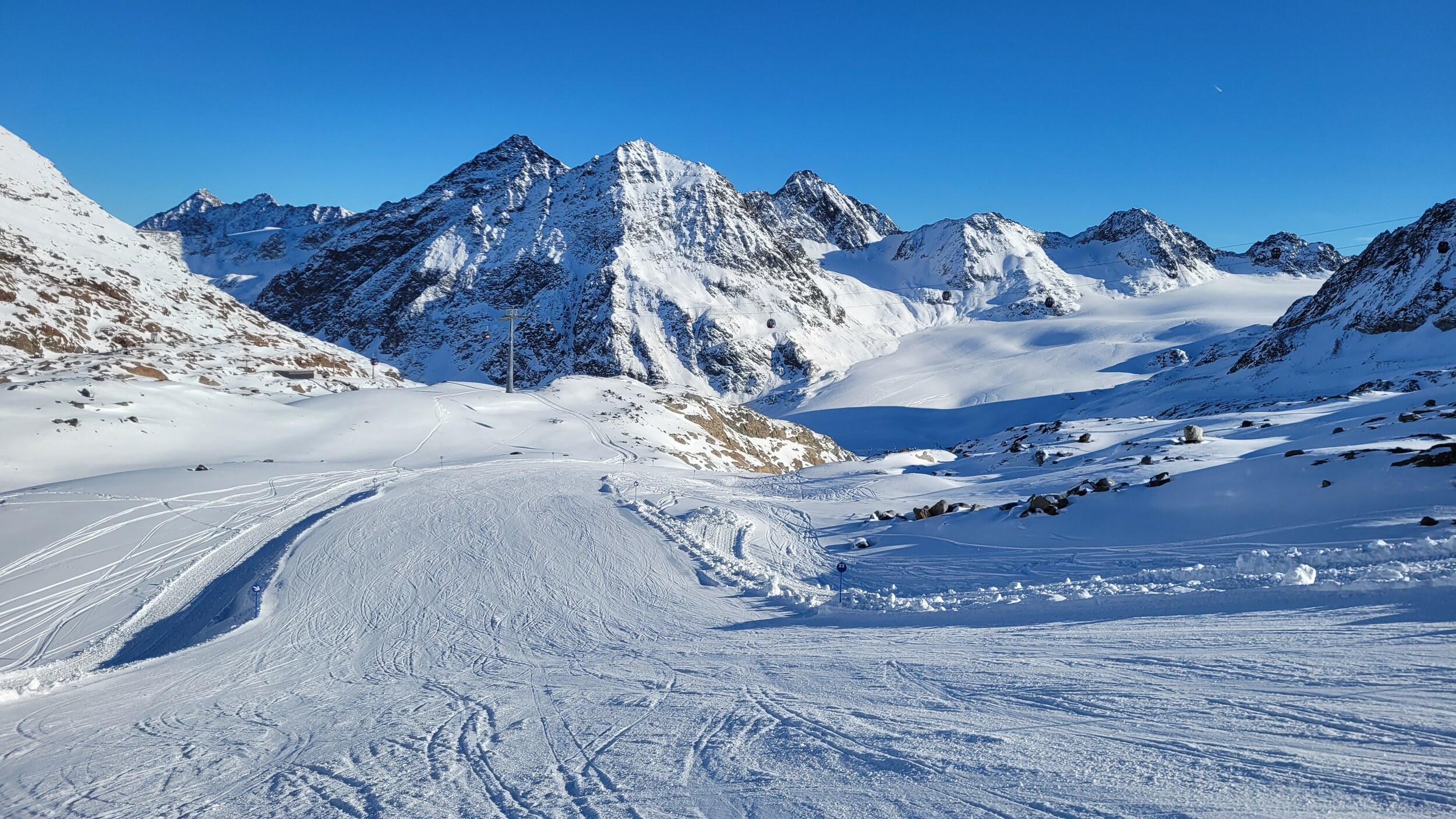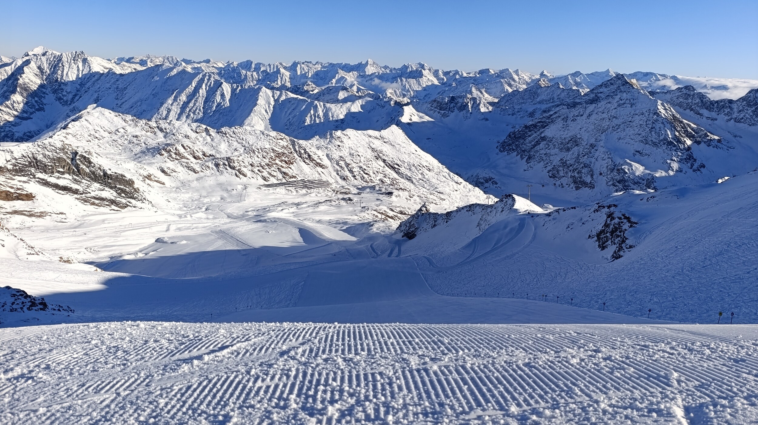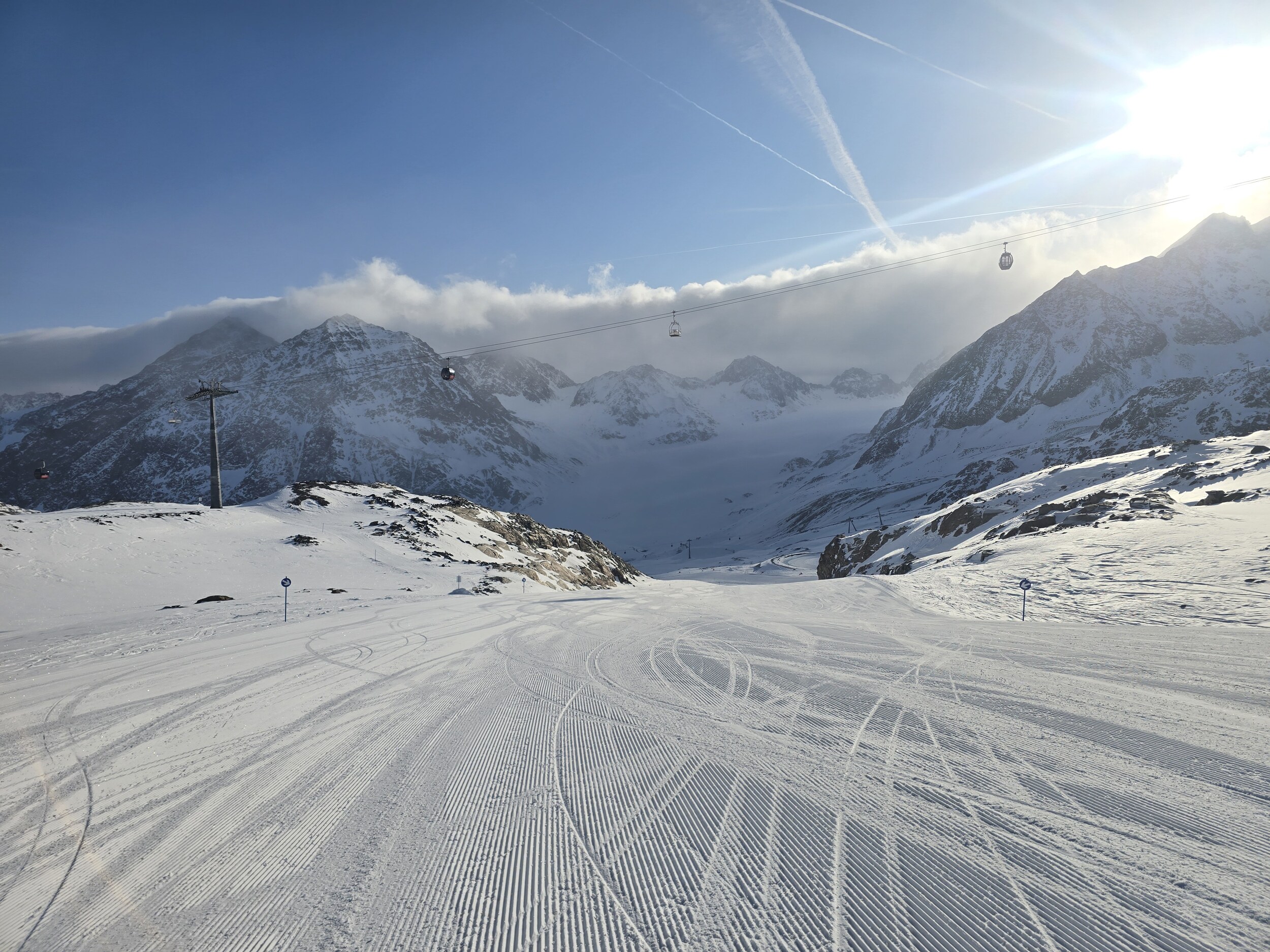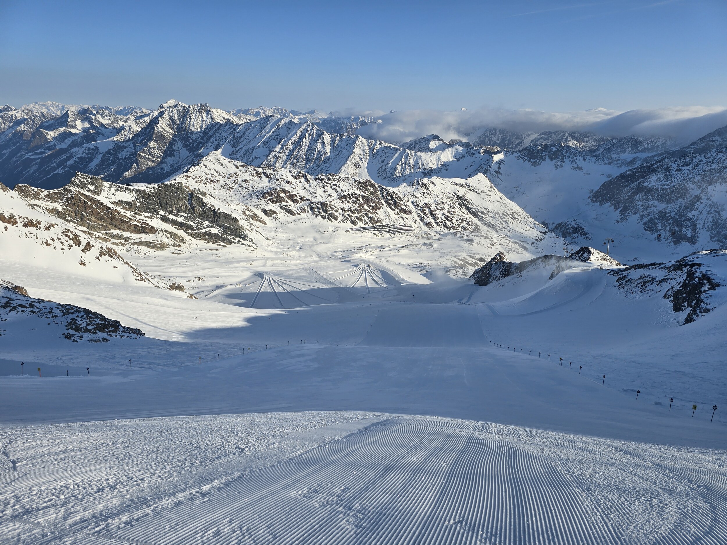 11:00 noch immer frisch gewalzt Übrigens während es in Sölden den ganzen Vormittag die Wolken aus Süden durchdrückt. Ist es hier super sonnig. Wildspitze sei dank die leitet die Wolken um.