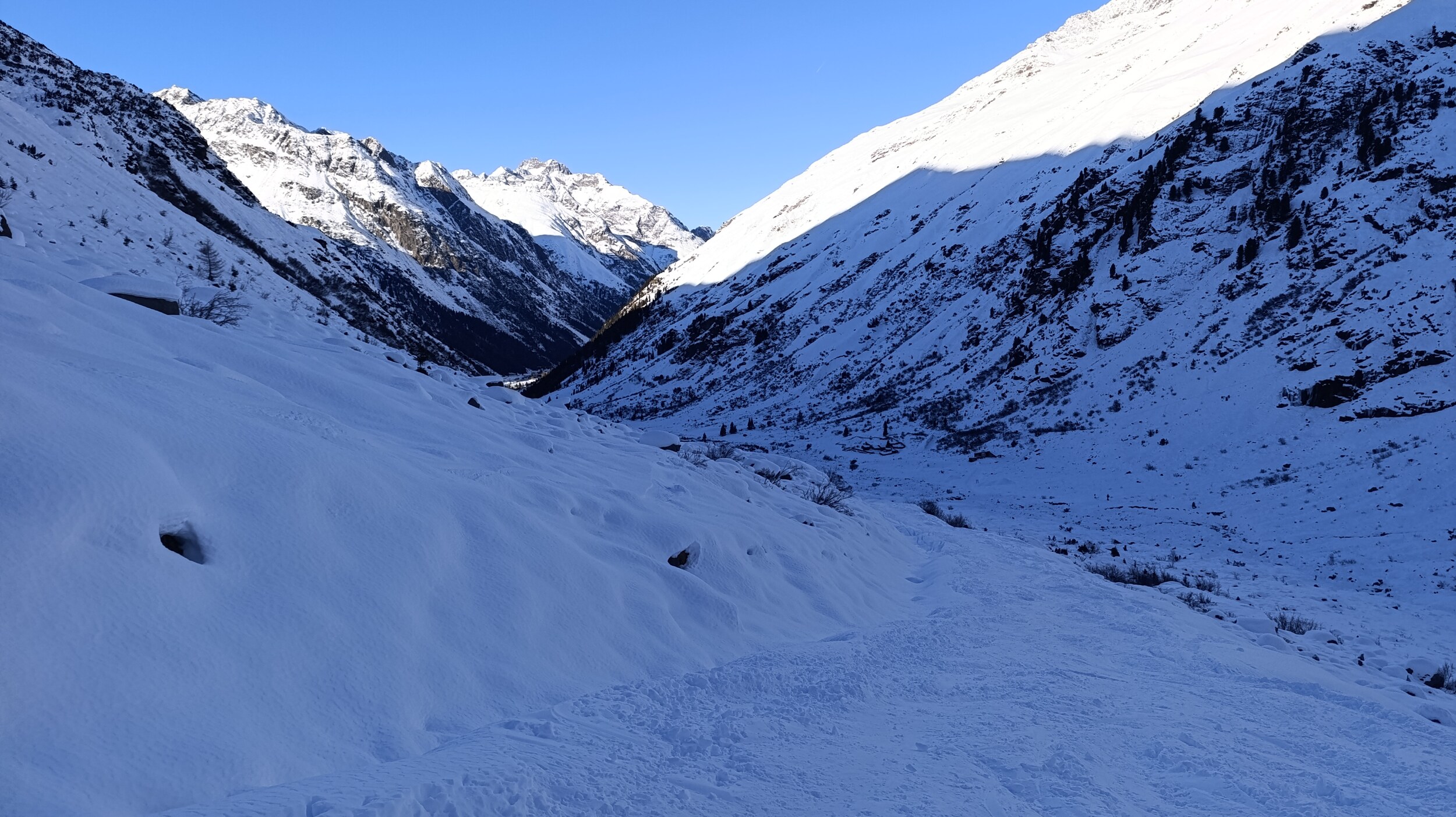 Notweg hat noch ein paar steinige Stellen ist aber mit all mountain ski absolut okay. Mit Rennski sollte man nicht runter, ein paar Kiesel wird man definitiv erwischen. In den Serpentinen ist es noch knapp.