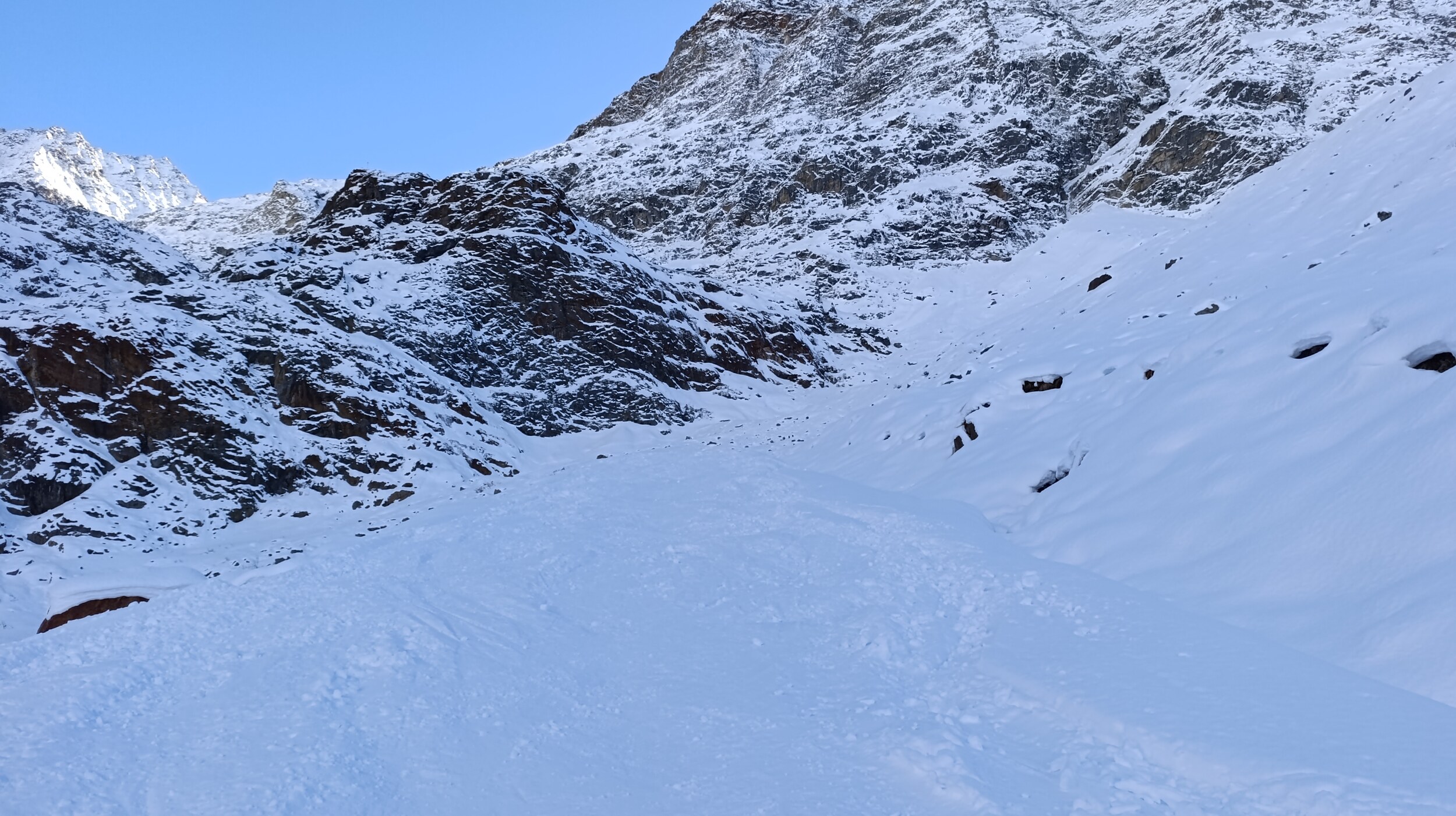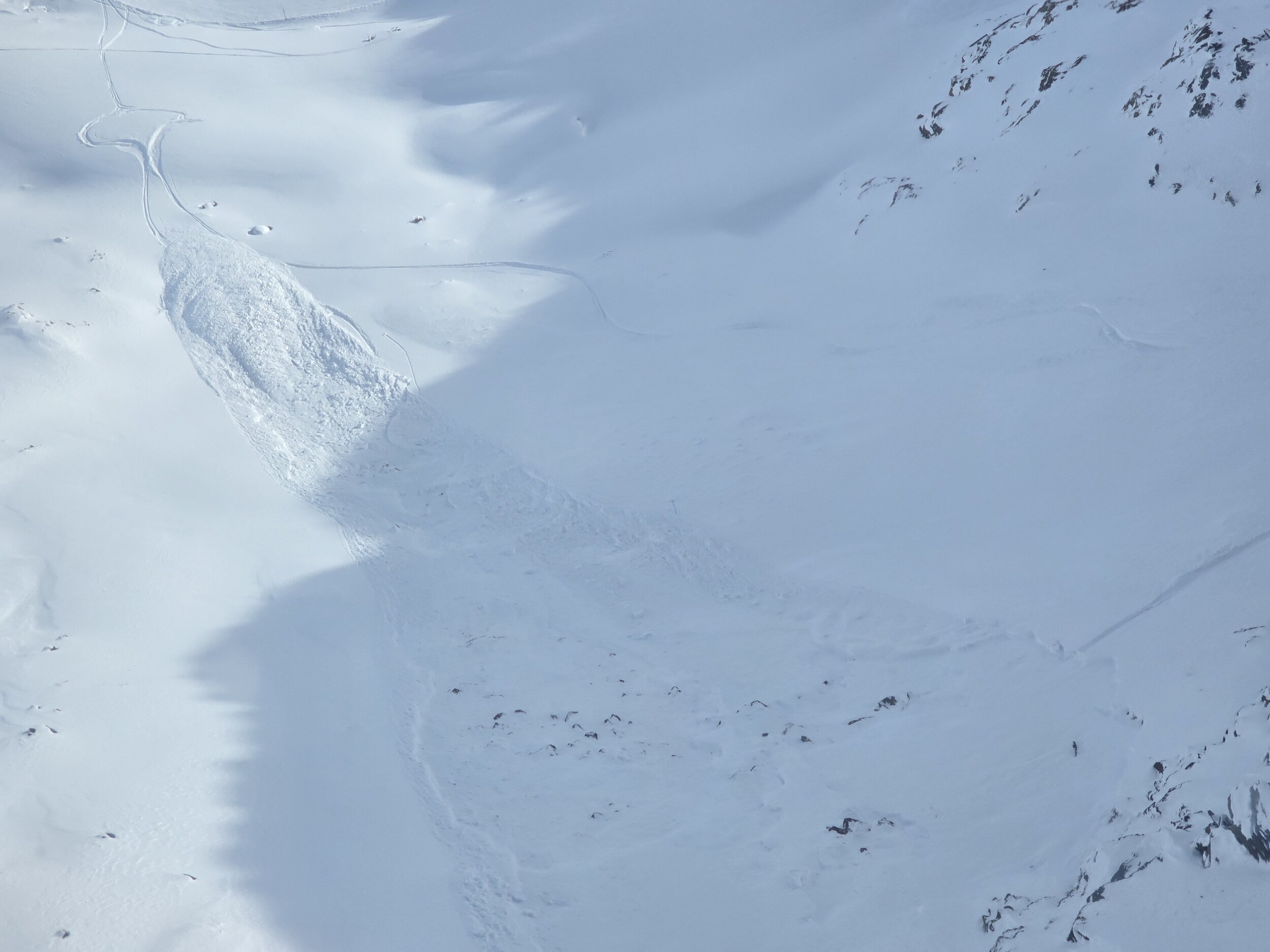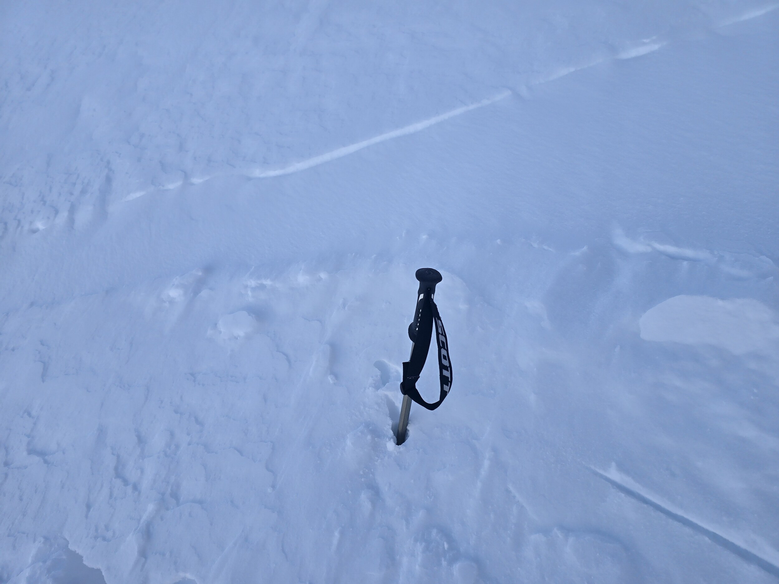 Zur Lawinengefahr heute (war nicht ich) - ziemlich klassisch unter Grat. Die Steilheit ist knapp über 40° im Abriss.