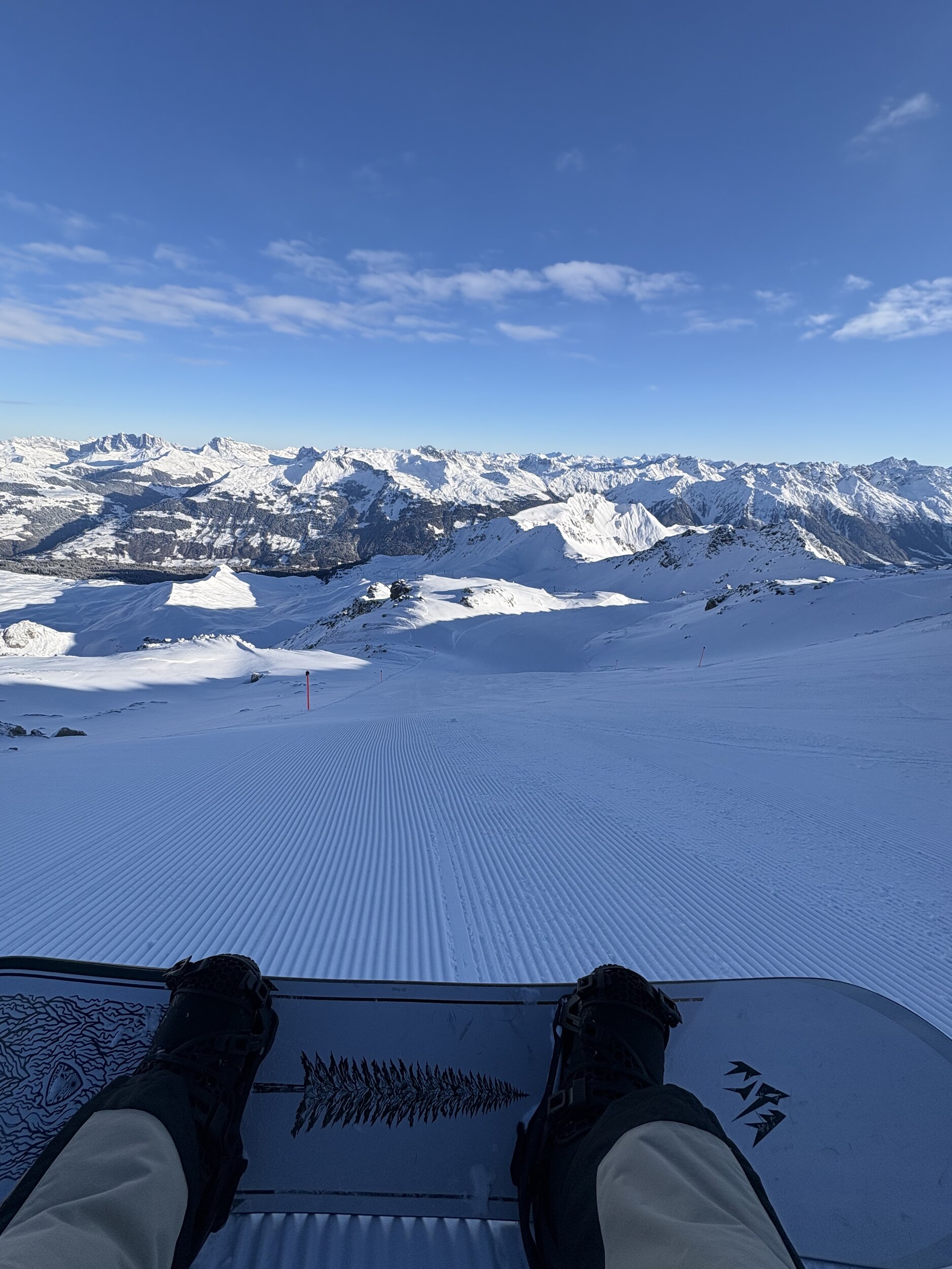 Noch ist tolles Wetter und auf den Pisten auf Parsenn nichts los. Viele Menschen mit breiten Latten, es hat ein wenig Neuschnee gegeben. Lift- und pistenmässig hat ausser Schwarzseealp alles geöffnet. Meine Premierenfahrt auf der 1 für diese Saison Das ist einfach nur geil. Die pulvrig griffigen Pisten bis zum Schifer habe ich für mich alleine und kann noch meine eigene Spur ziehen. Am der Schifer Talstation stehen 3 Skifahrer. Leider zieht es schon zu. Ich beschliesse in der Sonne zu bleiben und Mache die Talabfahrt nach Davos. Auf der Rapid wenig los. Die Talabfahrt habe ich mit frischen Rillen wieder für mich alleine. In Davos dann die böse Überraschung - Stau an der Parsennbahn. Ich habe keine Lust zu warten, schnappe den nächsten Bus und bin so um 10:15 Uhr am Jakobshorn gelandet. Und da das Board schon mal abgeschnallt ist fahre ich auch gleich zum Gipfel. Die 5 Bisher überraschen mich die Pisten am Jakobshorn mit guter Präperation und selbst bei der Schwarzen am Brämajet mit guter Griffigkeit. Gleiches gilt für die Vertical. Update 12:45 Uhr - nachdem ich am Jakobshorn alle Lifte einmal gefahren bin nehme ich die blaue 10 ins Tal und erwische noch den Zug nach Filisur. Also drehe ich auch noch eine Runde am Rinerhorn. Am Juonli haben sie nun beide rote auf. Die sind aber leider schon ziemlich verfahren, es hat heute einige Skigruppen hier. Die Talabfahrt aber wie gewohnt tipptopp und leer. Update 14:00 Uhr Nach einmal Nülli fahre ich ab und mit dem Bus zurück nach Davos. Das Wetter gibt auch noch einmal alles. Auf dem Weissfluhjoch schneit es. Seetäli nehme Ich auf der Rückfahrt nach Klosters noch mit. Die Piste habe ich für mich alleine. Die Talabfahrt nach Klosters ist auch noch bestens.