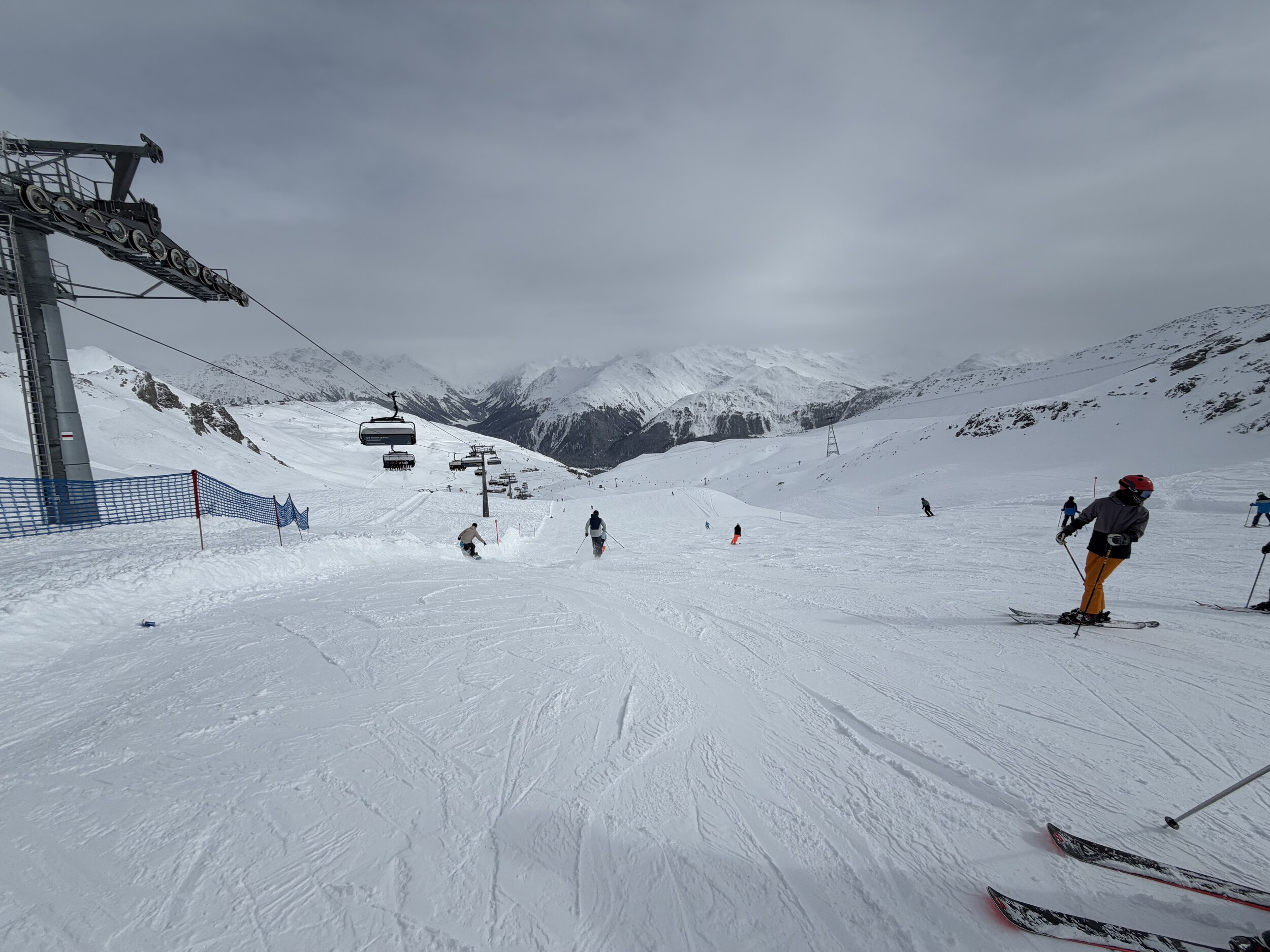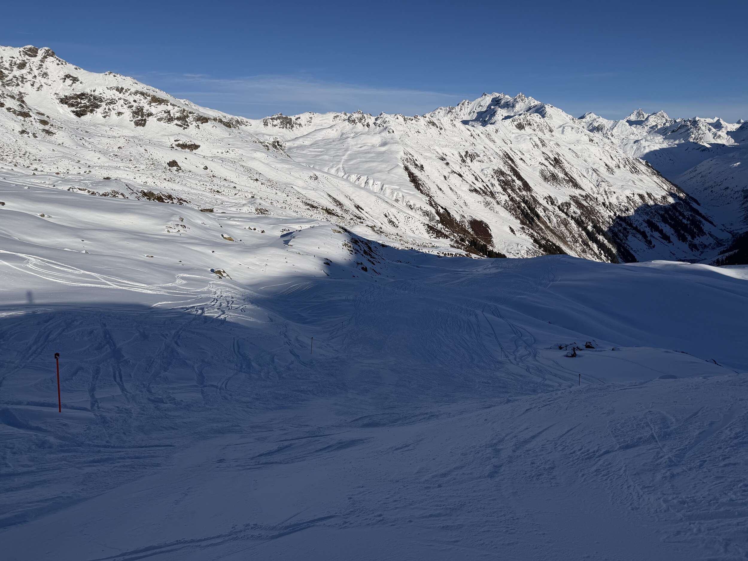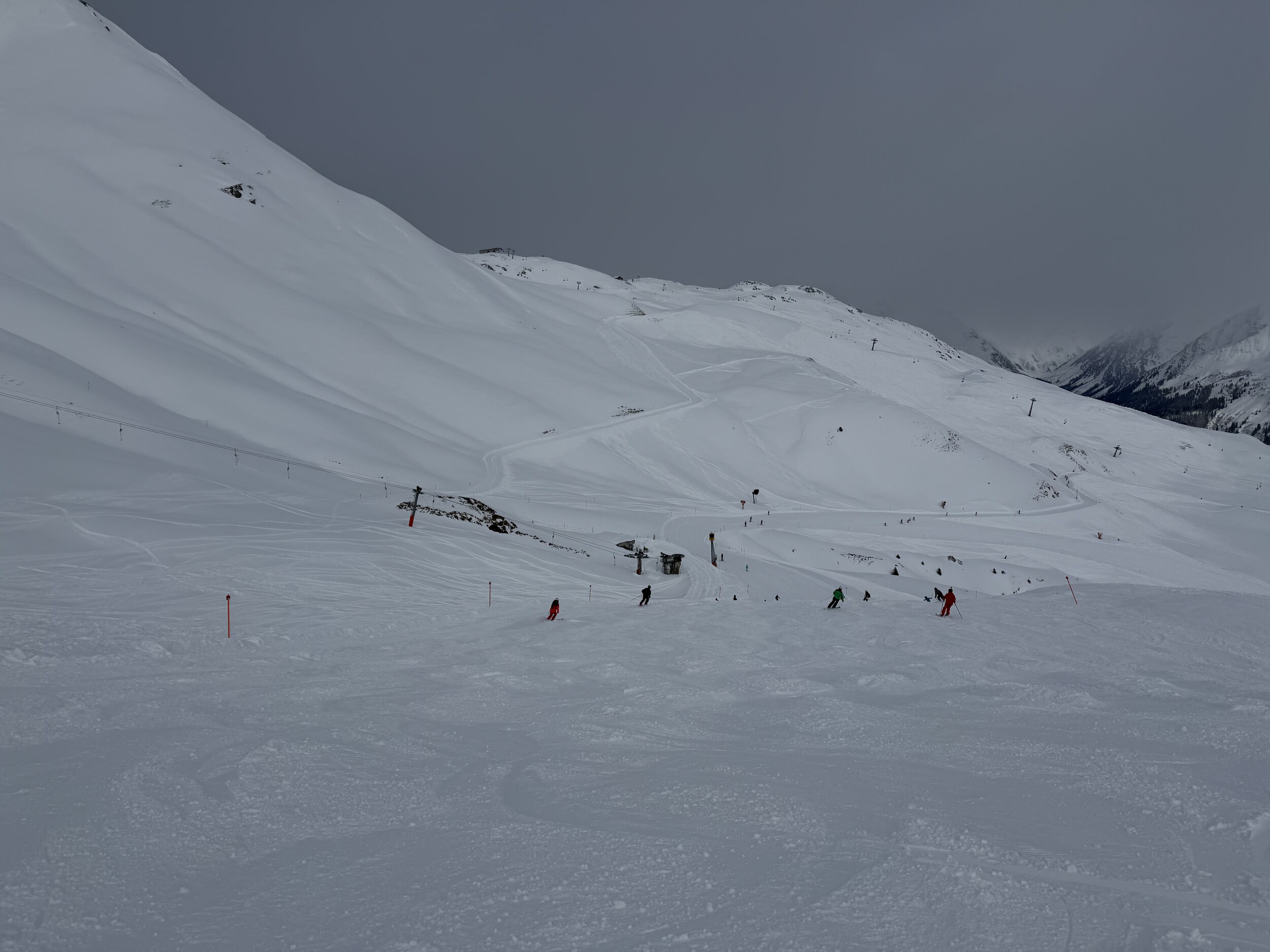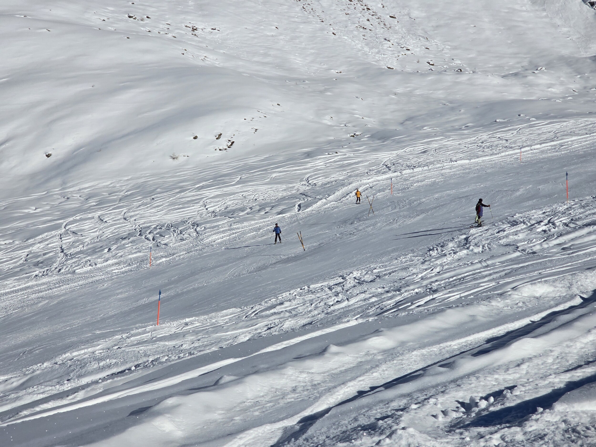 Die Pisten nach dem Schneefall natürlich alle ziemlich weich und unruhig. Zuoberst auf dem Joch relativ windig, ansonsten windstill.