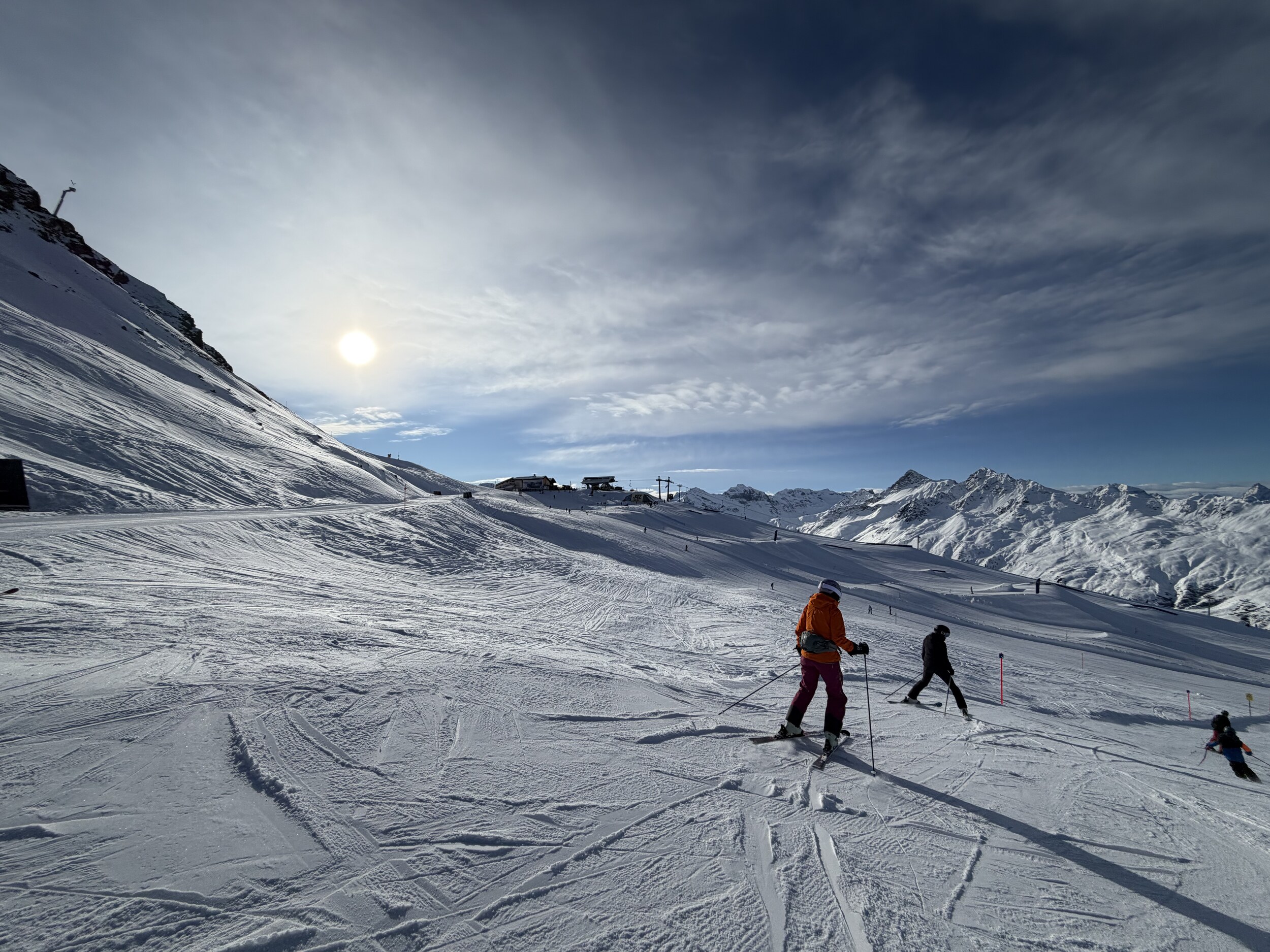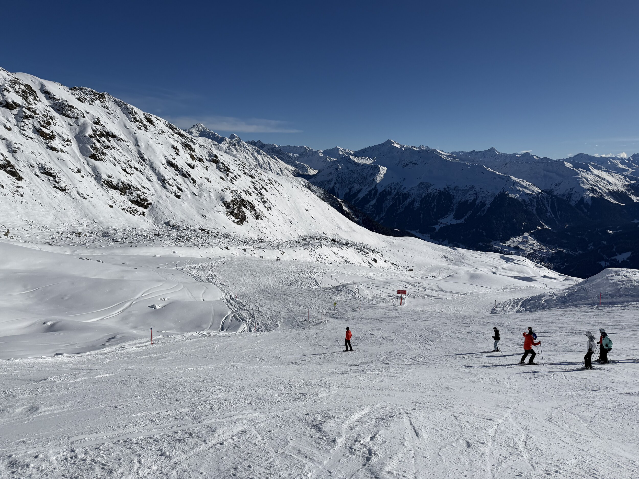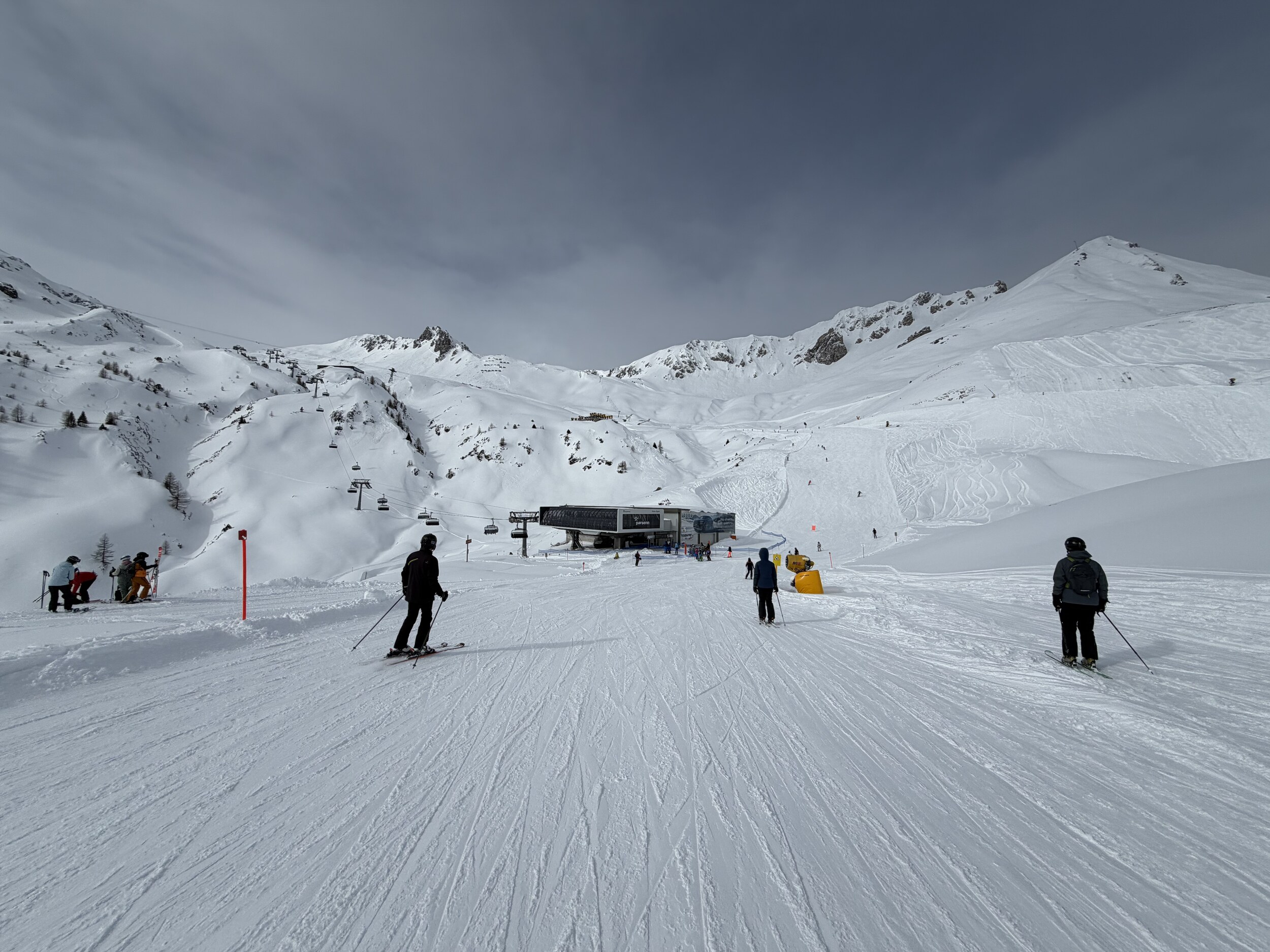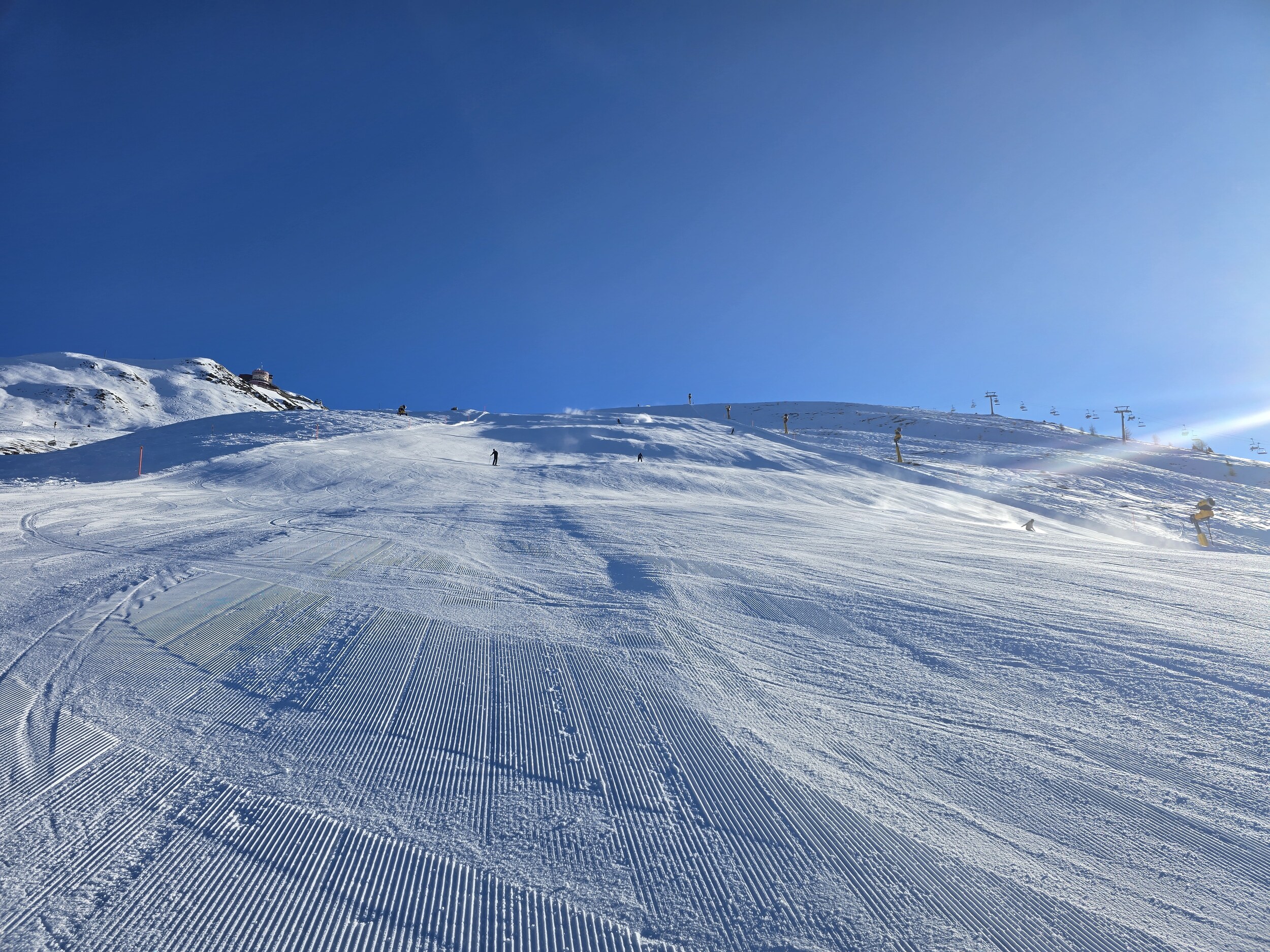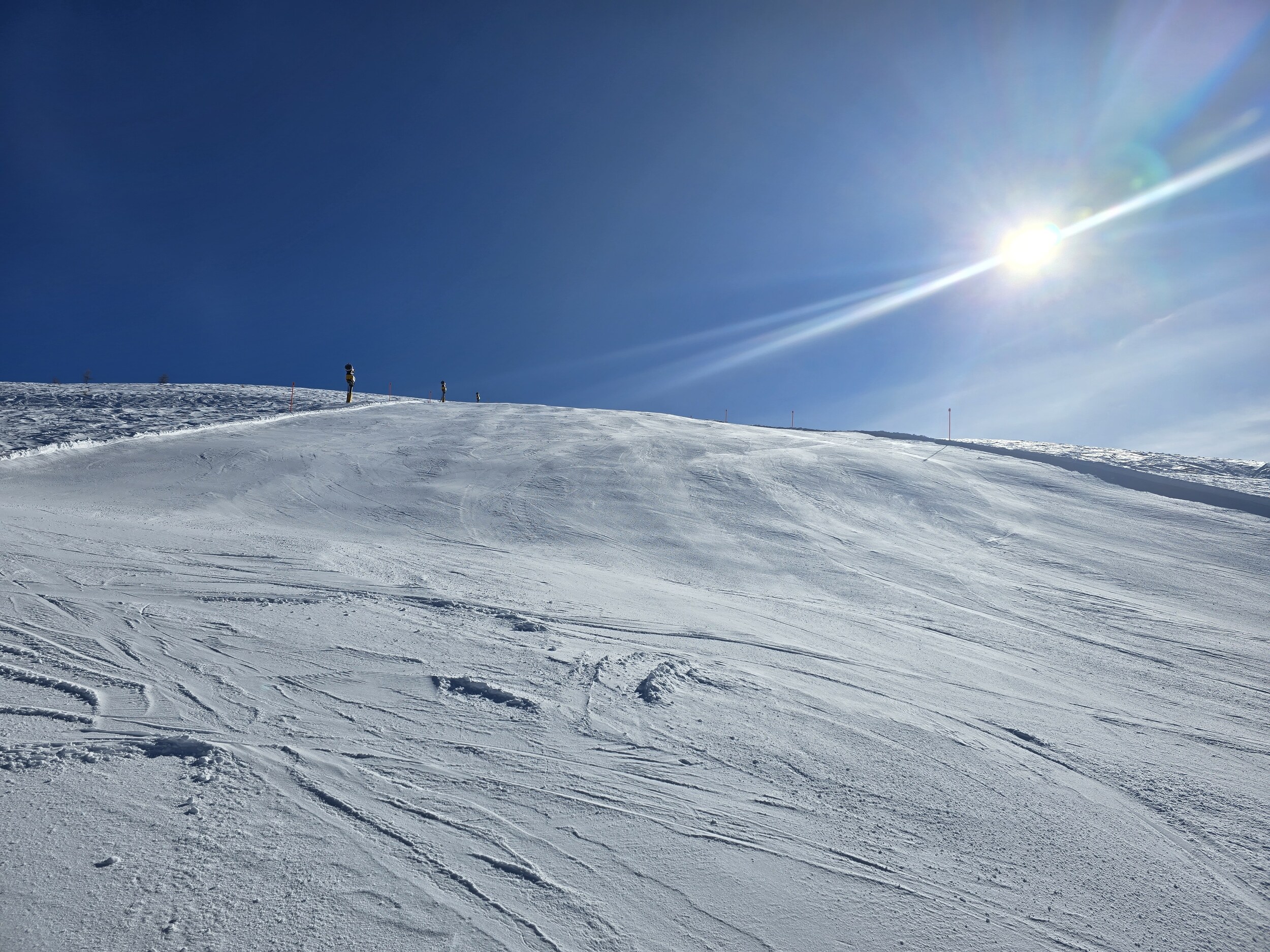 Die Pisten nach dem Schneefall natürlich alle ziemlich weich und unruhig. Zuoberst auf dem Joch relativ windig, ansonsten windstill.
