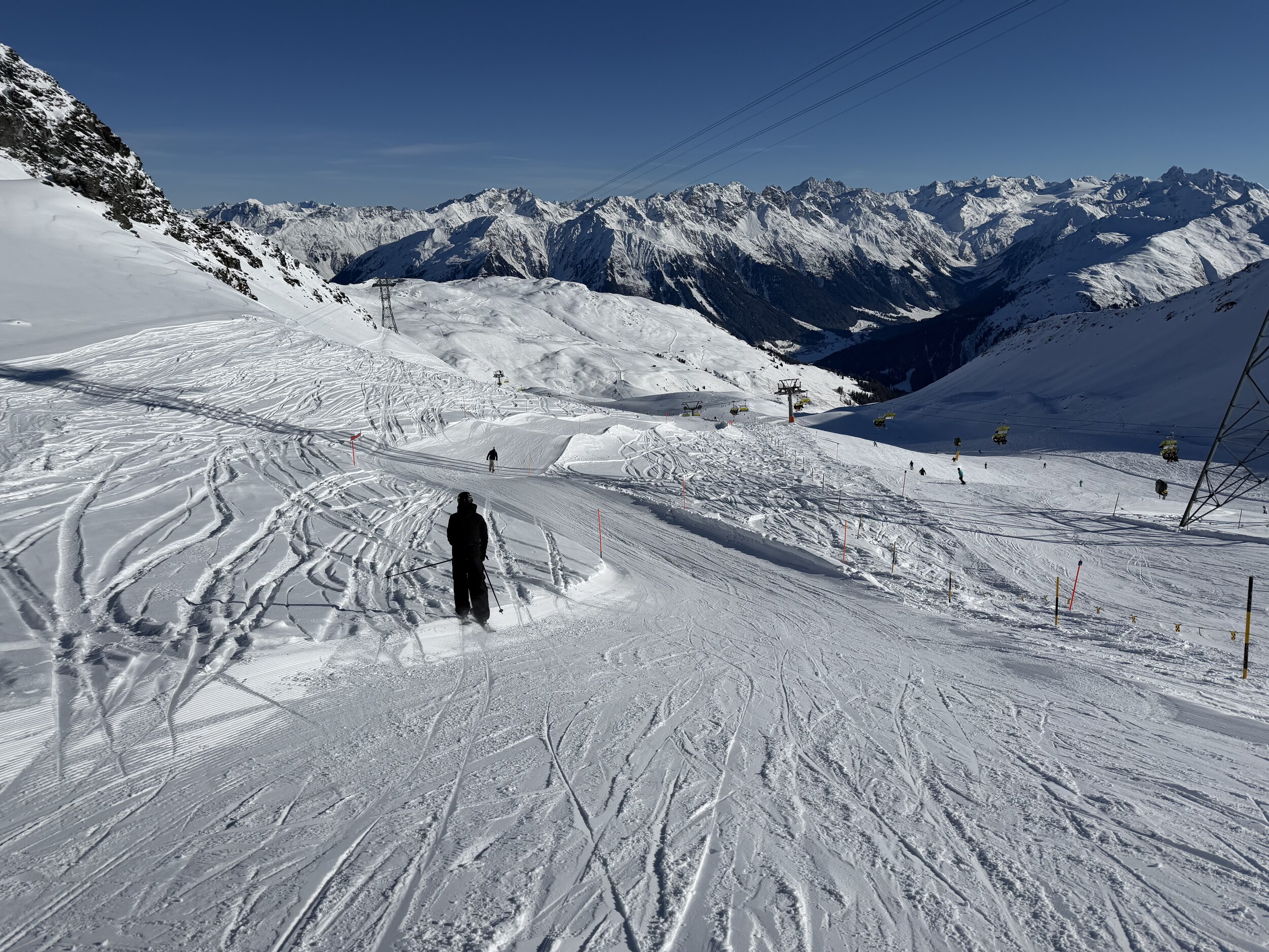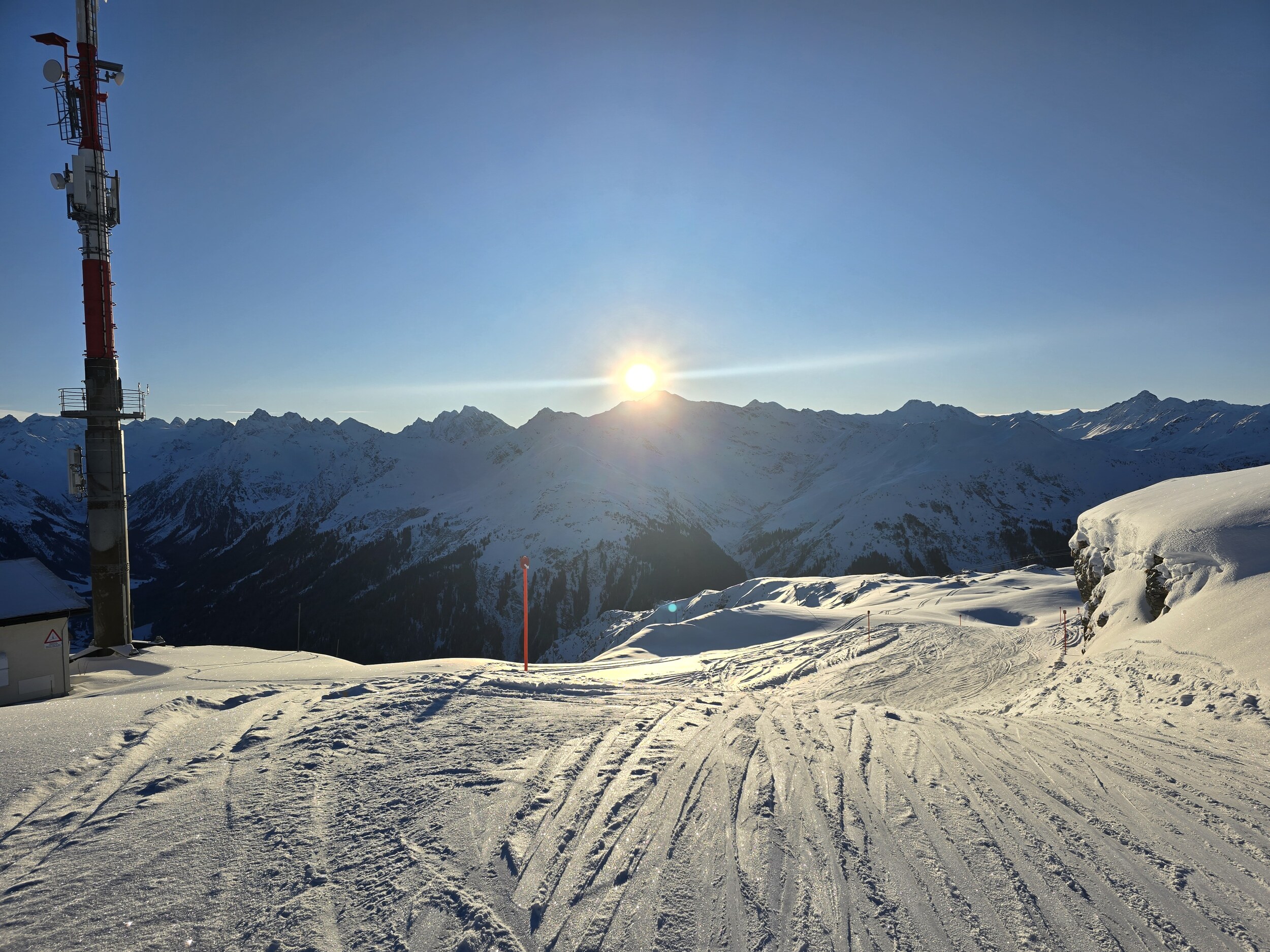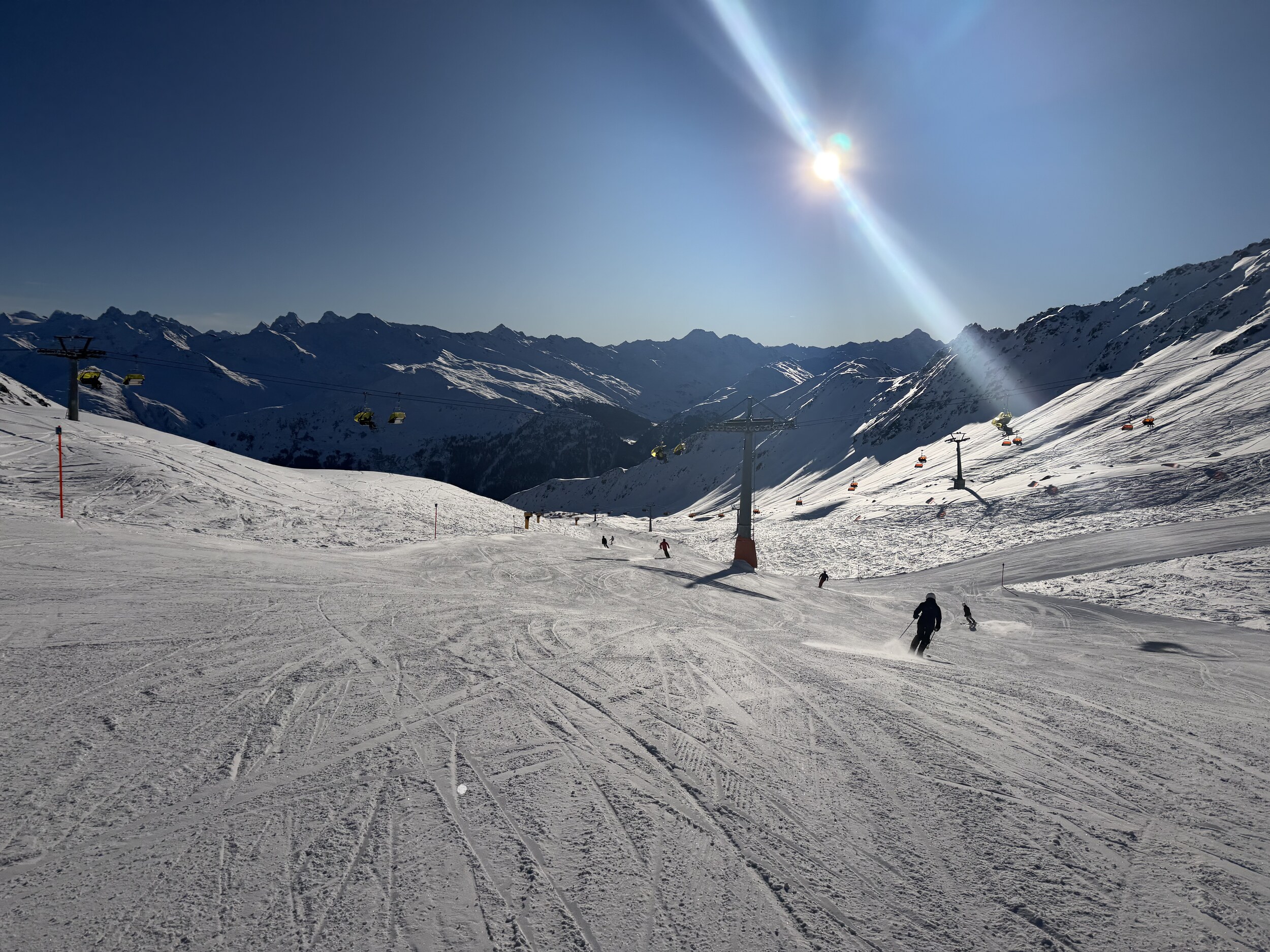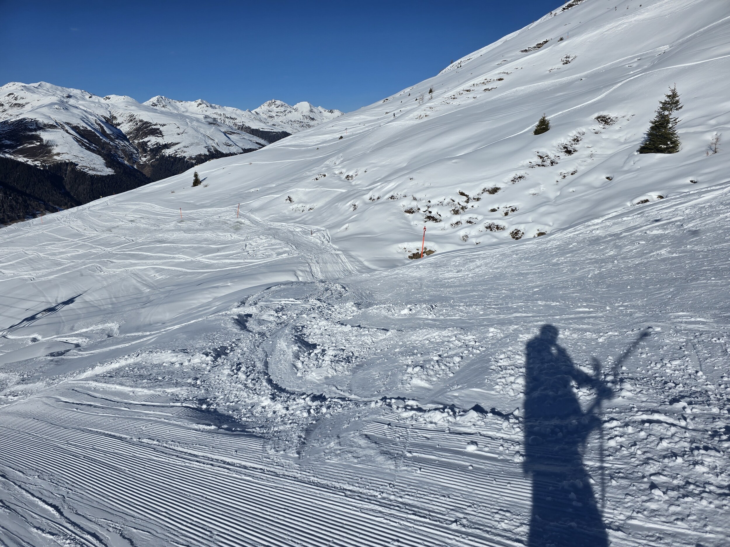 Seit dem Mittag ist es sehr leer. Auf der Jatzpiste kann man beinahe ungehindert weite Carving-Schwünge ziehen. Die Piste ist sehr gut in Schuss, beinahe besser als früh morgens mit der unruhigen Präparation. So habe ich hier bis jetzt bereits 19 Fahrten absolviert, die 20. folgt nun. Edit 16:50