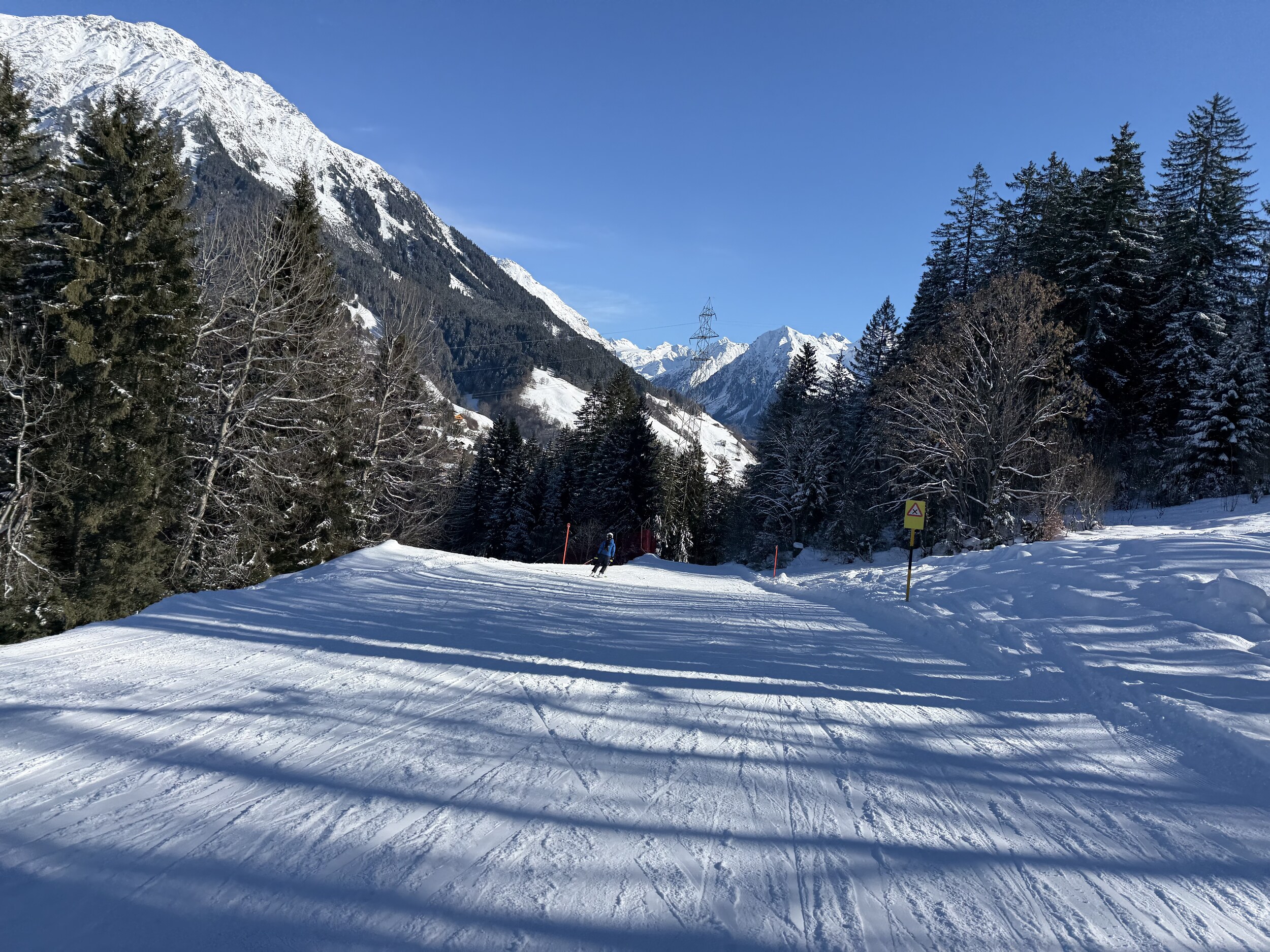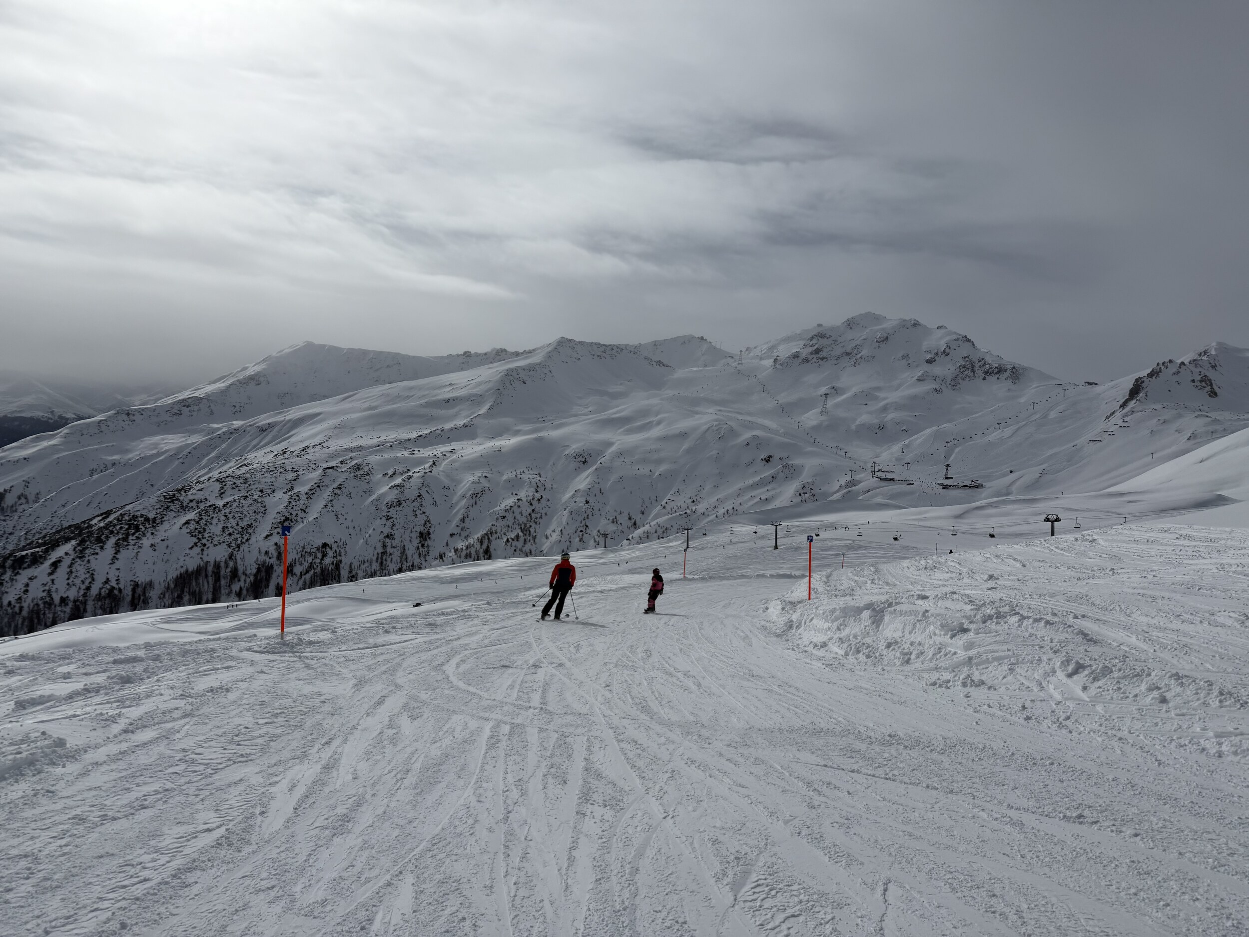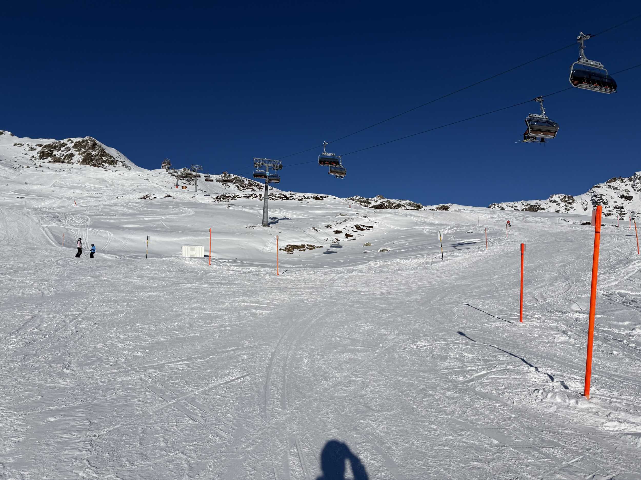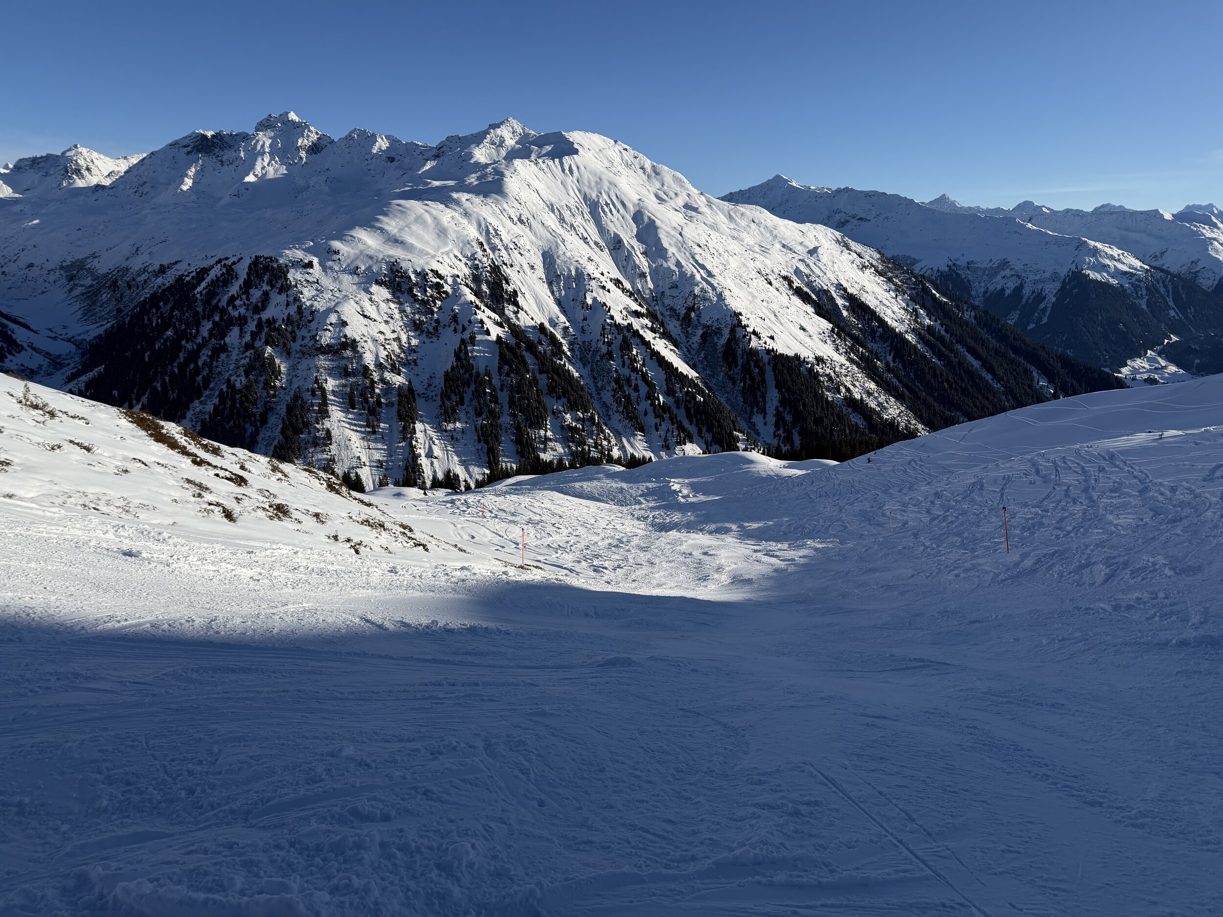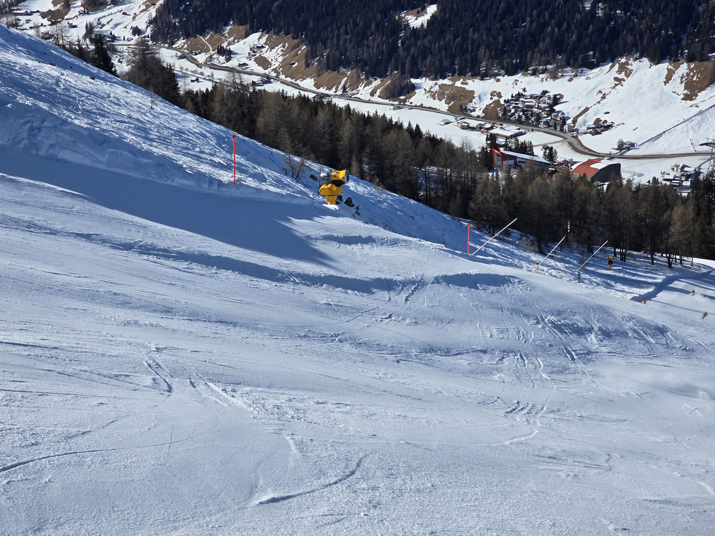 Seit dem Mittag ist es sehr leer. Auf der Jatzpiste kann man beinahe ungehindert weite Carving-Schwünge ziehen. Die Piste ist sehr gut in Schuss, beinahe besser als früh morgens mit der unruhigen Präparation. So habe ich hier bis jetzt bereits 19 Fahrten absolviert, die 20. folgt nun. Edit 16:50
