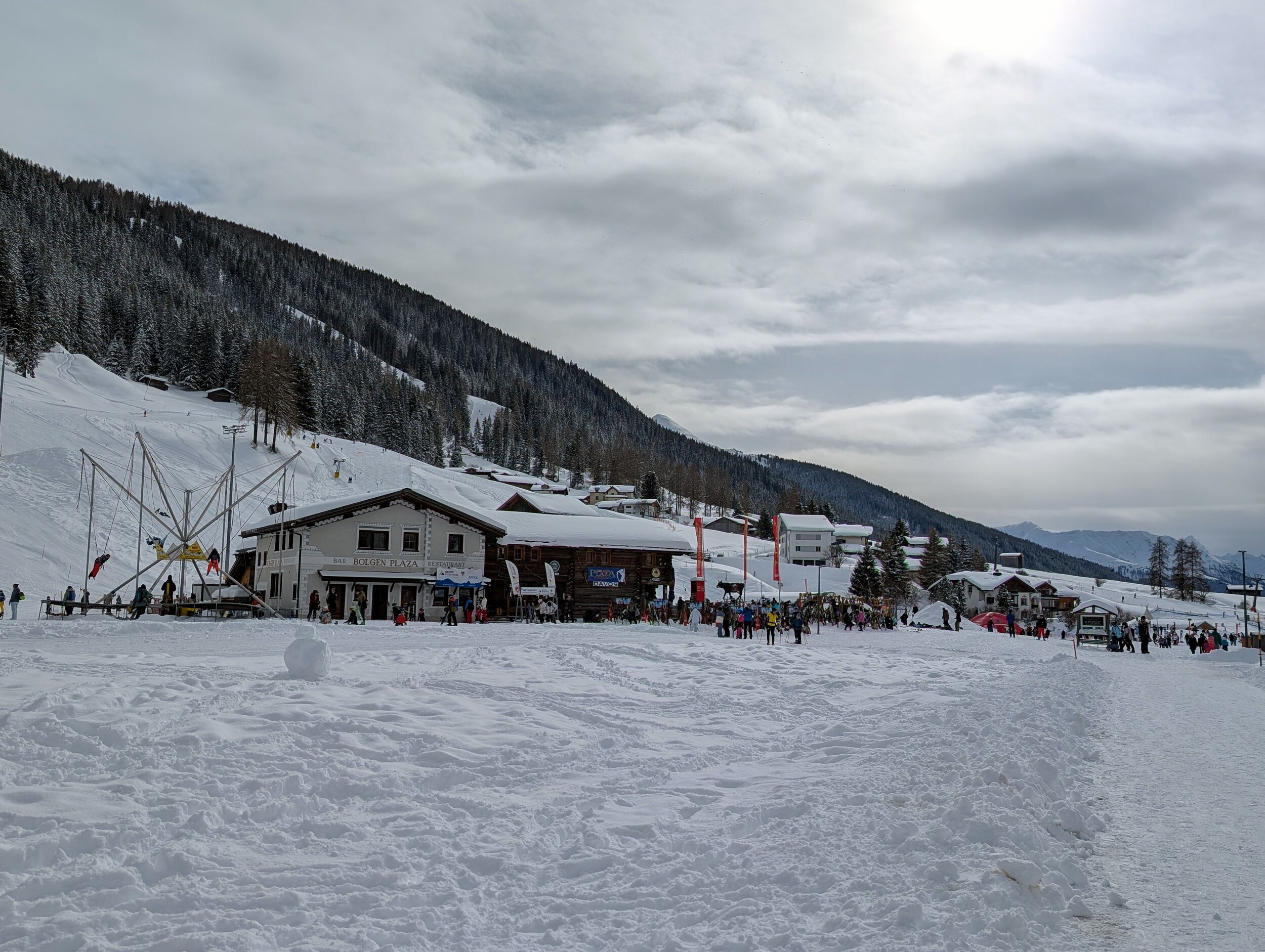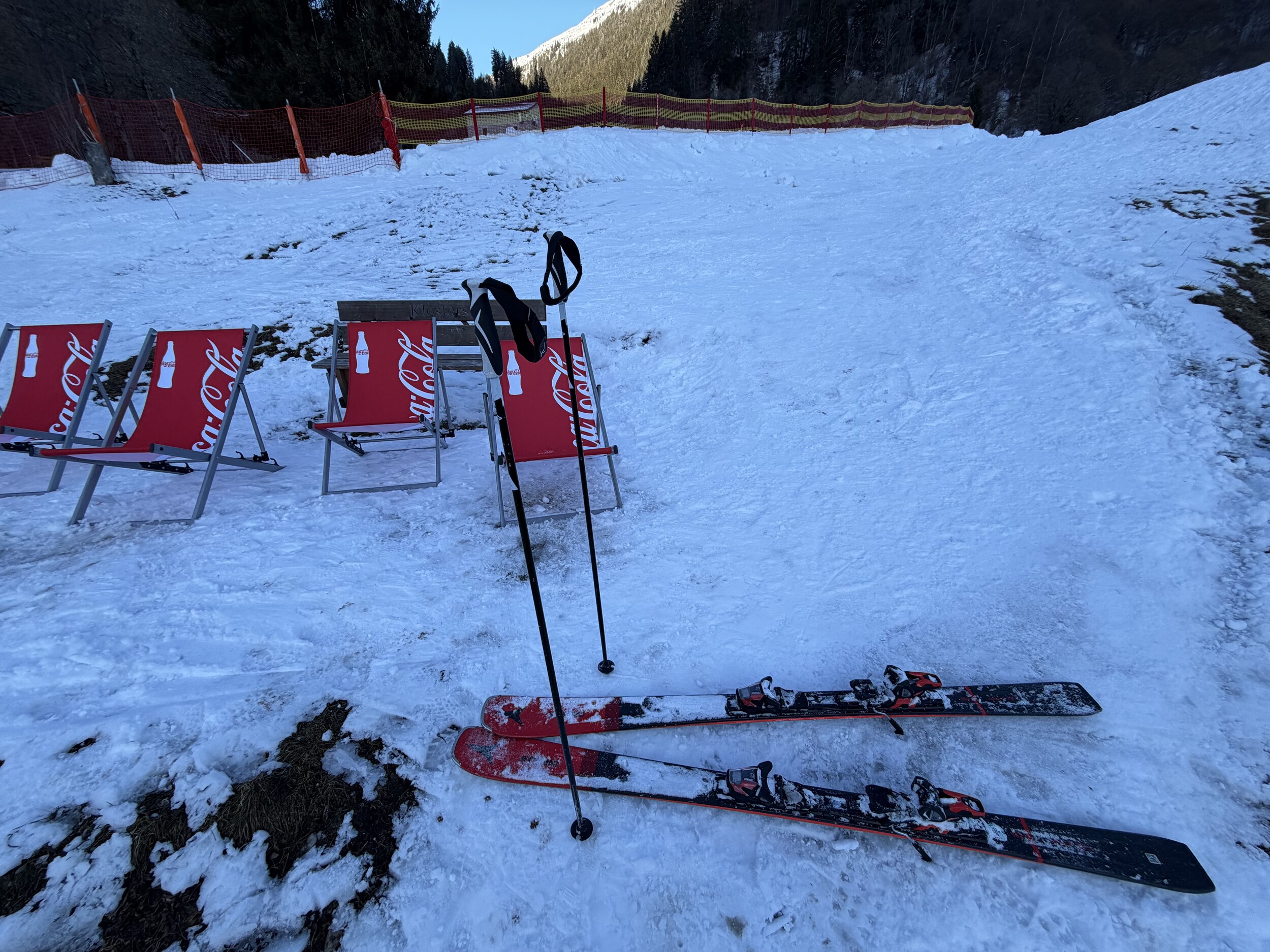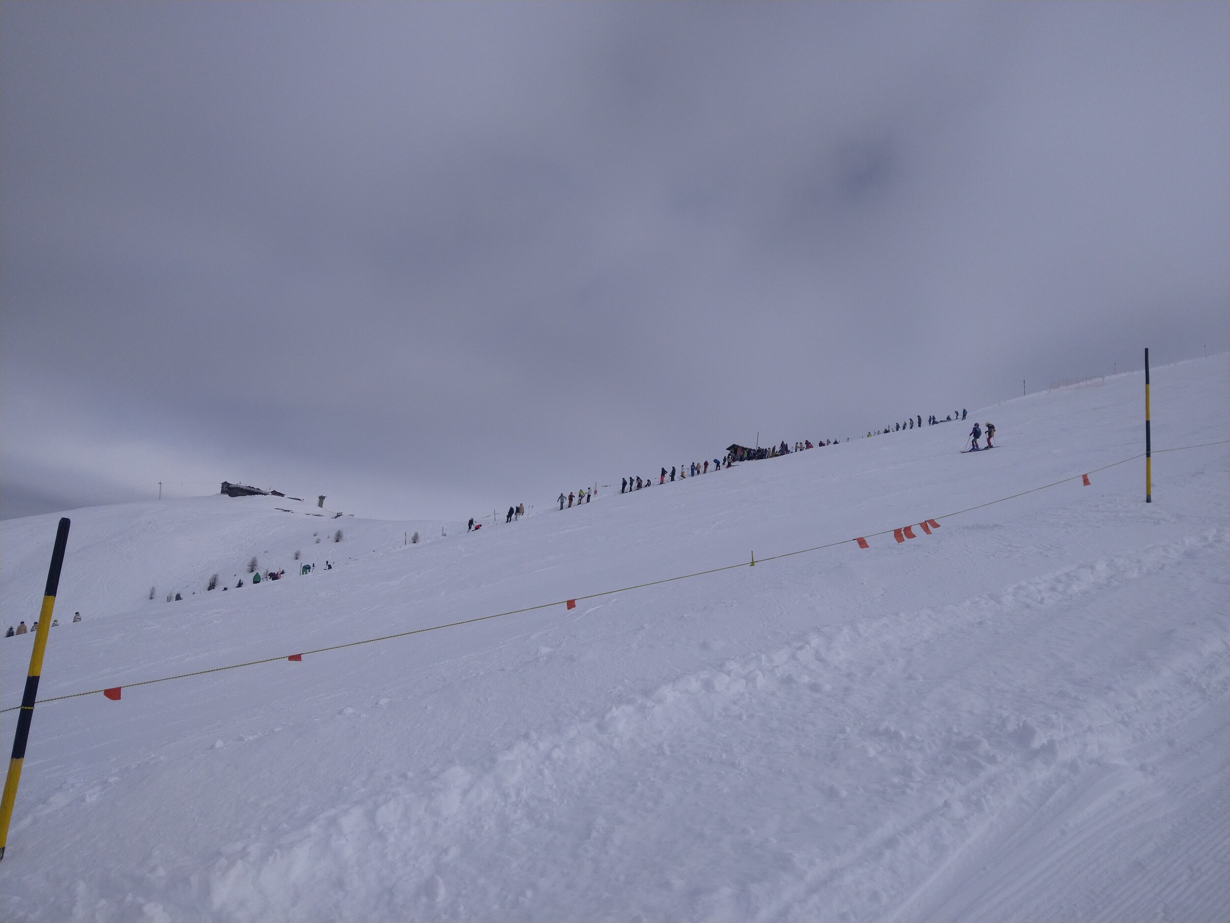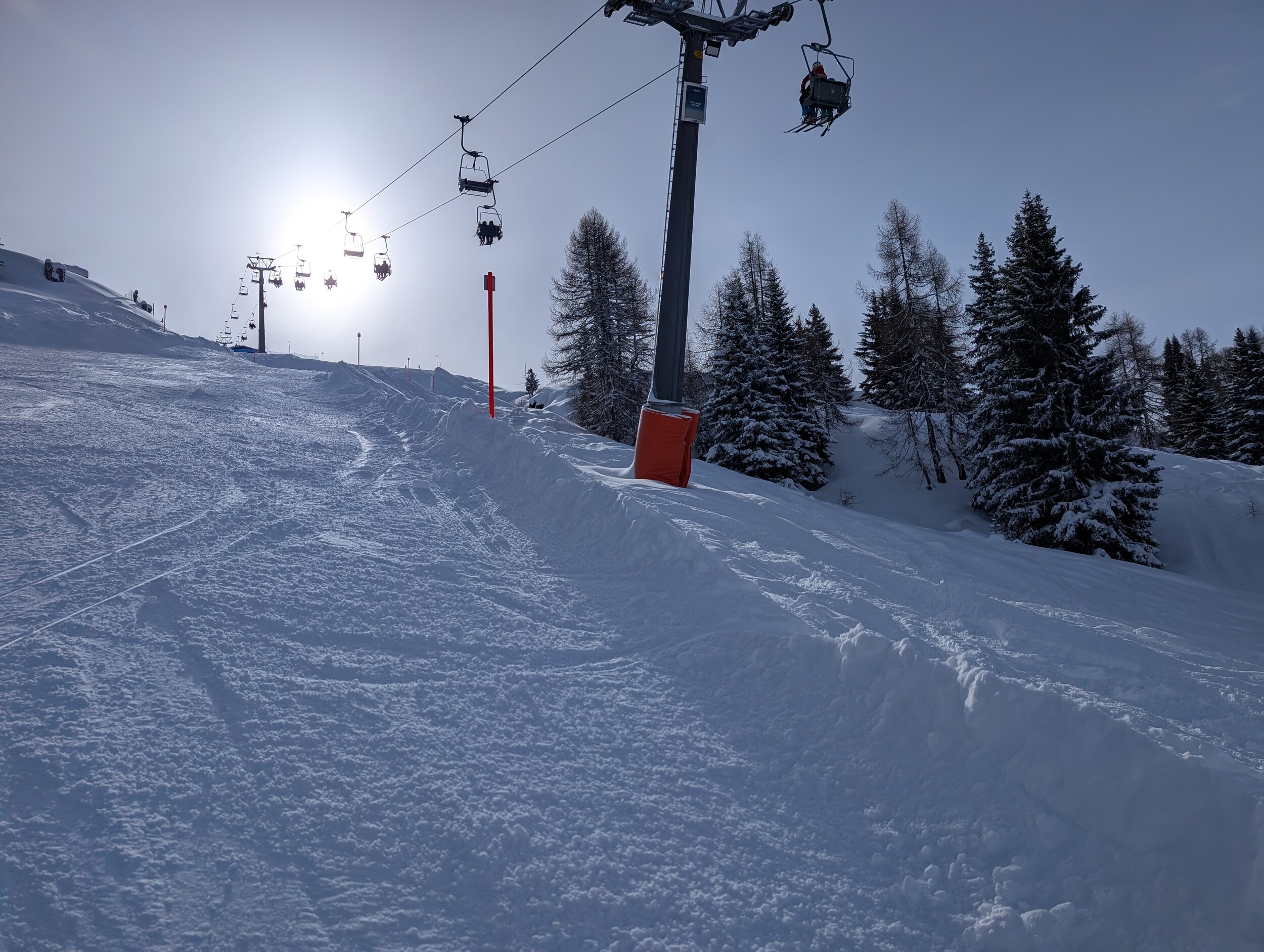 Seit dem Mittag ist es sehr leer. Auf der Jatzpiste kann man beinahe ungehindert weite Carving-Schwünge ziehen. Die Piste ist sehr gut in Schuss, beinahe besser als früh morgens mit der unruhigen Präparation. So habe ich hier bis jetzt bereits 19 Fahrten absolviert, die 20. folgt nun. Edit 16:50