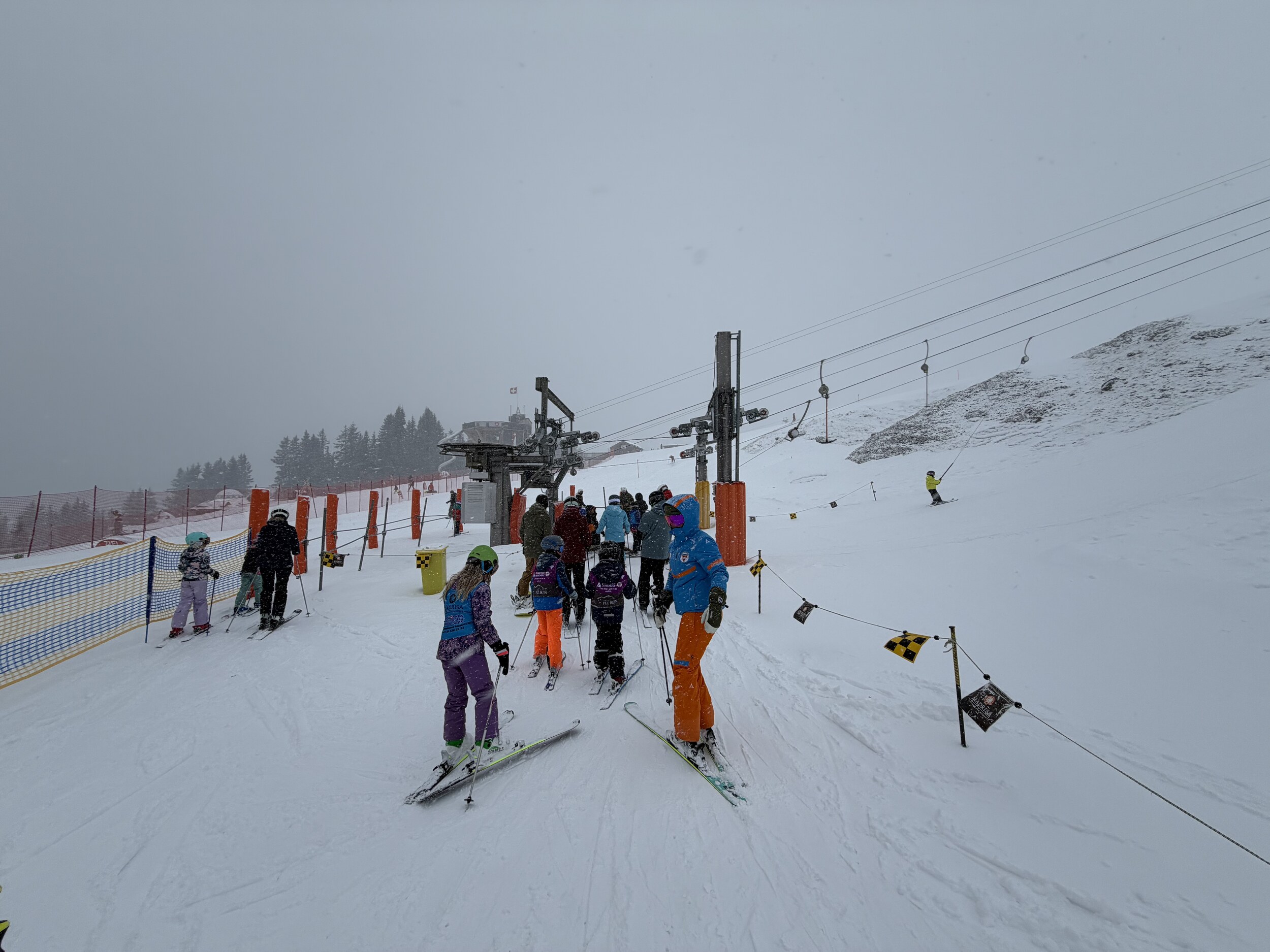 Viel los am Juonli, Rennen, JO- Gruppen, Skilehrergruppen,..es laufen beide Lifte und trotzdem zeitenweise 4-5 Bügel anstehen.