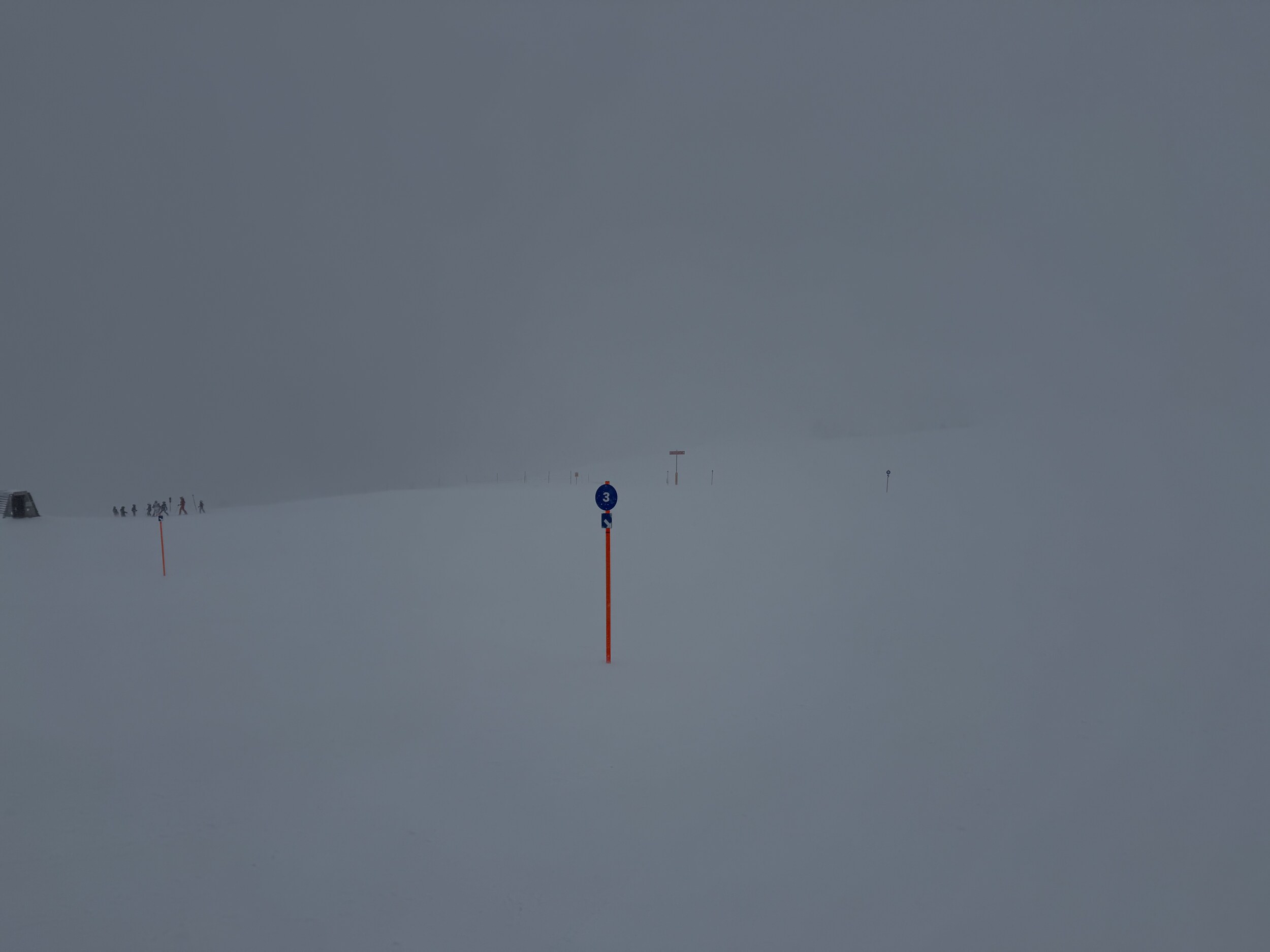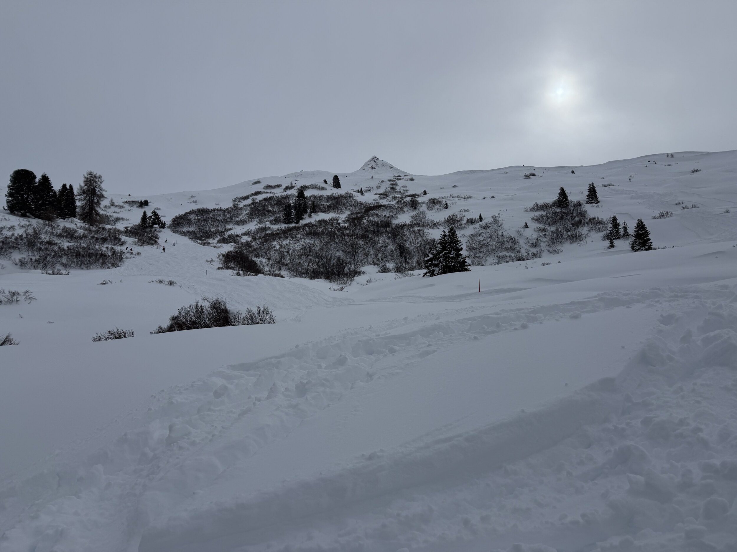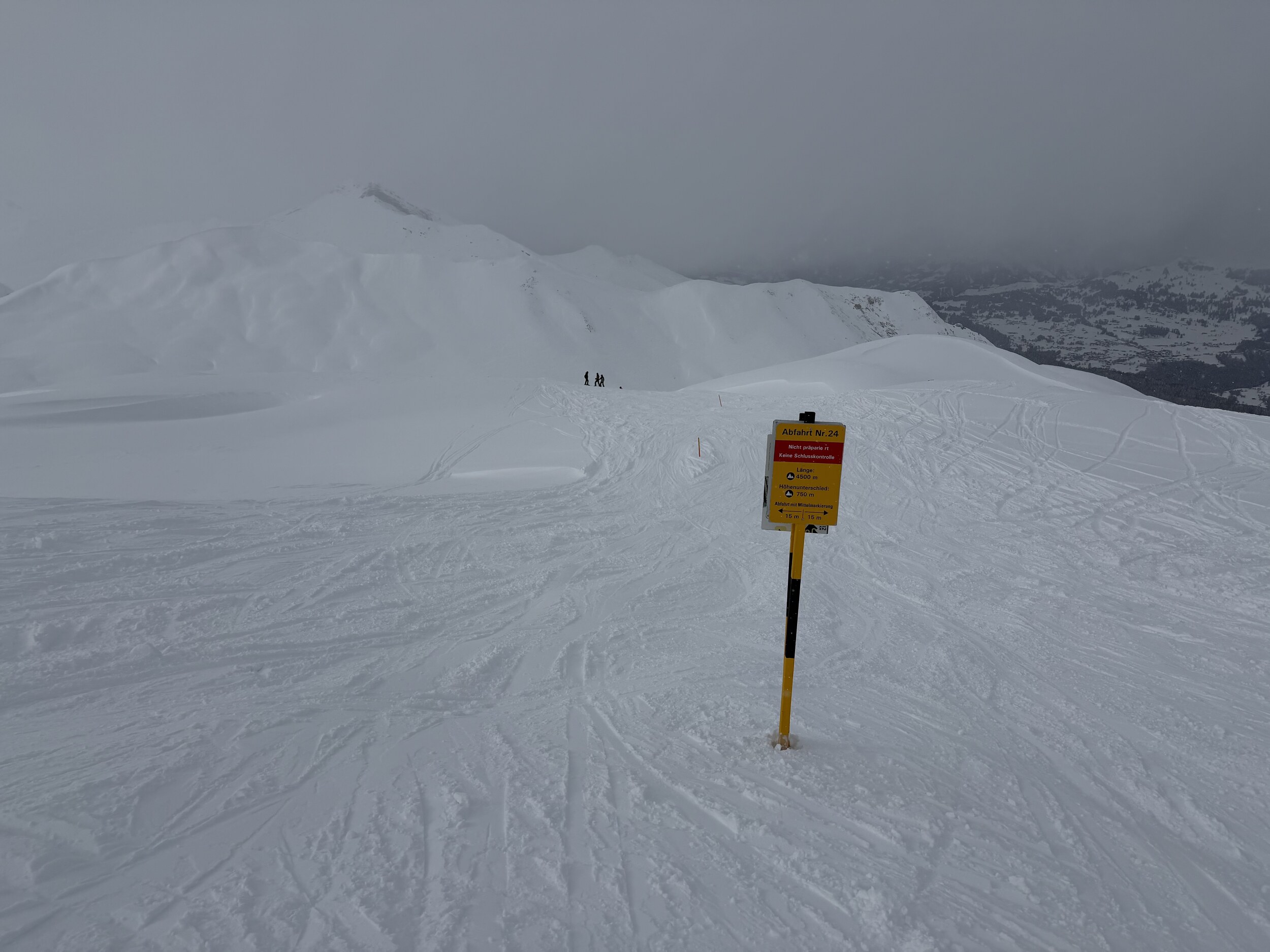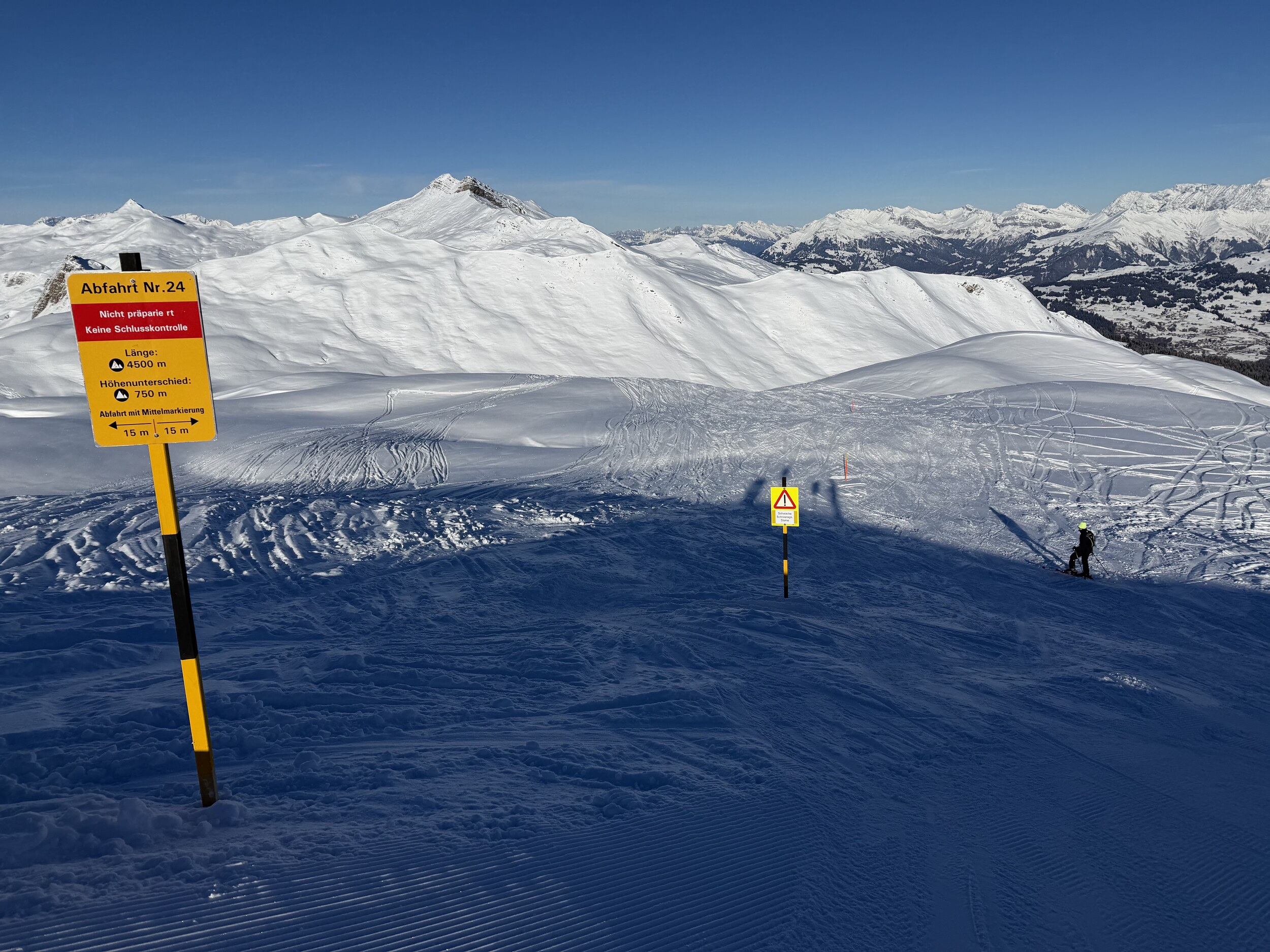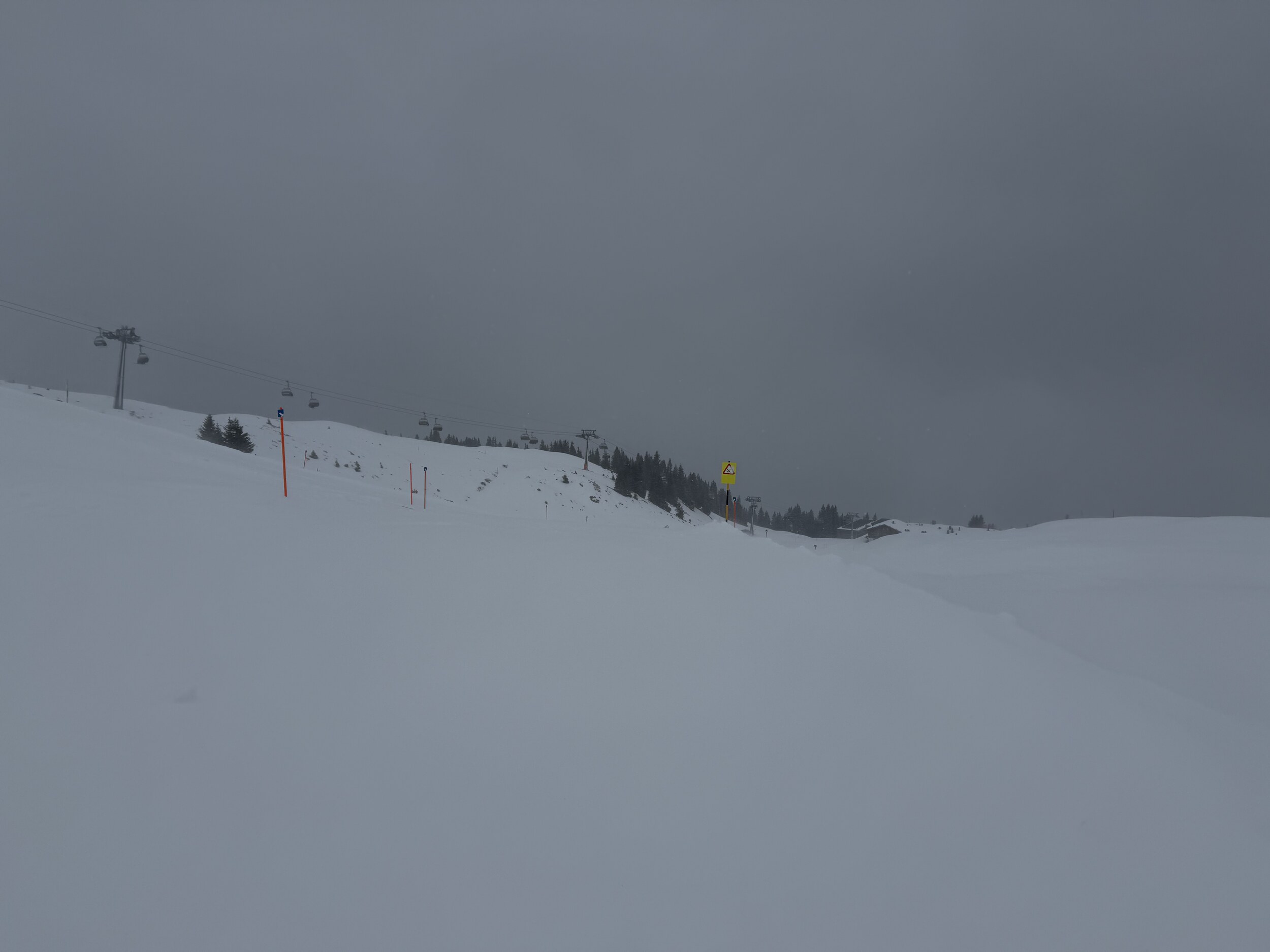 Die 24 weiterhin unpräpariert, hat aber genug Schnee: Der direkte Weg zur Schifergondel aber nicht gesteckt, offiziell wird Richtung Parsennabfahrt geführt: Auch am späteren Nachmittag weiterhin gute Bodensicht.