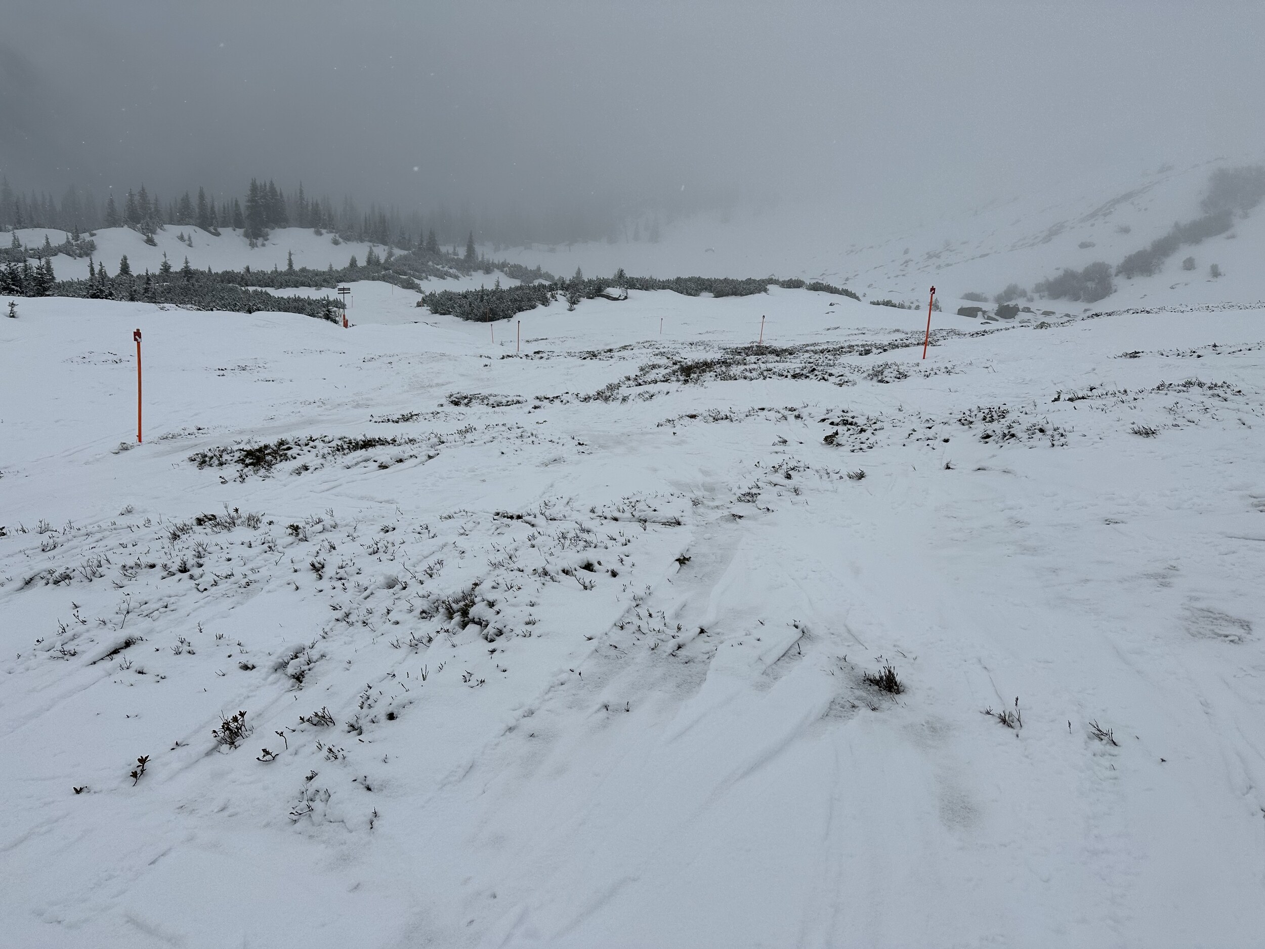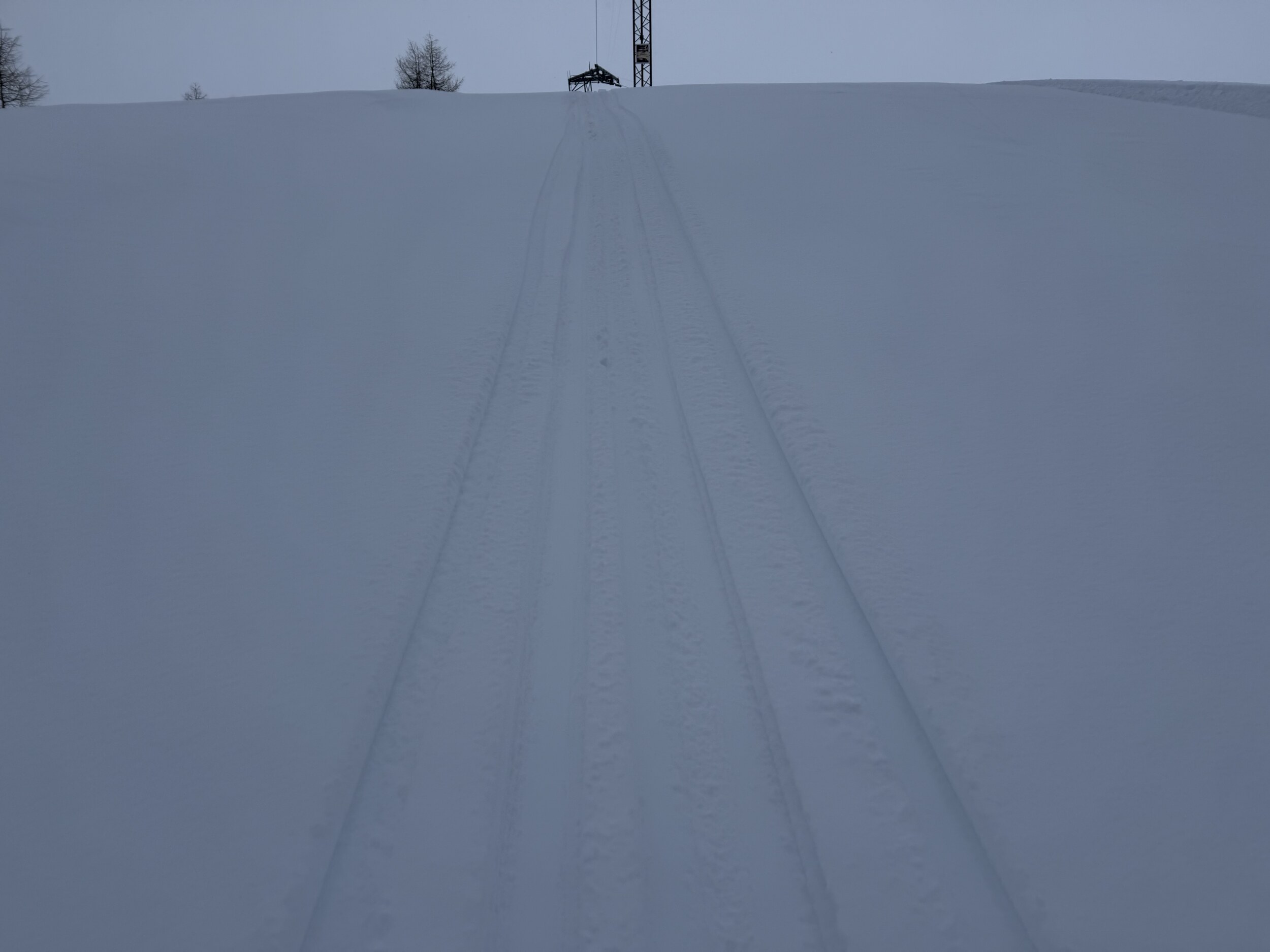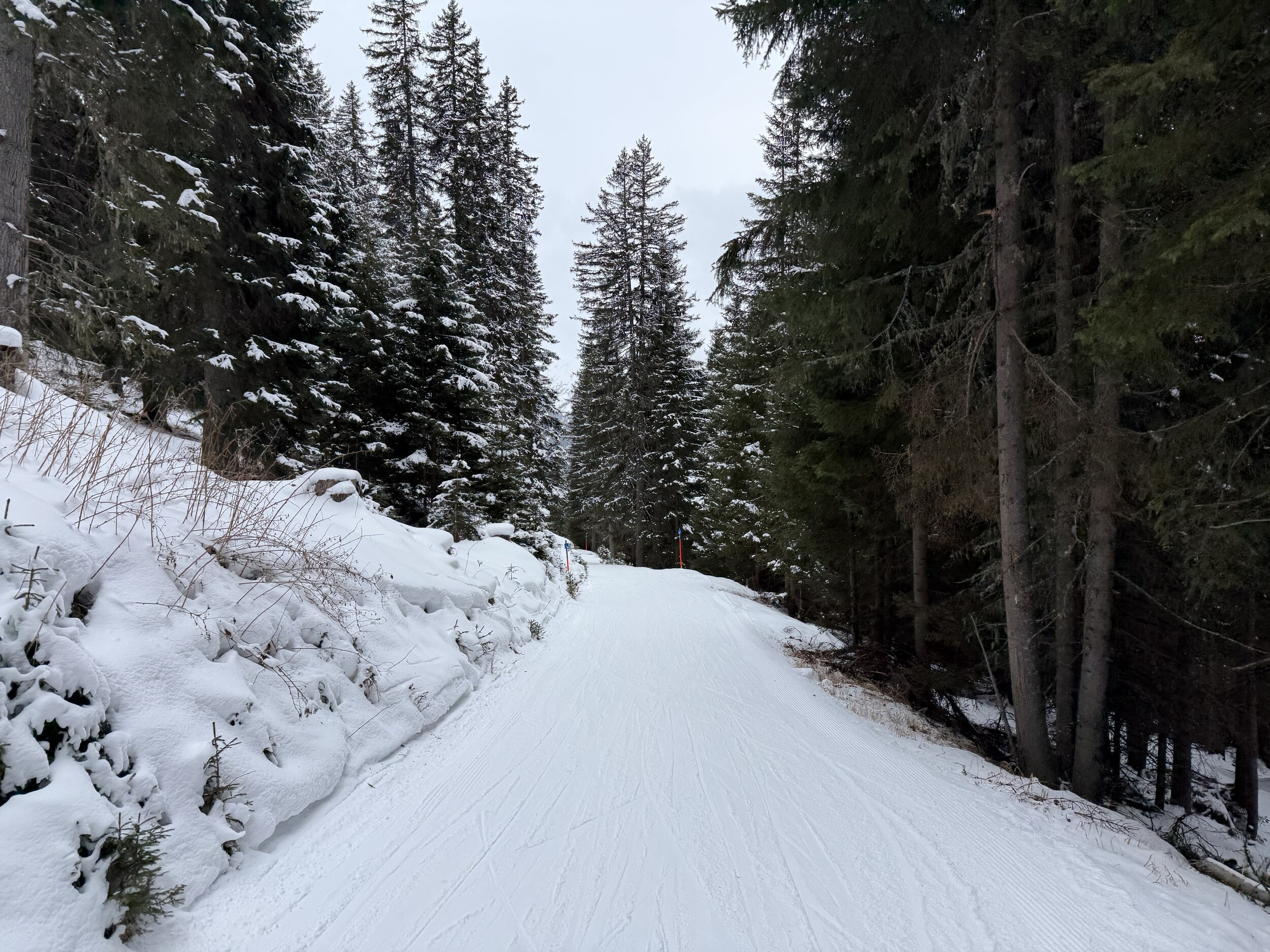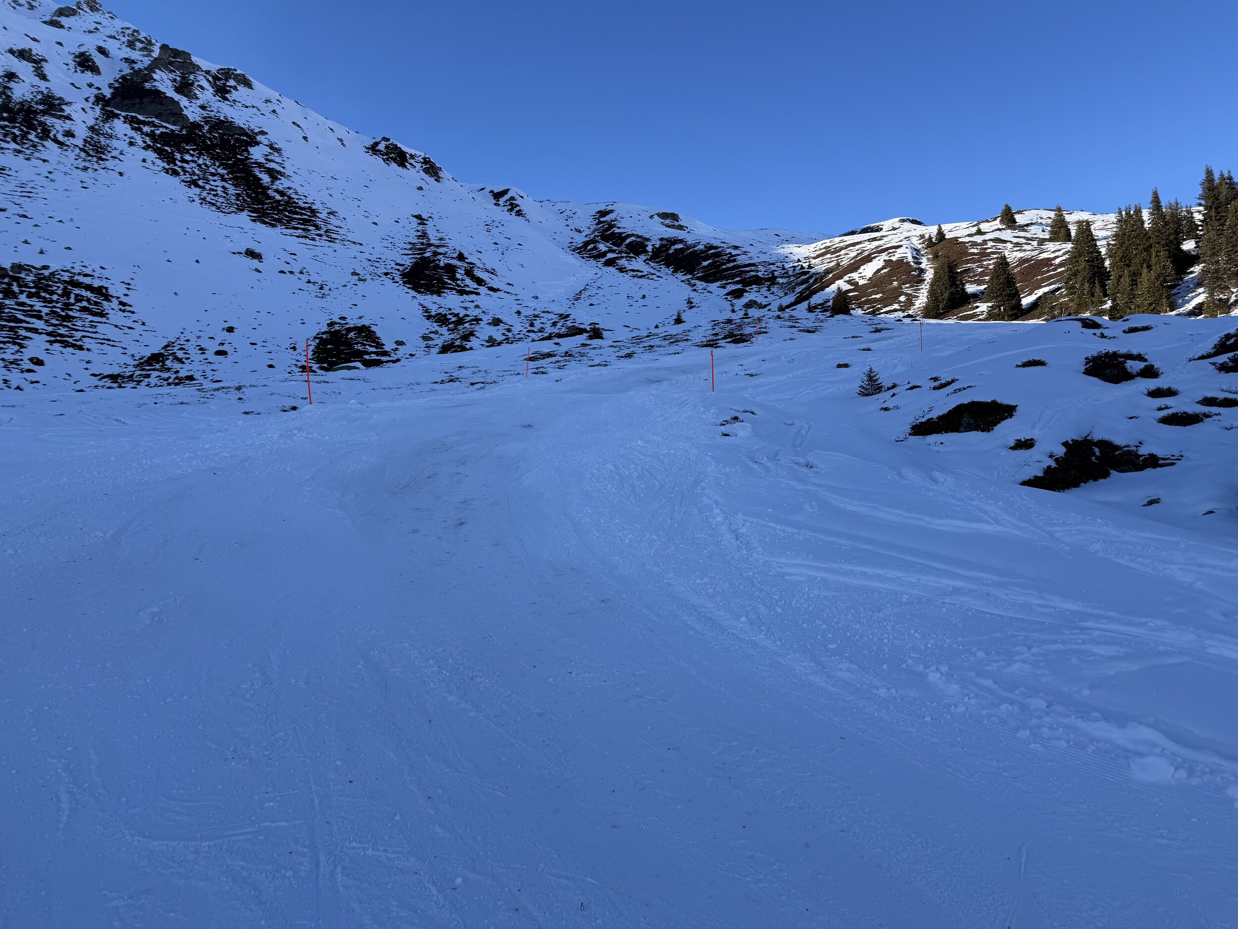 Ab der Abzweigung für die Talabfahrt ist alles wie gewohnt und präpariert: Der einzige Unterschied sind die neu roten Markierungen: Auch nach Schlappin alles in voller Breite, was sonst nicht immer der Fall ist.