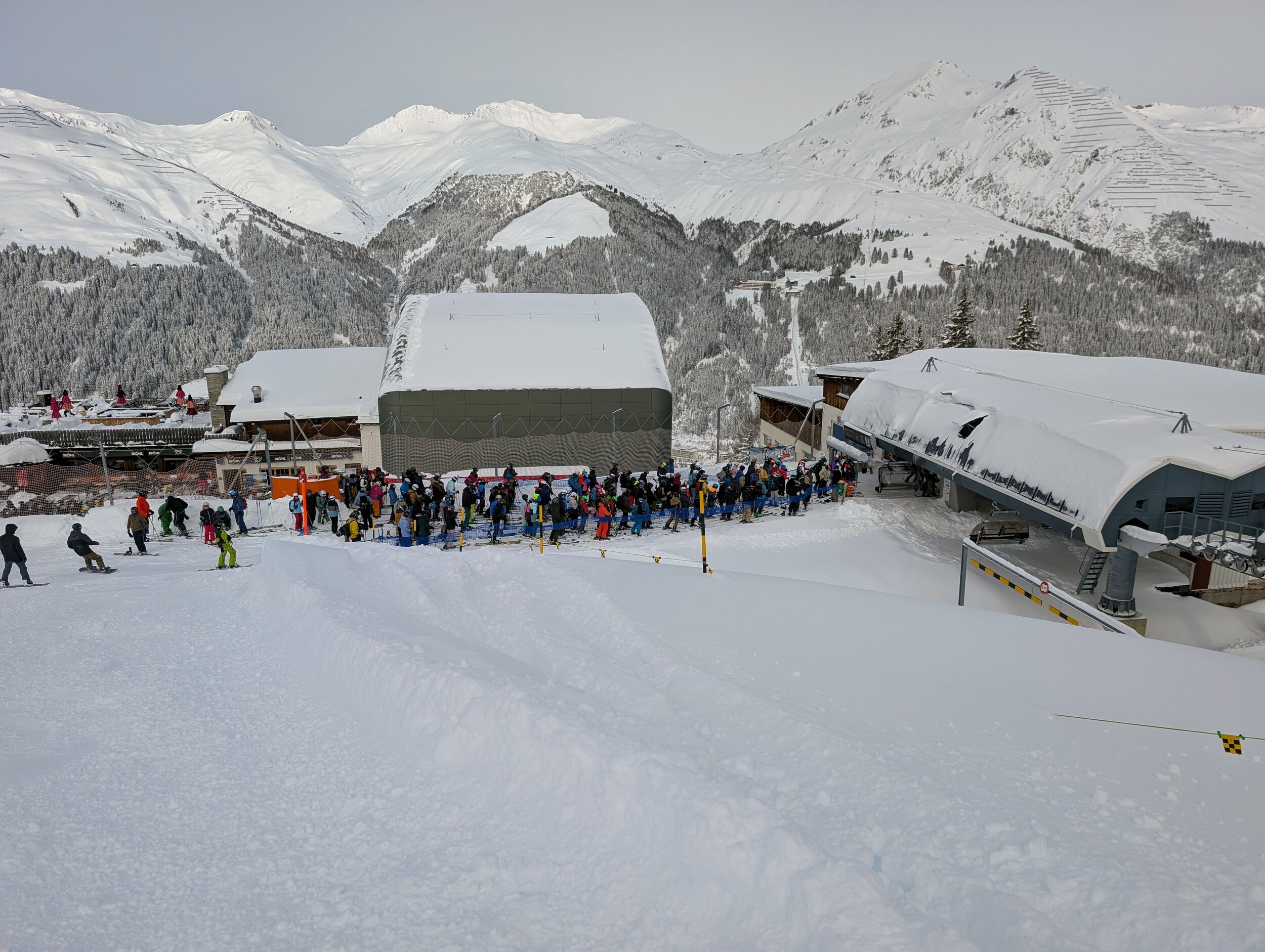 Unwissentlich war ich wohl in derselben Gondel wie hitparade um 8:11 ab Klosters. Edit 11:20 Anschliessend ging es via Kreuzweg zum Totalp-Sessel. Dort gab es bereits eine Schlange (wohl um die 5 min). Interessanterweise wurde die Singelline von niemandem benutzt, sodass ich direkt bis ganz nach vorne durch konnte.