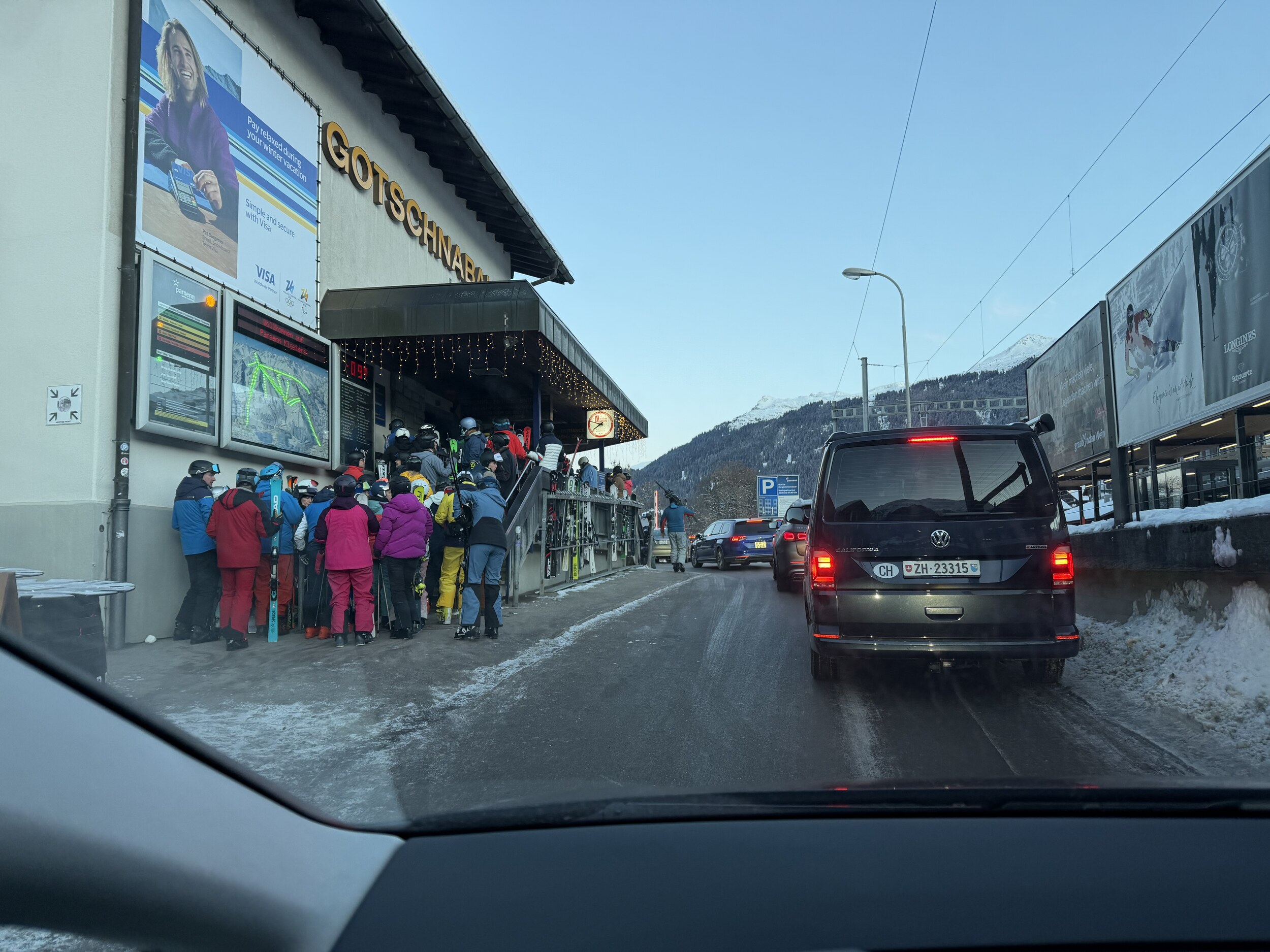 Heute bin ich mal wieder in Davos/Klosters unterwegs. Morgens um 8 gibt es (wie erwartet) bereits einiges an Leute in Klosters an der Gotschnabahn. Dank geschickter Positionierung im Zug (direkt an der Treppe zur Unterführung) muss ich jedoch nur 1 Gondel warten.