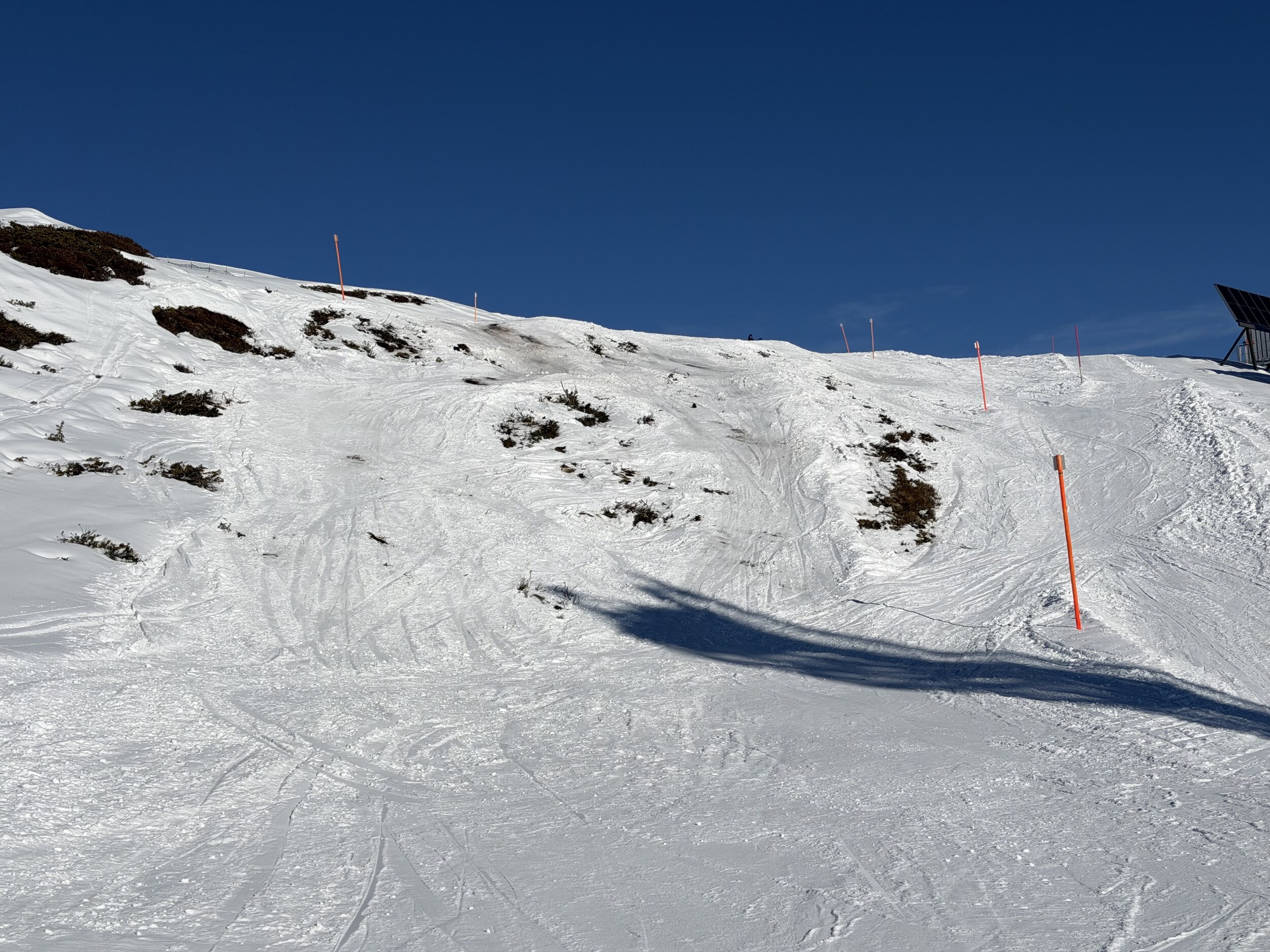 Die Direttissima braucht noch ein wenig Schnee: Blick zum Zügenhüttli: Dies ist die einzige heikle Stelle, wo die Vegetation rausschaut: Ich hab diesen Teil aber schon schlimmer erlebt, und da war die Piste offiziell offen.