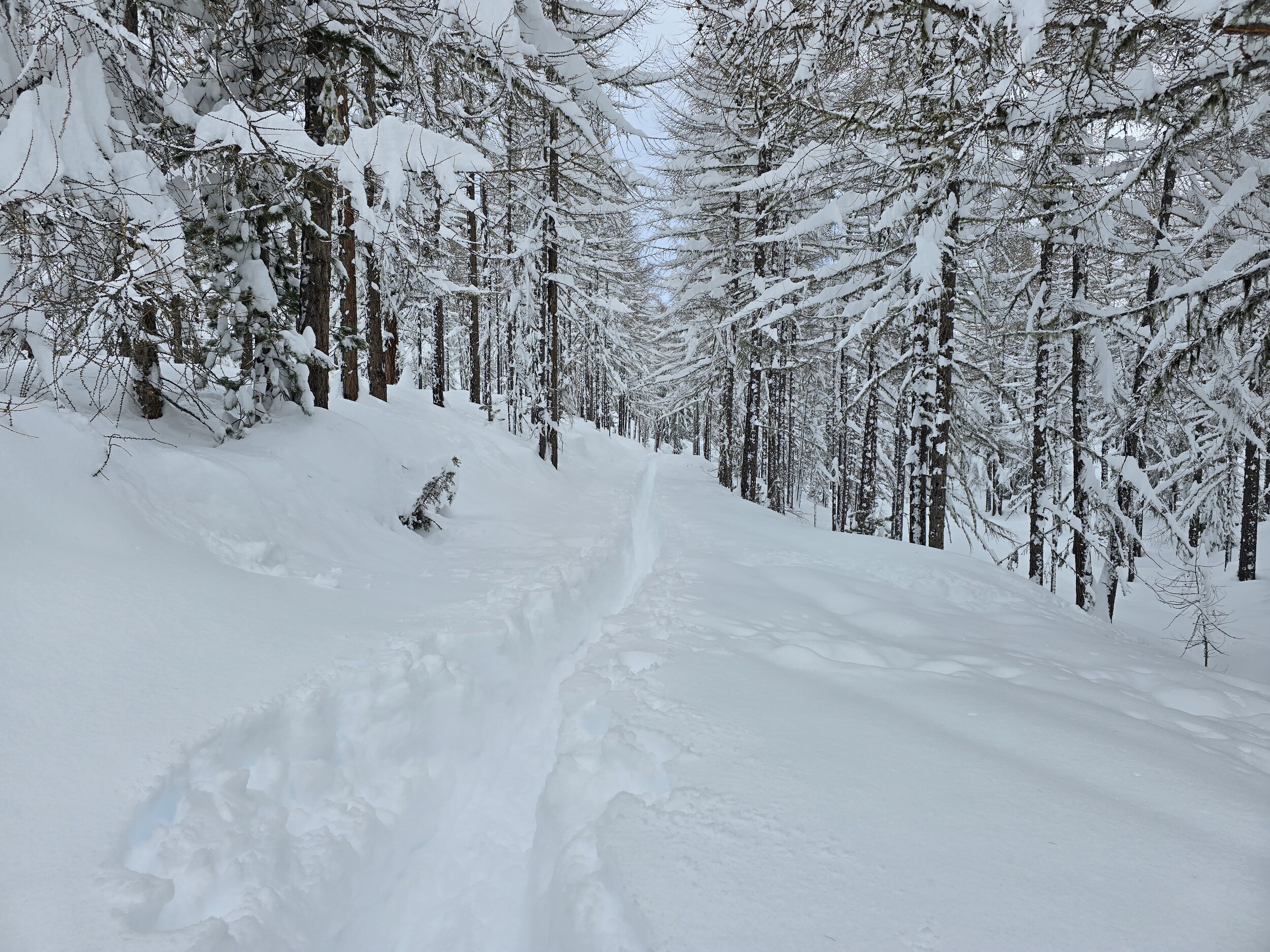 Nun die Talabfahrt die Sicht im Wald natürlich besser, mittlerweile hat aber starker Schneefall eingesetzt.