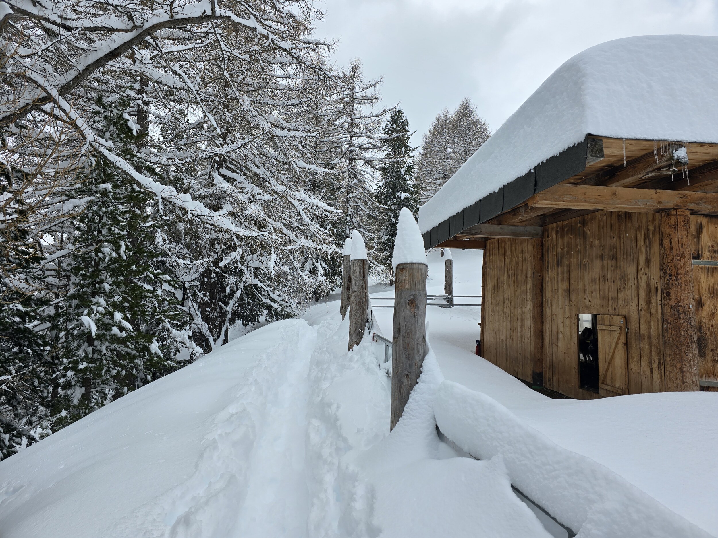 Die Neuschneemassen sind wirklich beeindruckend. Mangels alternative sind zu Fuss zum Melchboden oberhalb von Saas-Fee. Der Spaziergang durch den tief verschneiten Wald war schön aber anstrengend. Auch wenn grösstenteils bereits vorgespurt war, sind wir immer wieder etwas eingesunken. Links und rechts der Spur stand der Schnee teilweise hüfthoch.
