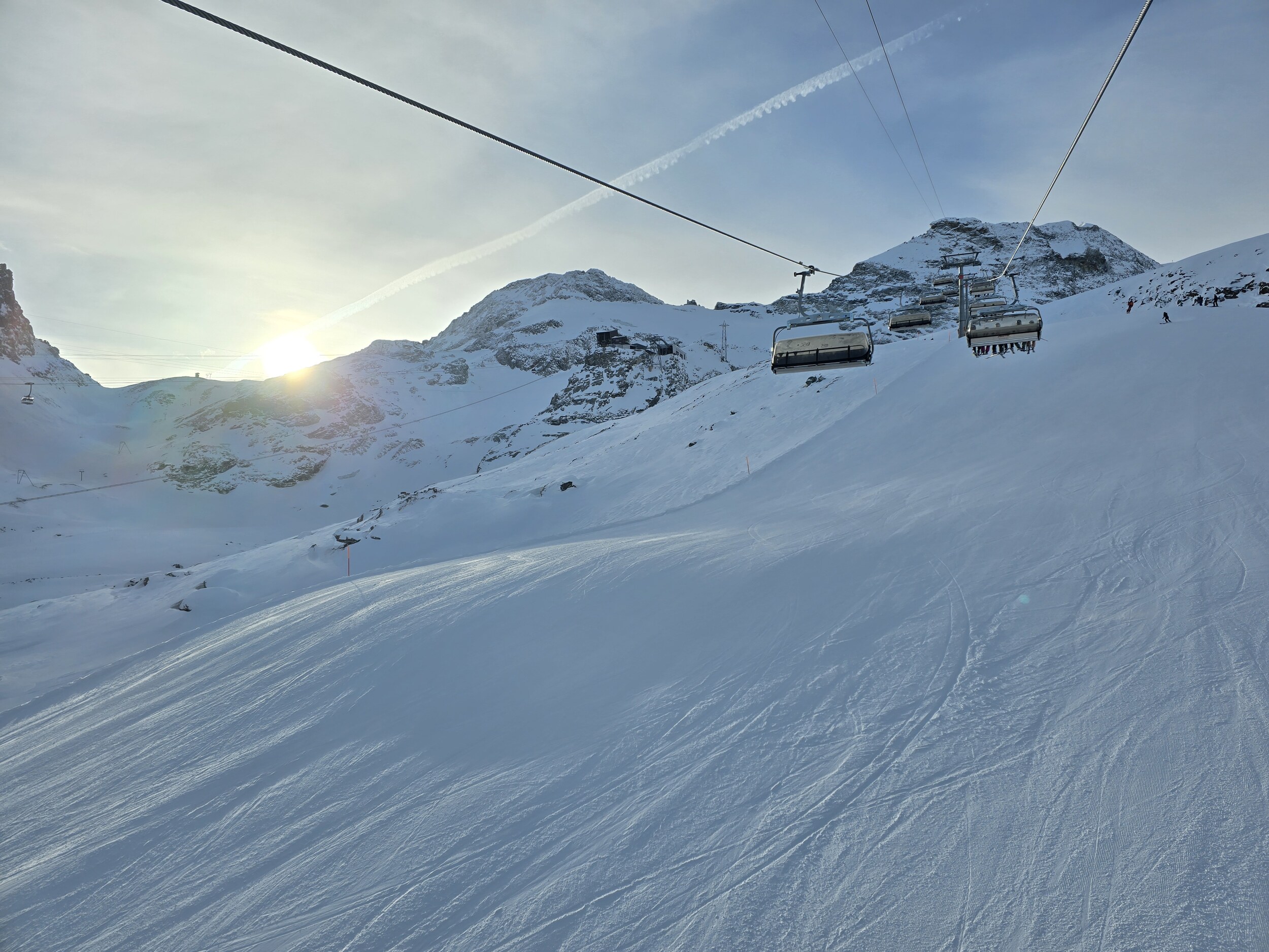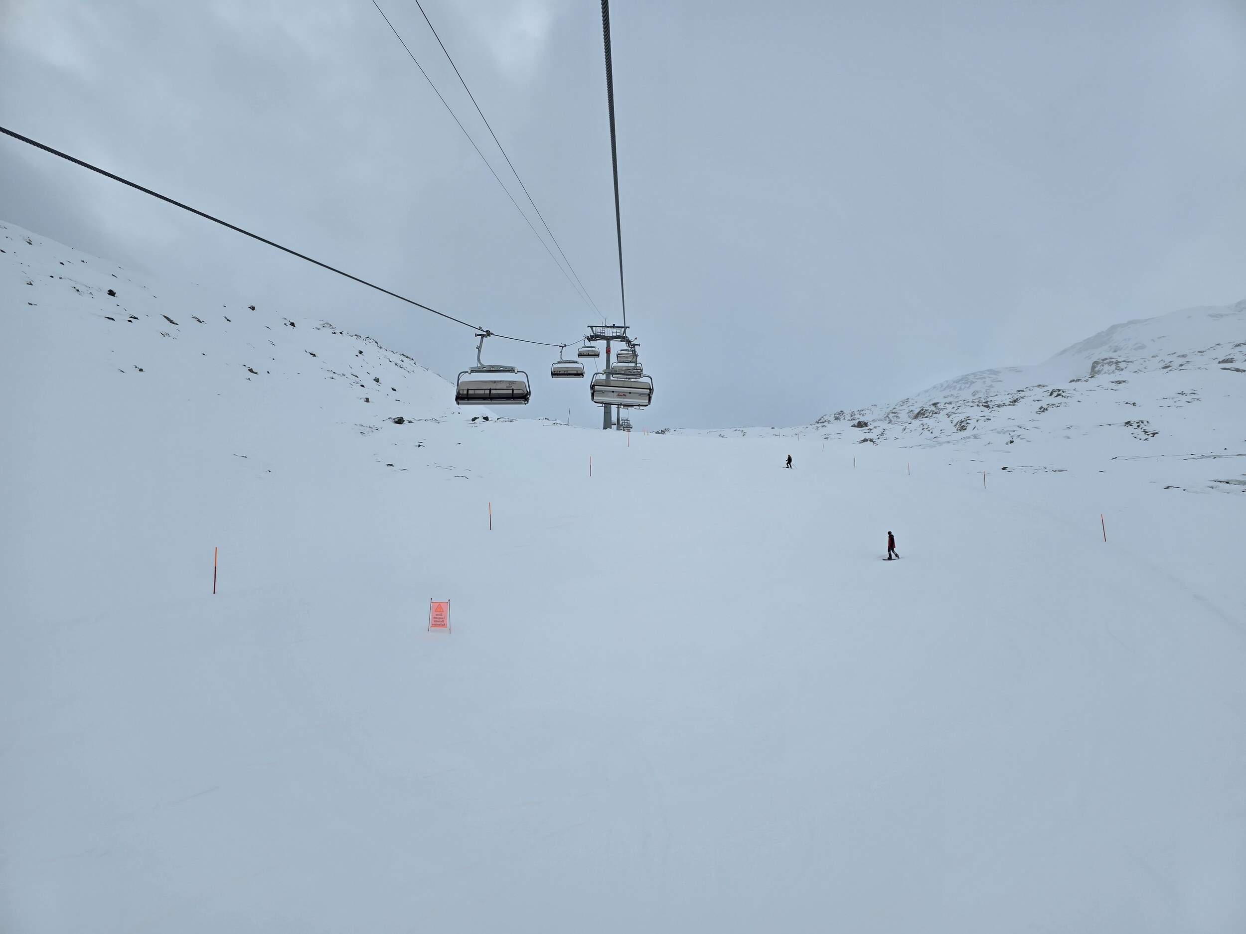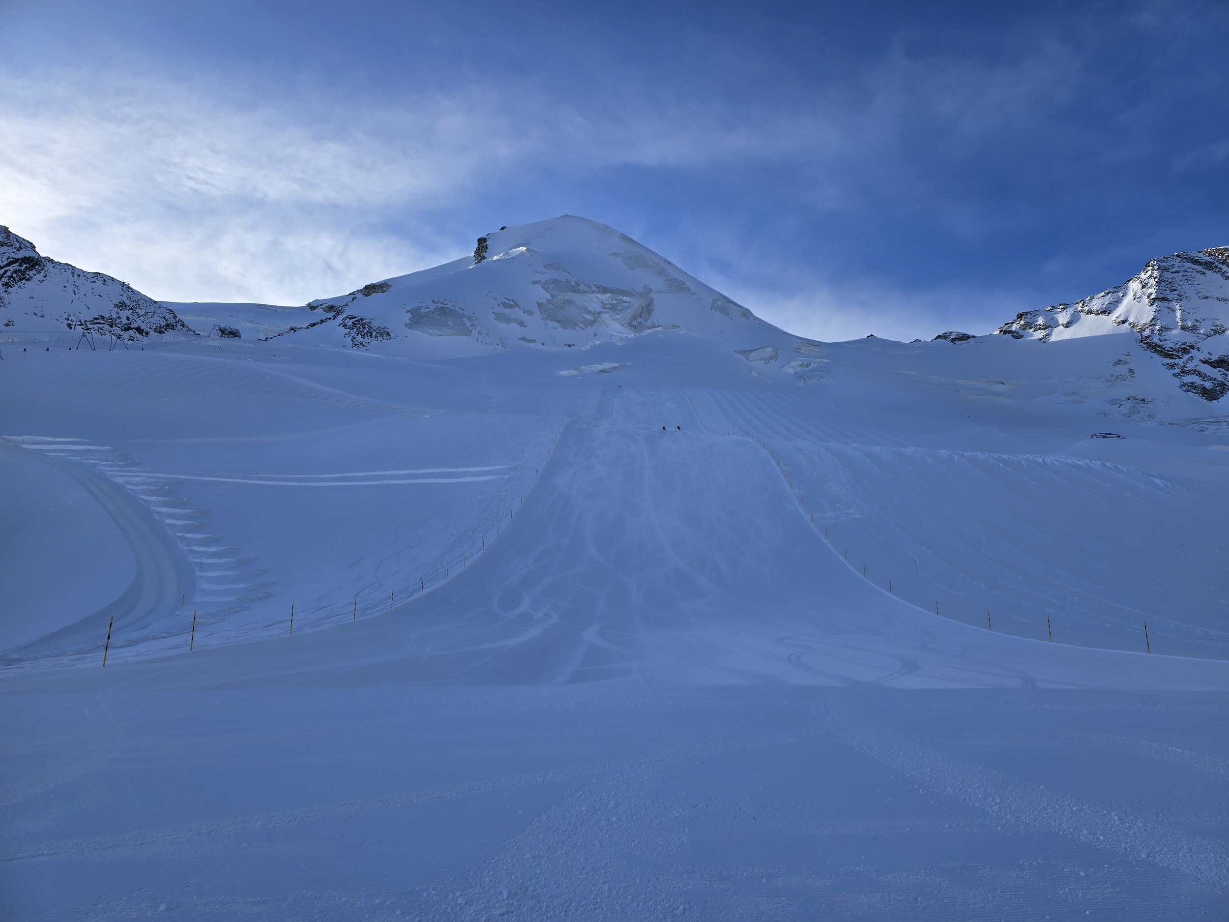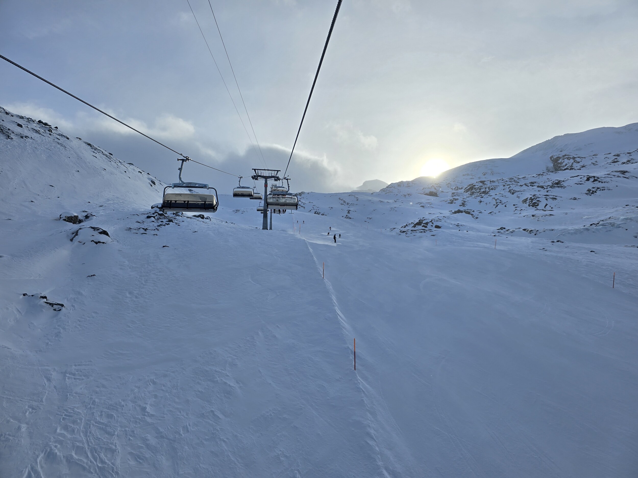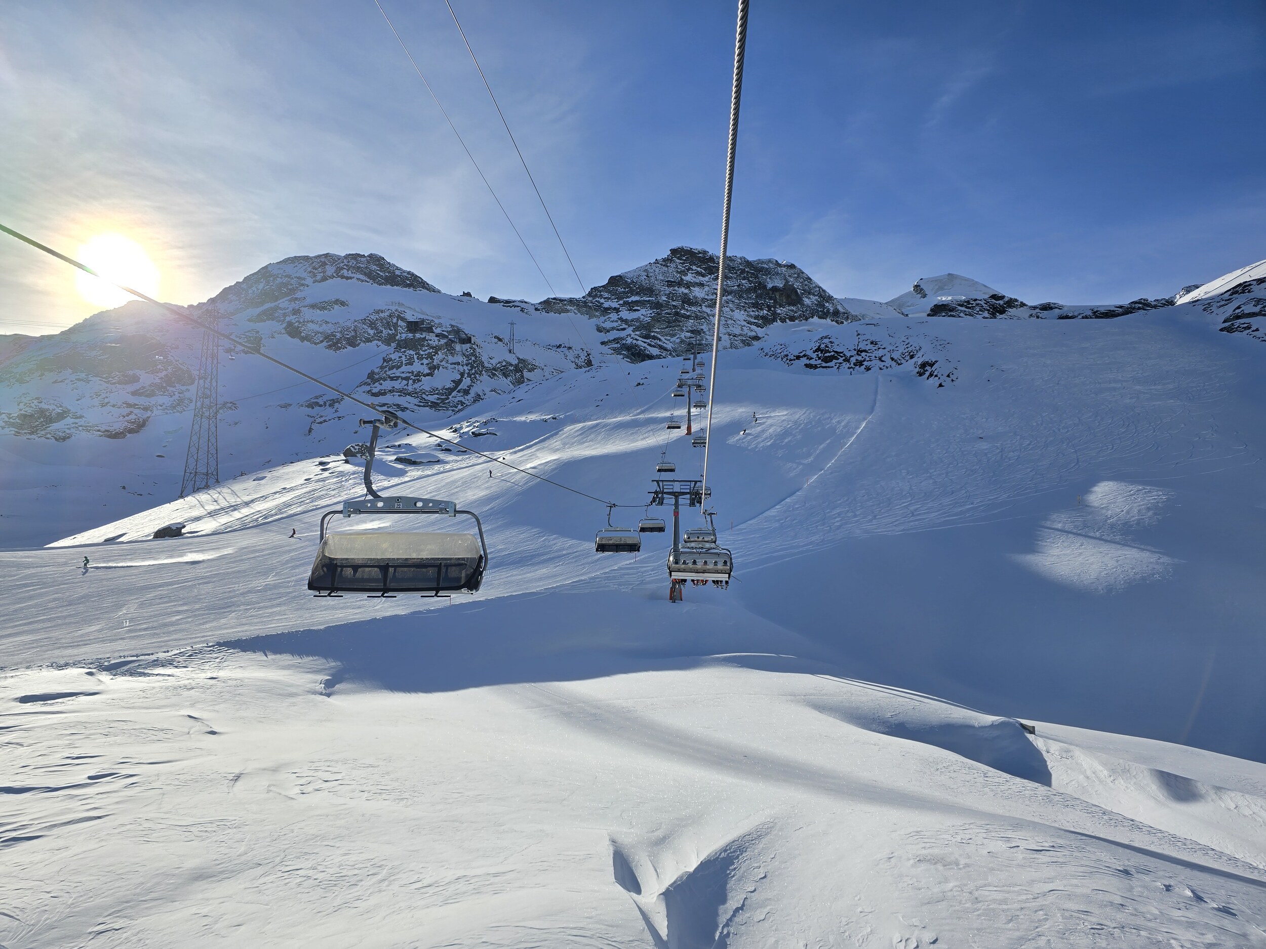 Wir gehen als erstes hoch auf den Gletscher. Oben ist es ziemlich kalt heute. Leider sind die oberen Lifte zunächst noch nicht bereit, sodass wir zuerst an den unteren Liften fahren, bevor wir hoch wechseln können. Die Pisten oben sind ziemlich knollig. Frisch präpariert ist es noch ok zu fahren, die Piste lässt aber rasch nach.