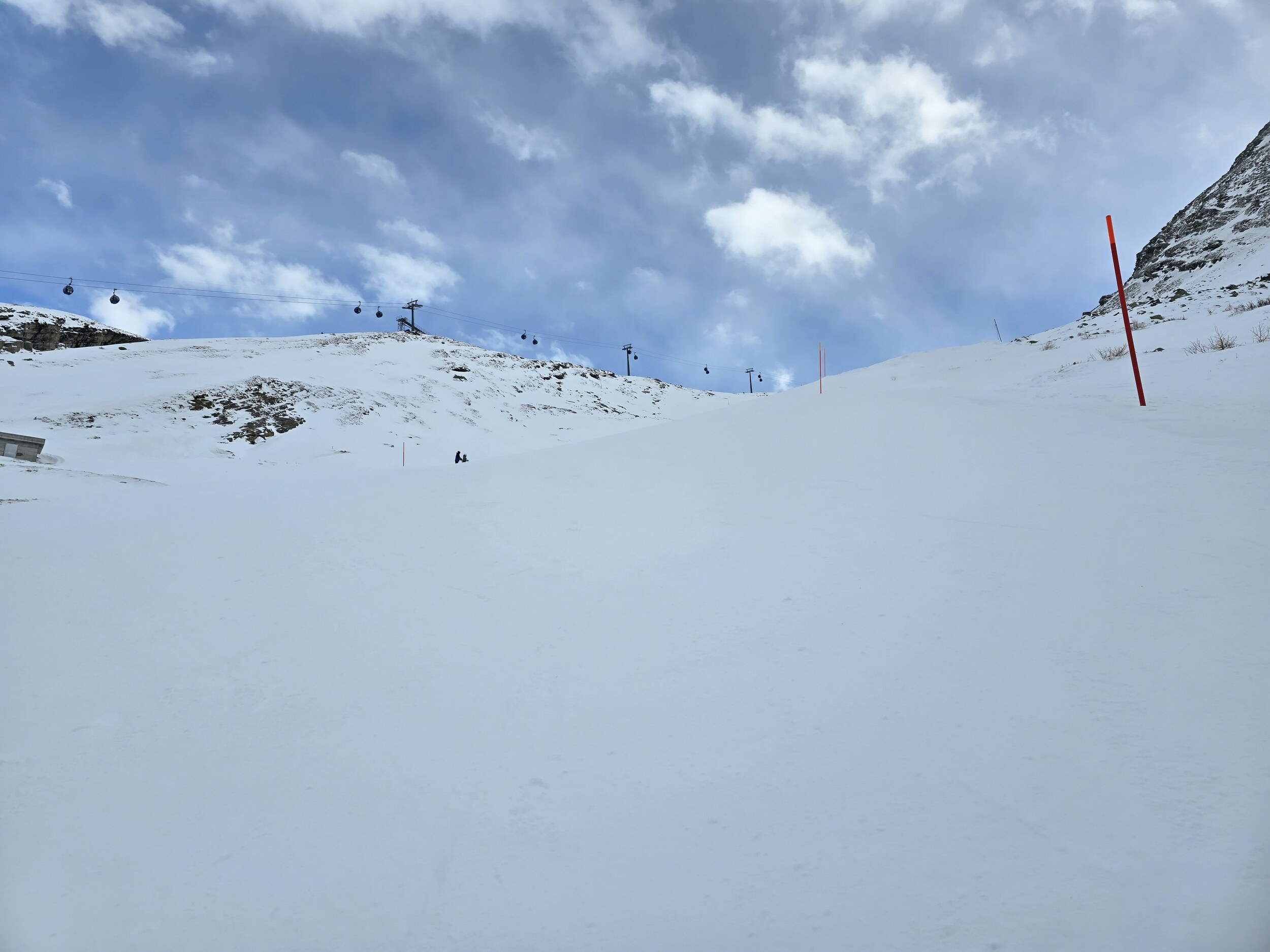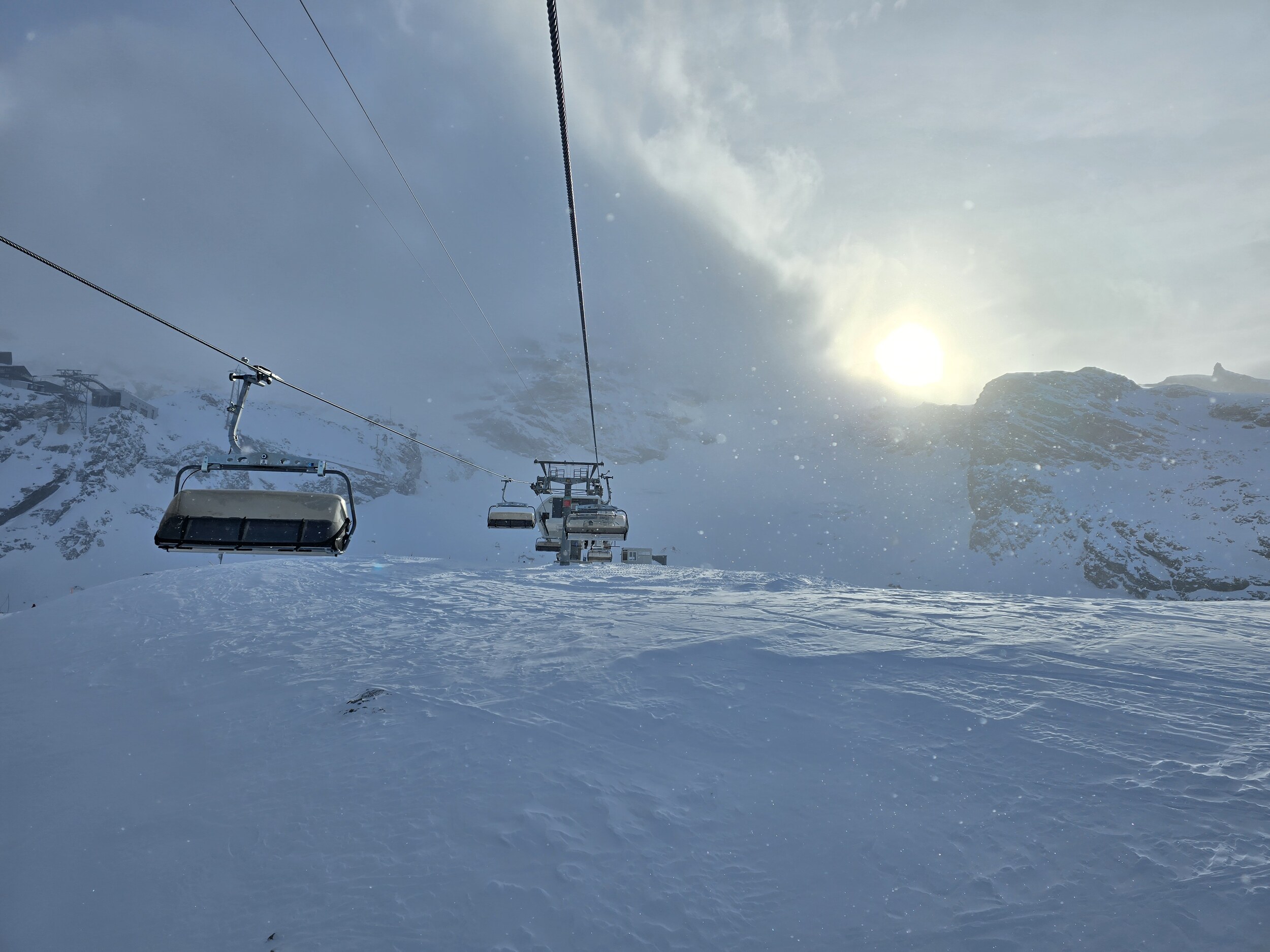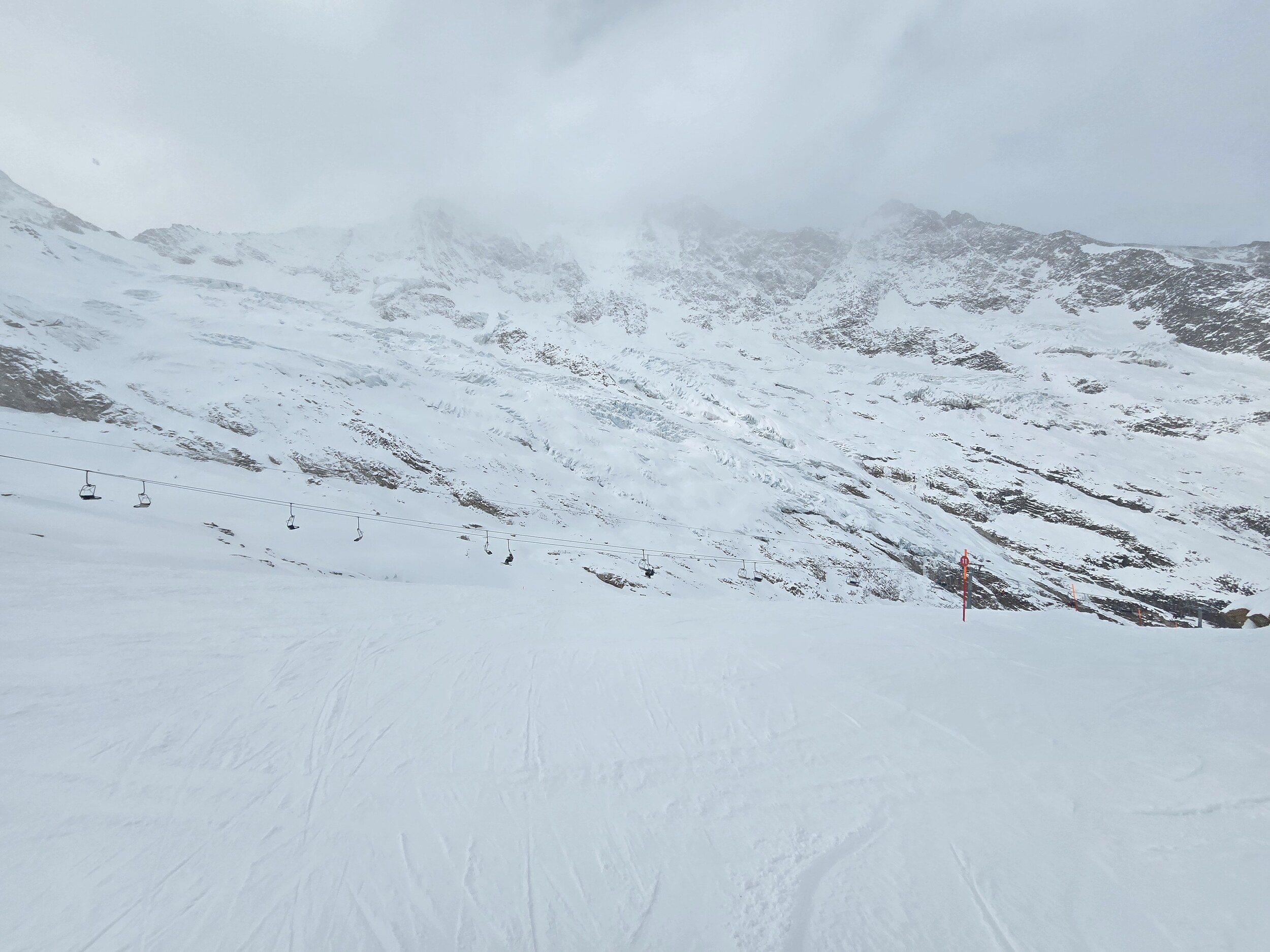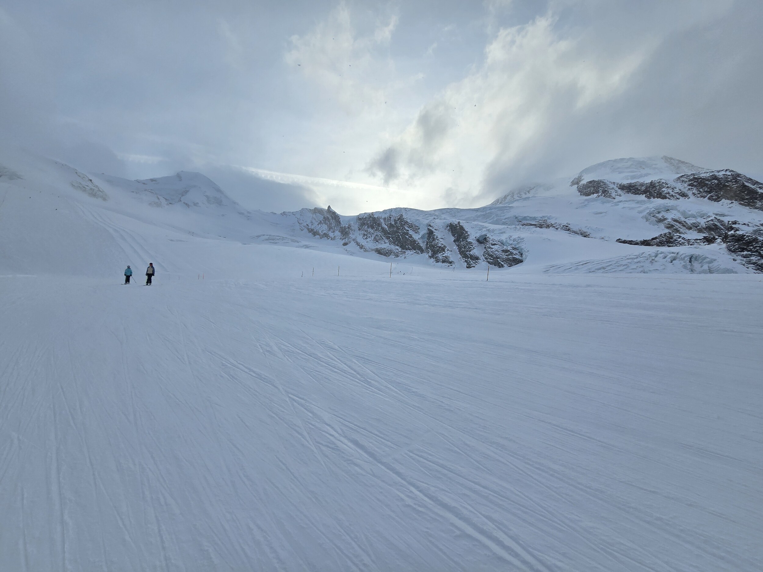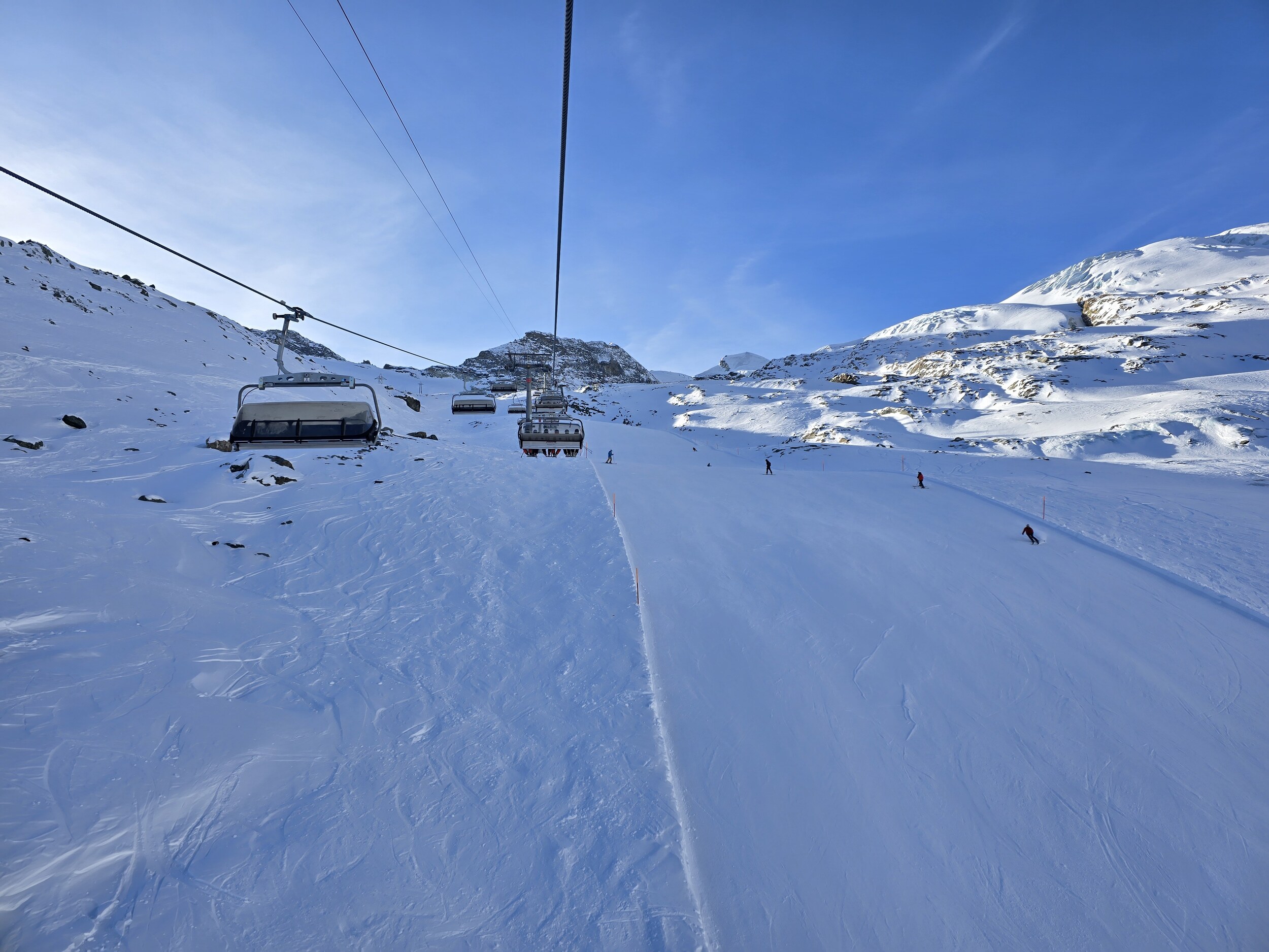 Wir gehen als erstes hoch auf den Gletscher. Oben ist es ziemlich kalt heute. Leider sind die oberen Lifte zunächst noch nicht bereit, sodass wir zuerst an den unteren Liften fahren, bevor wir hoch wechseln können. Die Pisten oben sind ziemlich knollig. Frisch präpariert ist es noch ok zu fahren, die Piste lässt aber rasch nach.