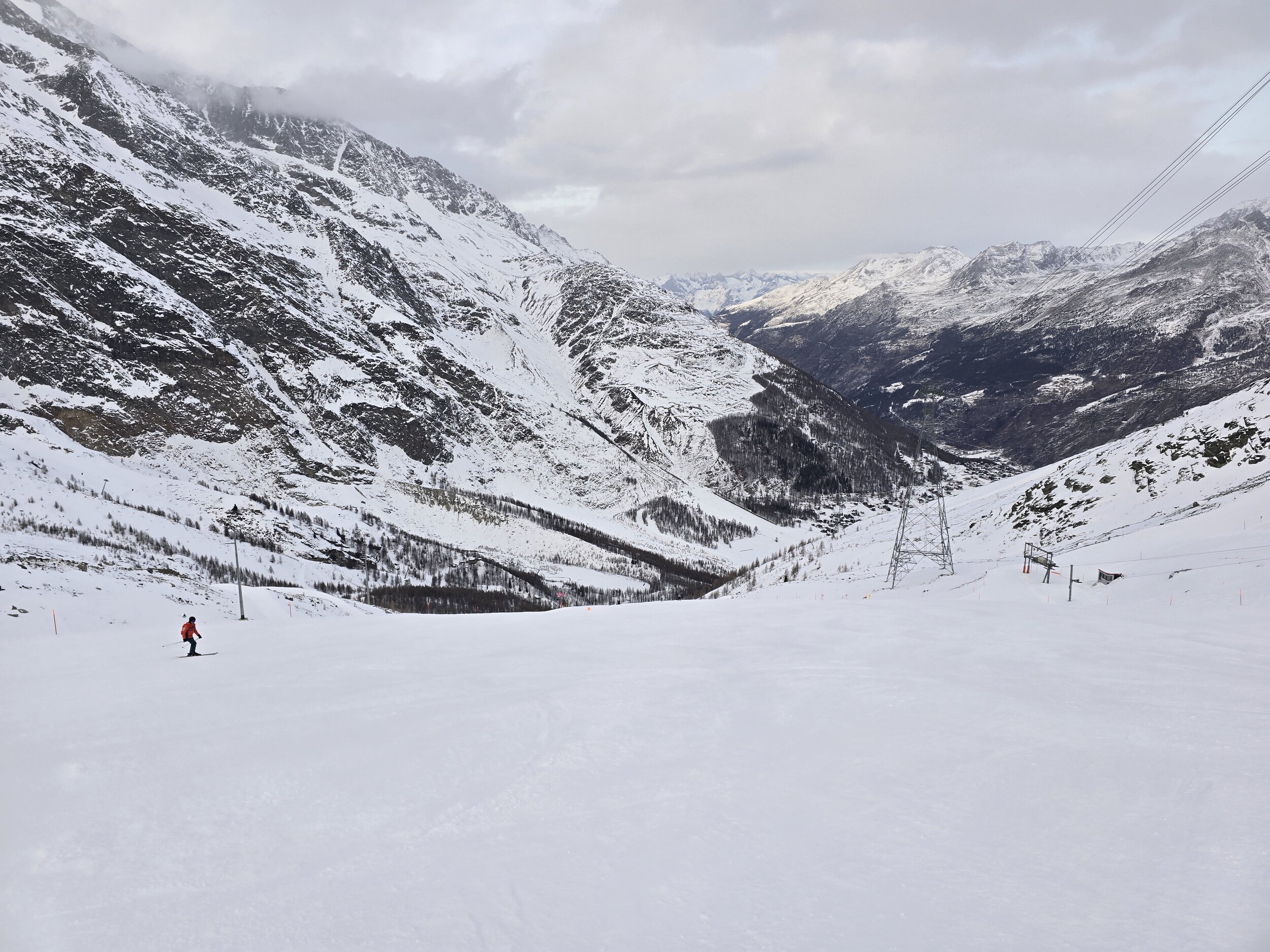 Recht schattig und hart am morgen, nur ganz oben ist es sonnig. Präparierung so la-la, einige Versätze. Traverse: Der Hang danach war unangenehm glatt. Im sonnigen Teil war es deutlich besser: Furggu SL oben, der Lift war etwas anstrengend zu fahren. Tiefenblicke Richtung Monte Moro: Am Ende der roten Talabfahrt: So richtig prickelnd war es nicht. Aber Almagell hat noch einen Vorteil: nur 5 CHF Parkgebühren pro Tag und der Bus nach Saas-Fee fährt vormittags im 15min-Takt, braucht 15min und fährt direkt zum Alpinexpress. Die braucht man auch zu Fuss vom Parking oben.