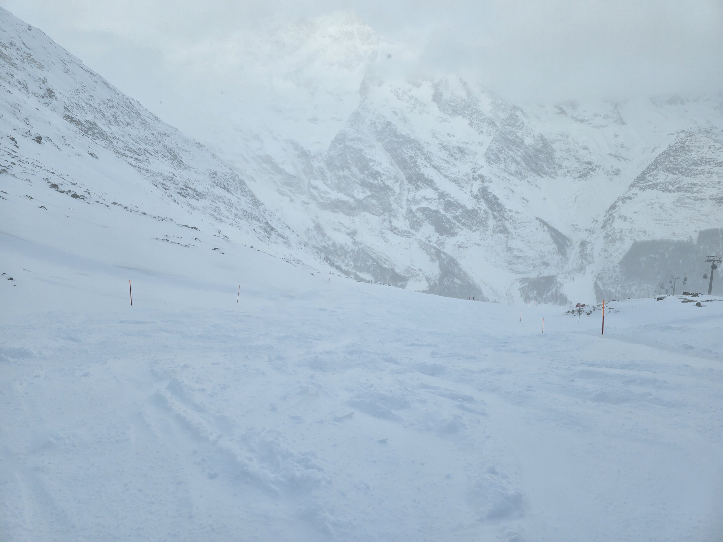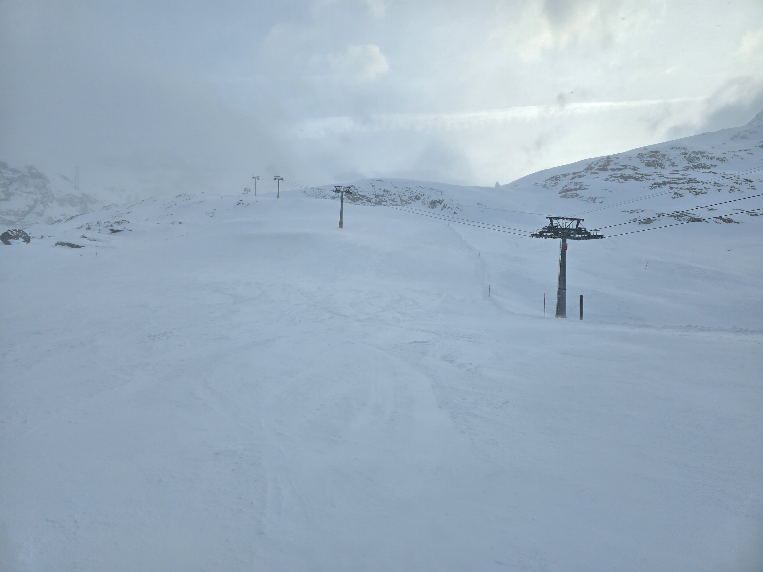 Nach der etwas verspäteten Mittagspause zeigte sich zunächst noch teilweise der blaue Himmel, die Bodensicht am Plattjen wurde aber zunehmend schlechter. Dennoch sind wir noch kurz auf den Gletscher hoch. Die Sicht war zwar wie erwartet schlecht, die Pisten aber in hervorragendem Zustand, sodass die zwei Abfahrten oben dennoch Spass machten. Zum Schluss wurde die Bodensicht auf der Talabfahrt ab Morenia nochmals erstaunlich gut. Zudem war die Piste auch Abends noch in hervorragendem Zustand. So waren nochmals einige gute Carving-Schwünge möglich. Die Abfahrt machte so viel Spass, dass wir nochmals mit dem Alpin-Express hoch sind. Dannach war aber auch dort Betriebsschluss.