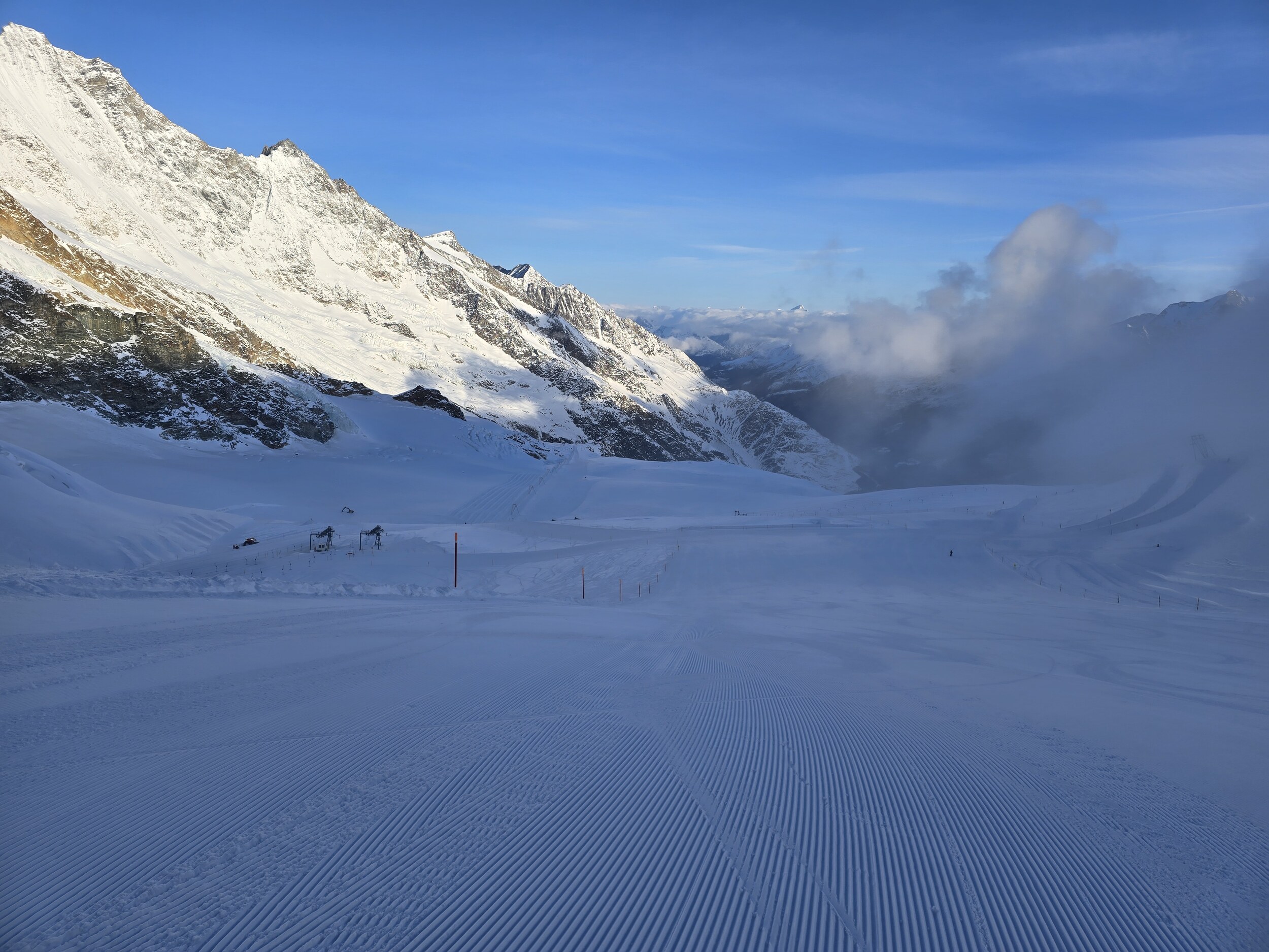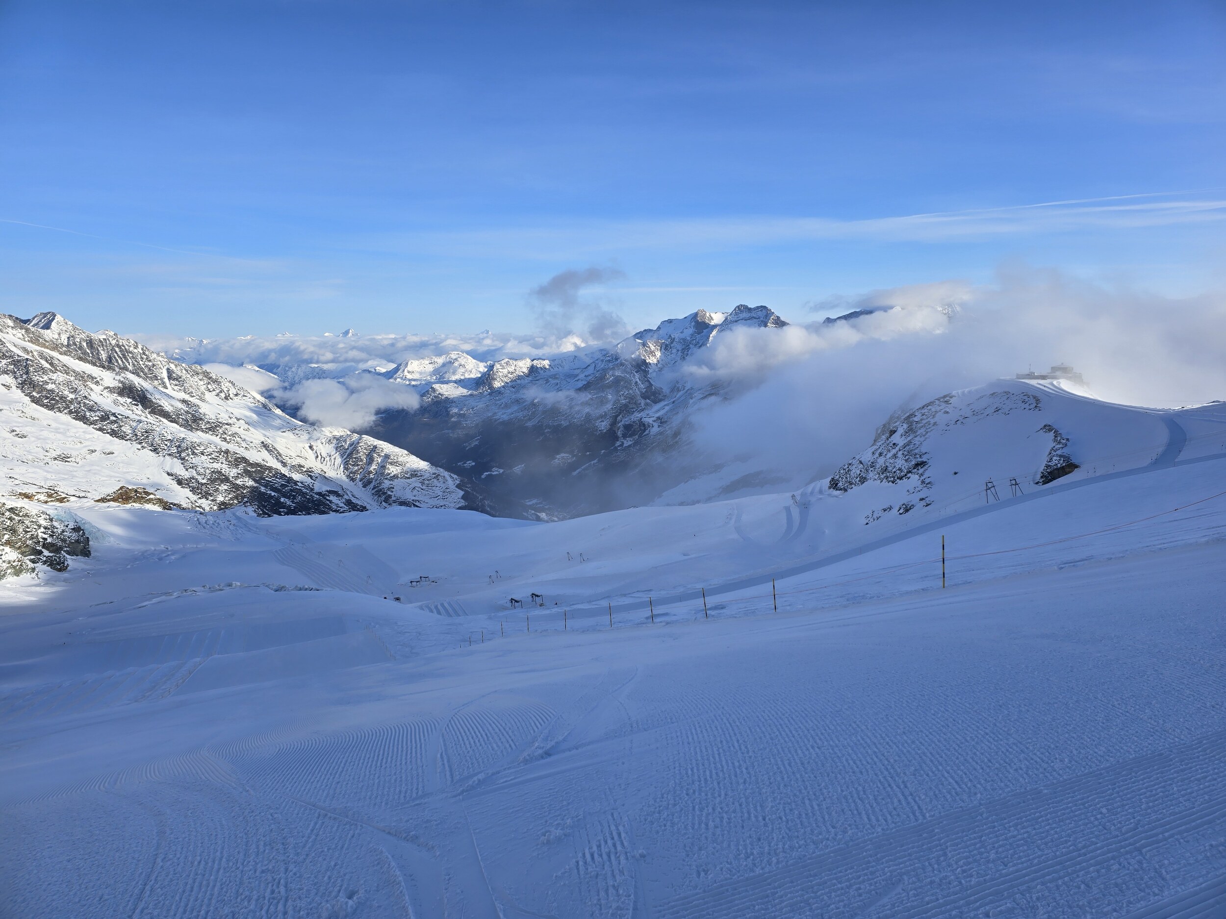 Heute der letzte Tag in Saas-Fee für mich. Das Wetter ist gut, jedoch drücken die Wolken von Süden ziemlich rein. Somit ist es im Bereich Morenia eher grau, sonst herrscht blauer Himmel.
