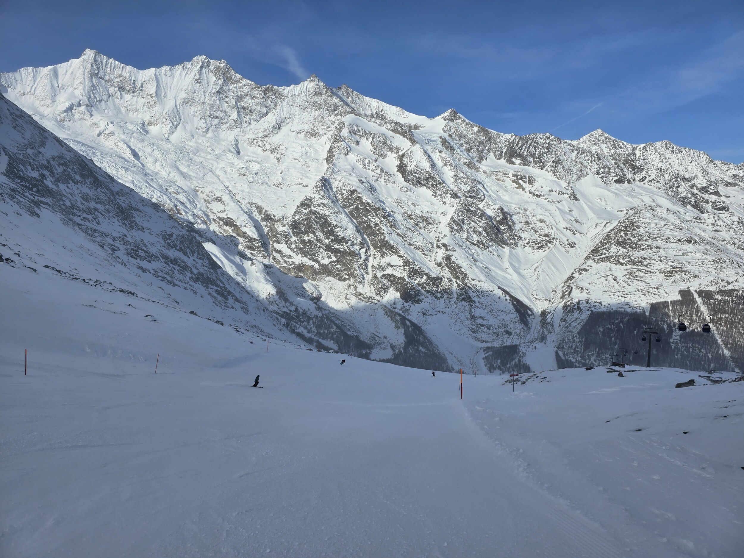 Ich war heute erneut in Saas-Fee. Die Verhältnisse sind nach wie vor ausgezeichnet, das Wetter besser als vergangenen Sonntag. Los war etwas mehr: Morgens nach 9 Uhr 15 Minuten Wartezeit im Tal beim Alpin Express. Danach allerdings den gesamten Tag durch keine nennenswerten Wartezeiten, d.h. nie mehr als wenige Sessel oder Bügel.