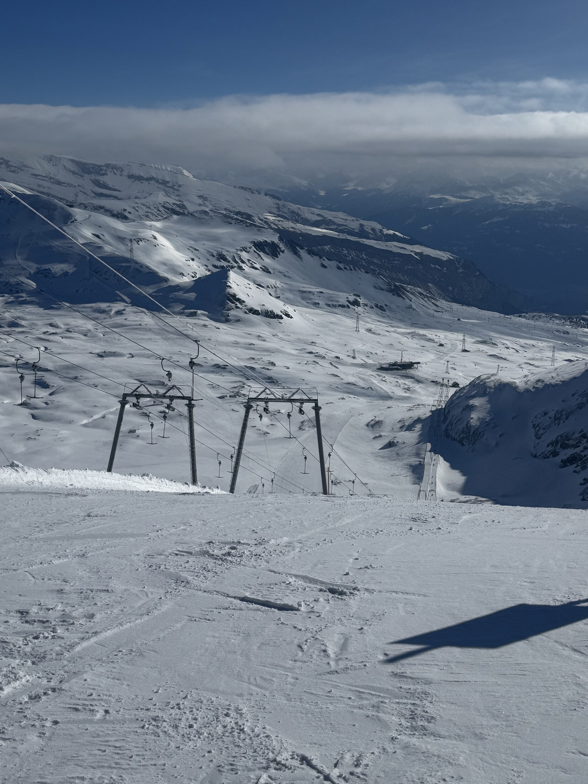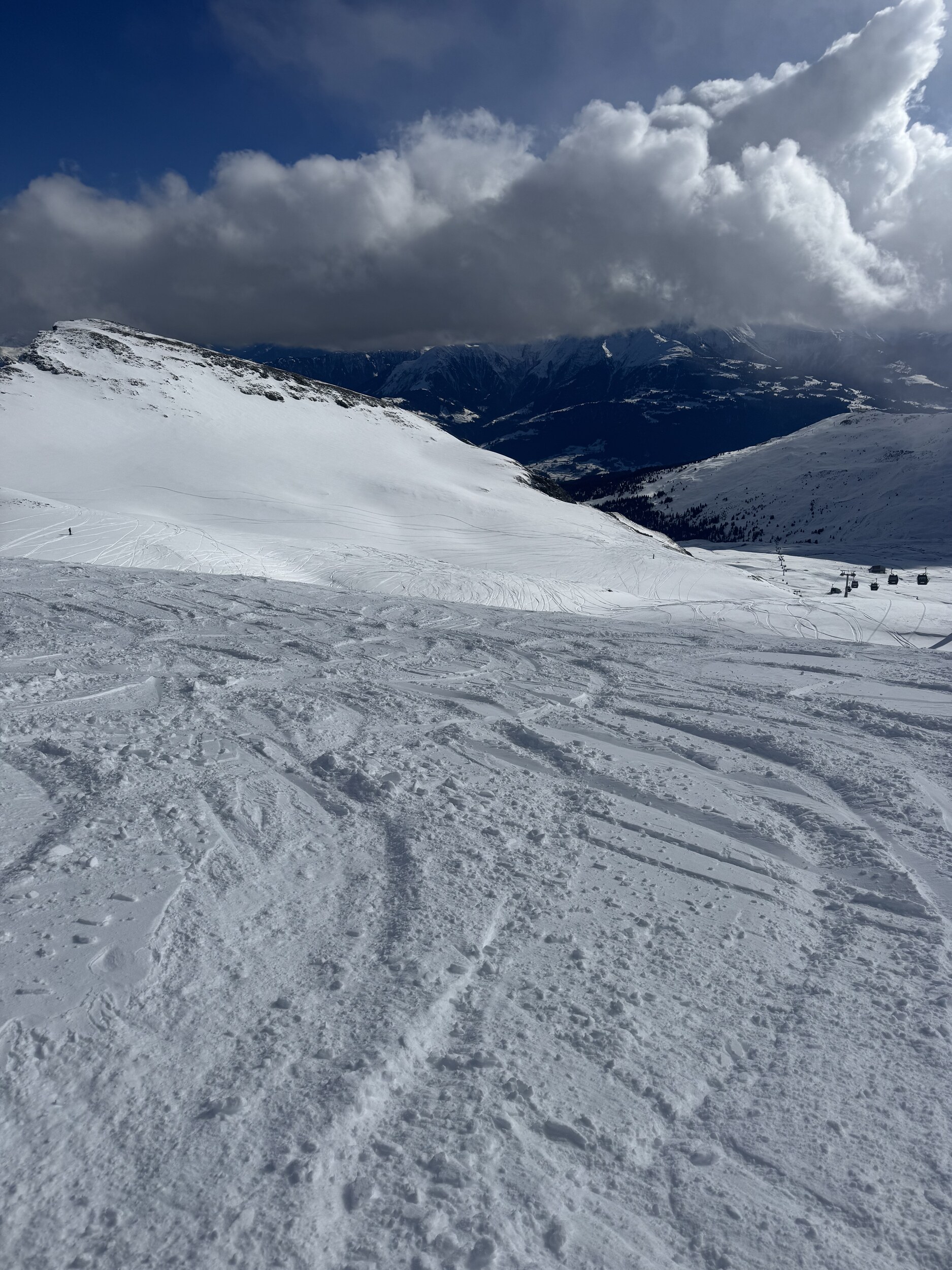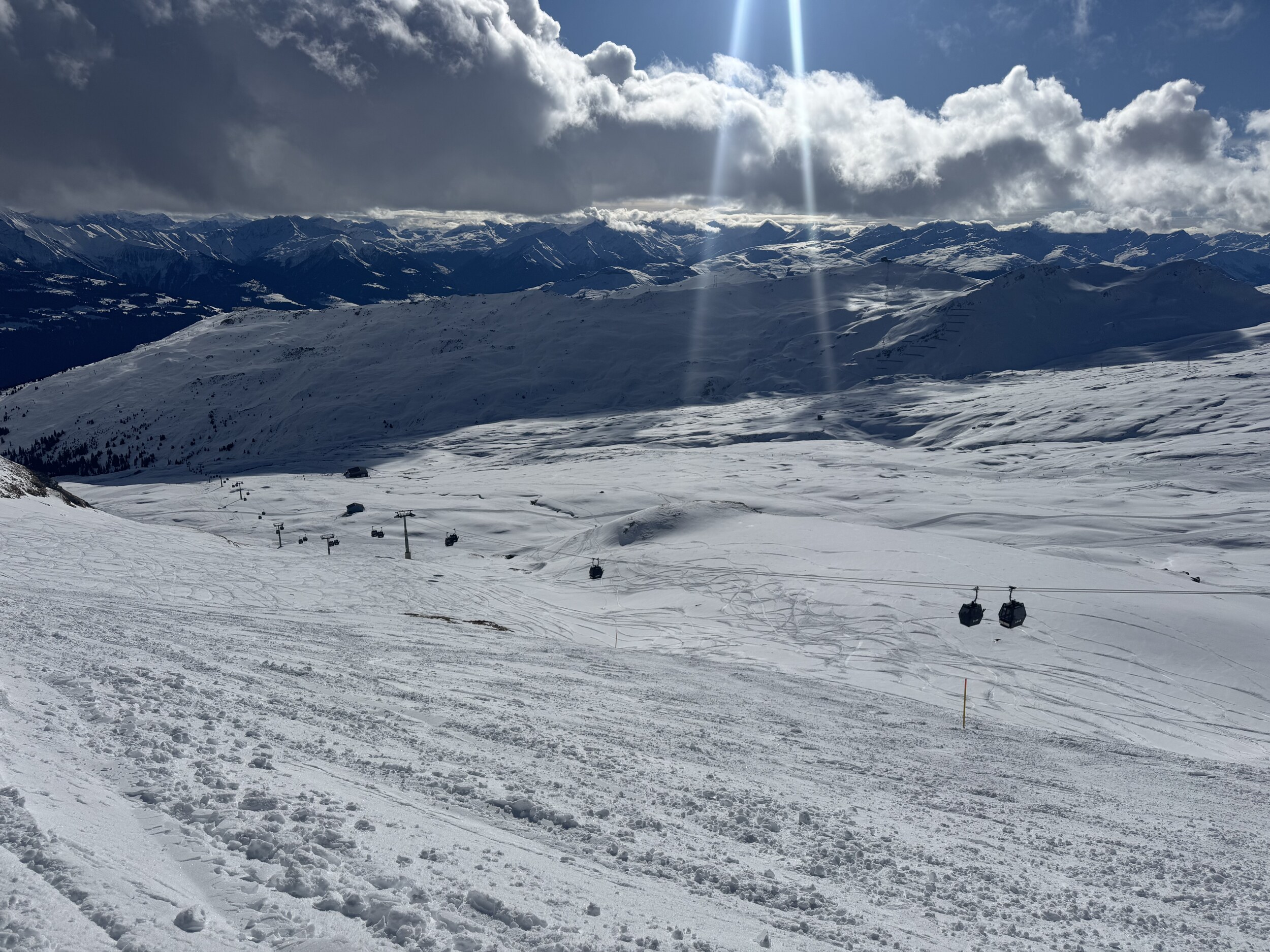Danach die 66 nach Plaun, es gab überraschenderweise keine Wartezeiten am Arena Express nach Nagens und am Muotta Sessel. Man konnte sehen wie sich im Süden die Wolken über die Berge beim Piz Terri schieben: