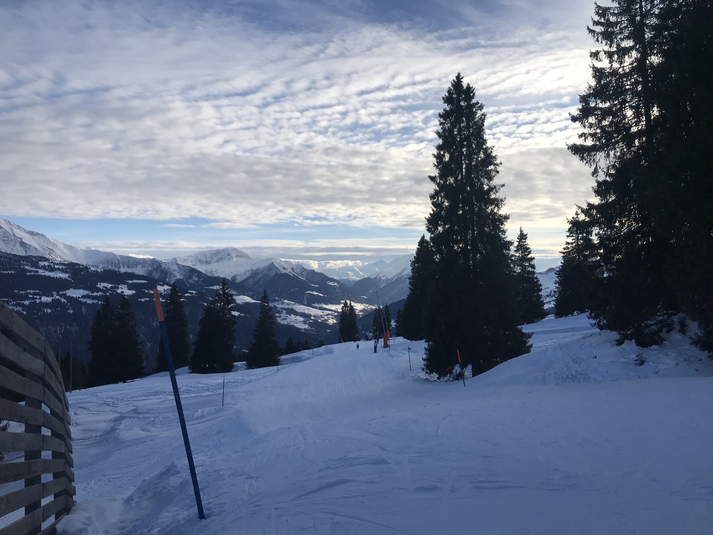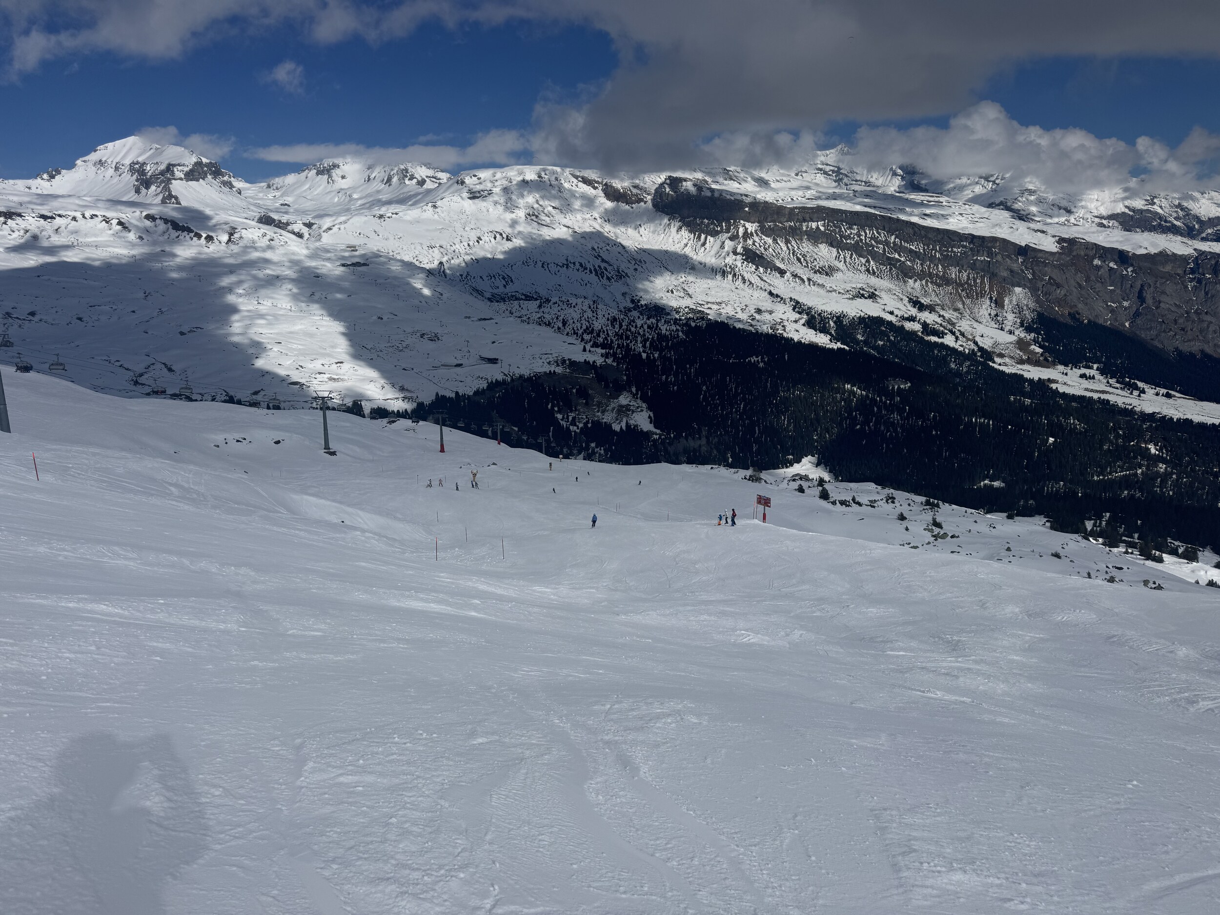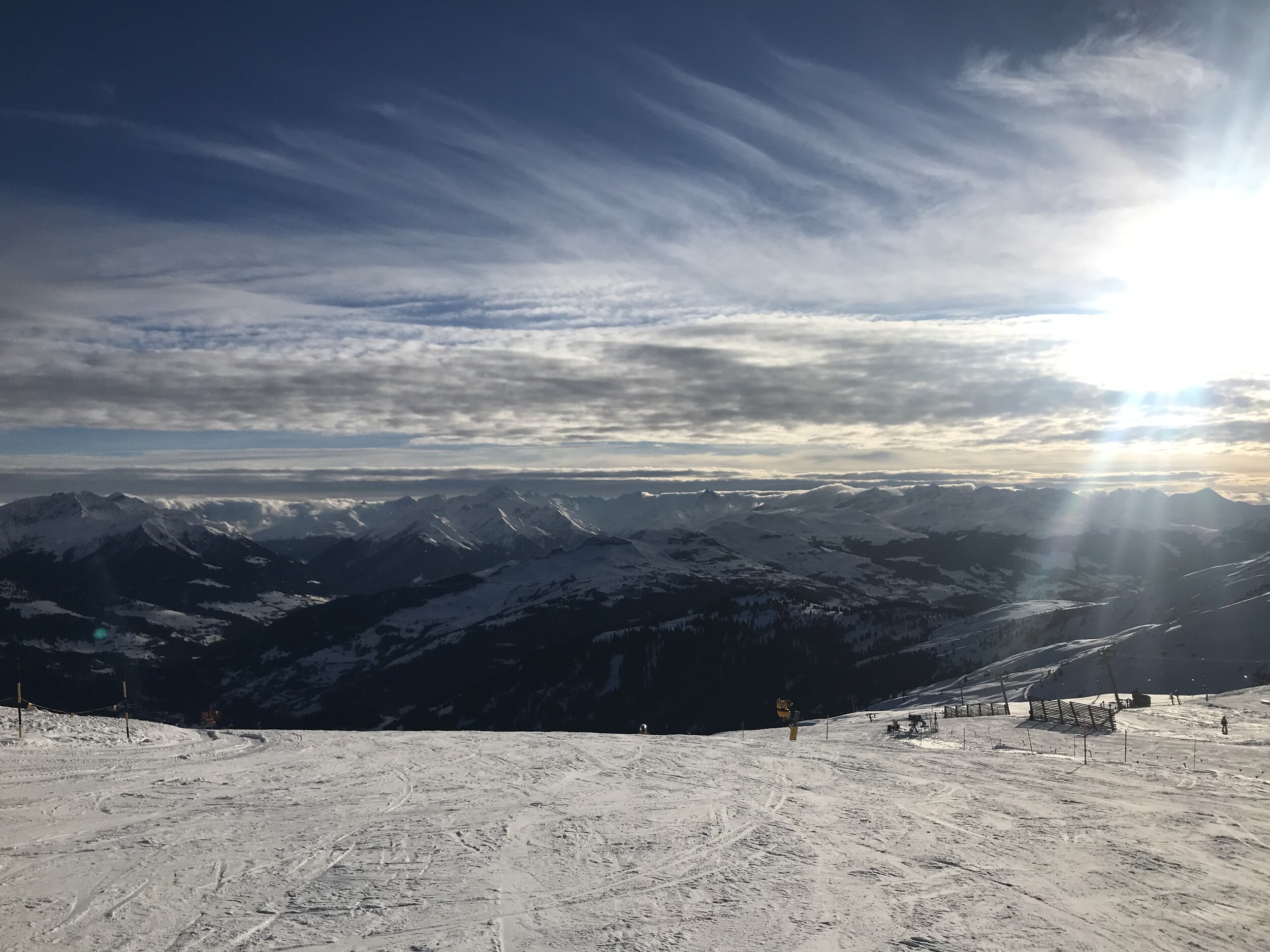 Danach die 66 nach Plaun, es gab überraschenderweise keine Wartezeiten am Arena Express nach Nagens und am Muotta Sessel. Man konnte sehen wie sich im Süden die Wolken über die Berge beim Piz Terri schieben: