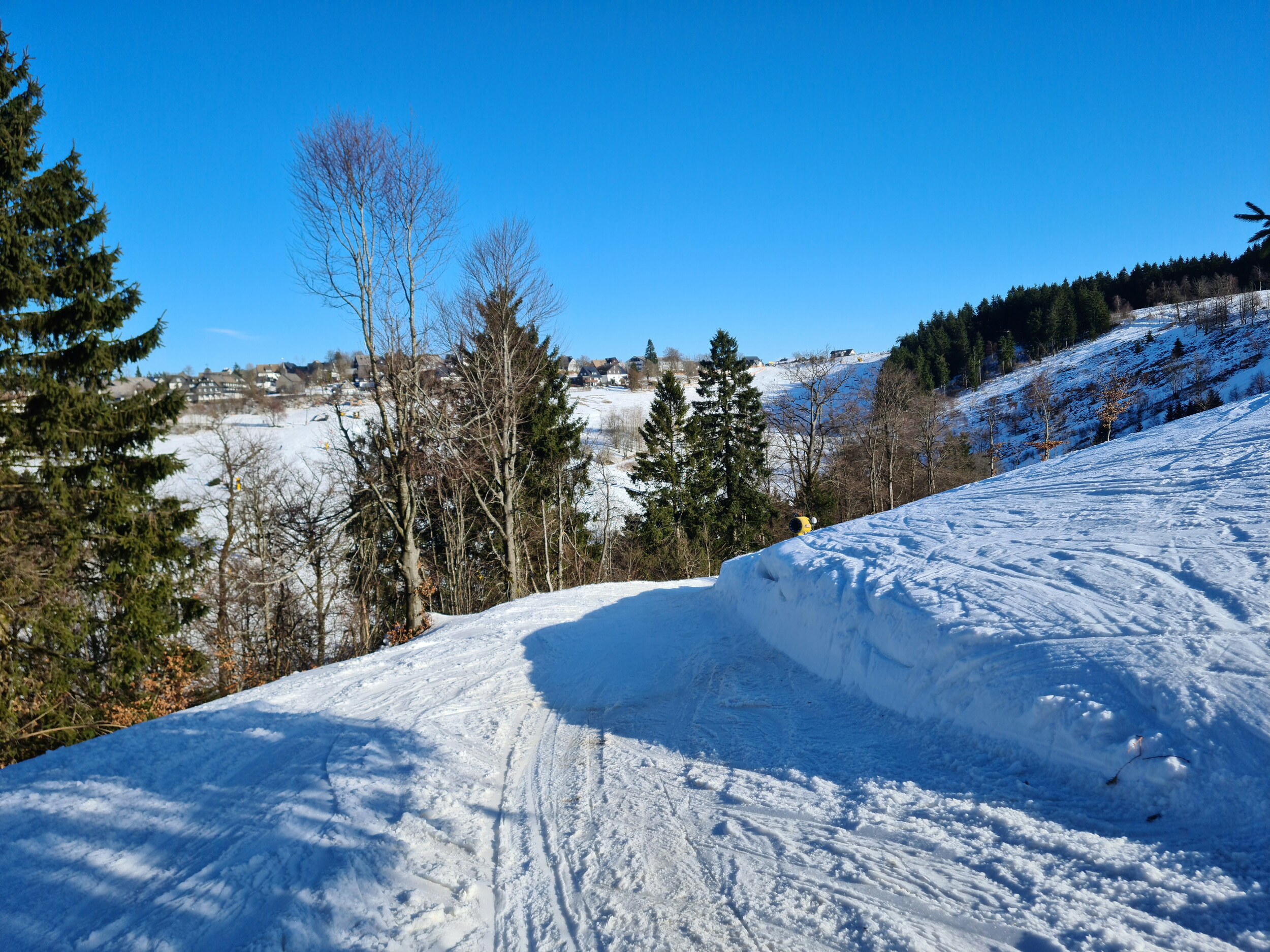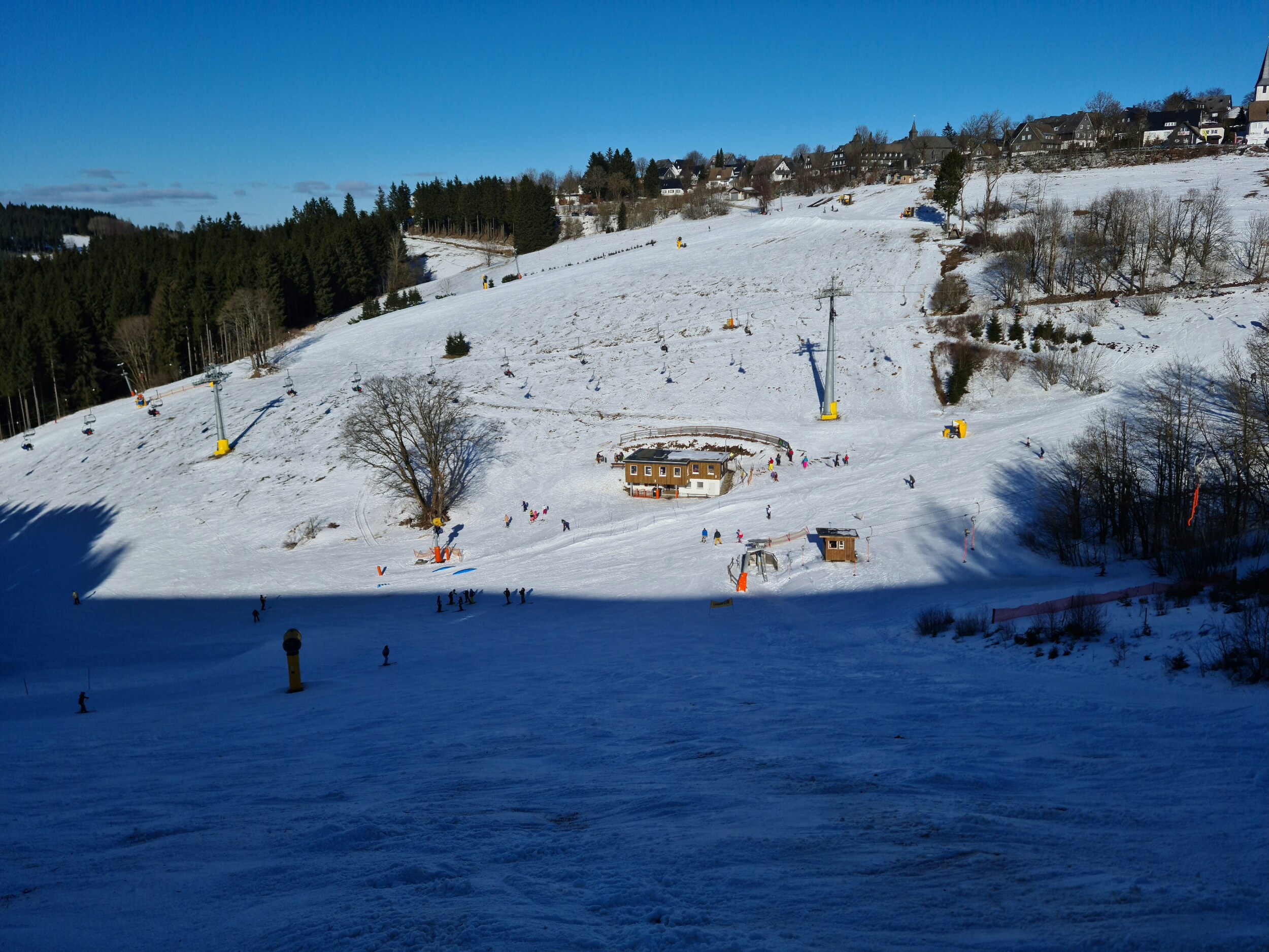 Bilder: #1- Start am Steilhang. Ein schöner, wenn auch kurzer Lift mit netter Piste. Diese sieht übrigens schlechter aus, als sie dann war, die allermeisten Steine konnte ich noch problemlos umfahren. #2- Oben kommt auch die Sonne raus, zuvor ist die Strecke dank Nordhanglage am frühen Nachmittag bereits im Schatten. #3- Sehr schön hier, und auch der etwas andere Blickwinkel auf das restliche Gebiet ist sehenswert. #4- Nun geht es aber weiter zum Schlepplift Westfalenhang 2. Dieser hat eine gleichmäßige, angenehm zu fahrende Steigung und überwindet mit knappen 100 Höhenmetern etwas mehr als der Steilhanglift. #5- Die zugehörige Abfahrt war recht hart, aber gut fahrbar. Oben sieht man übrigens die Zipline. #6- Und nun geht es zum Westfalenhang 1, von dem ich leider kein Foto vorweisen kann. #7- Die Verbindungsabfahrt zurück ins restliche Gebiet. Etwas rechts oberhalb der Bildmitte sieht man auch die Kapellenbahn.