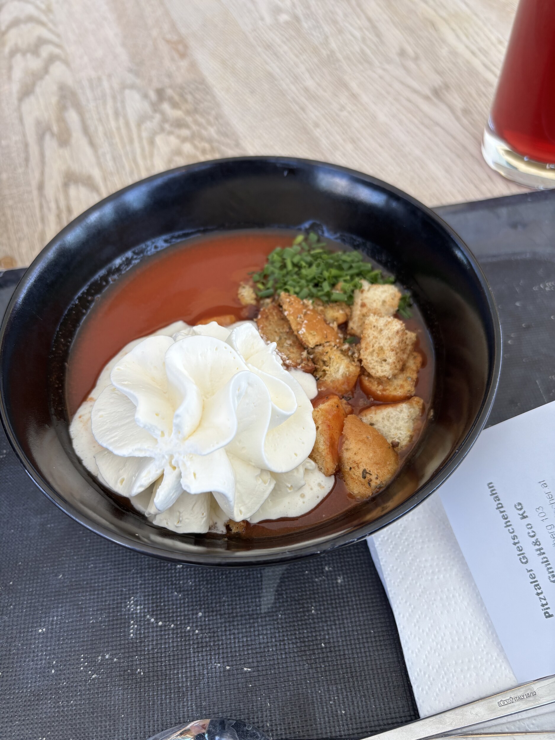 Halbe Tomatensuppe mit Sahne und Croutons.
