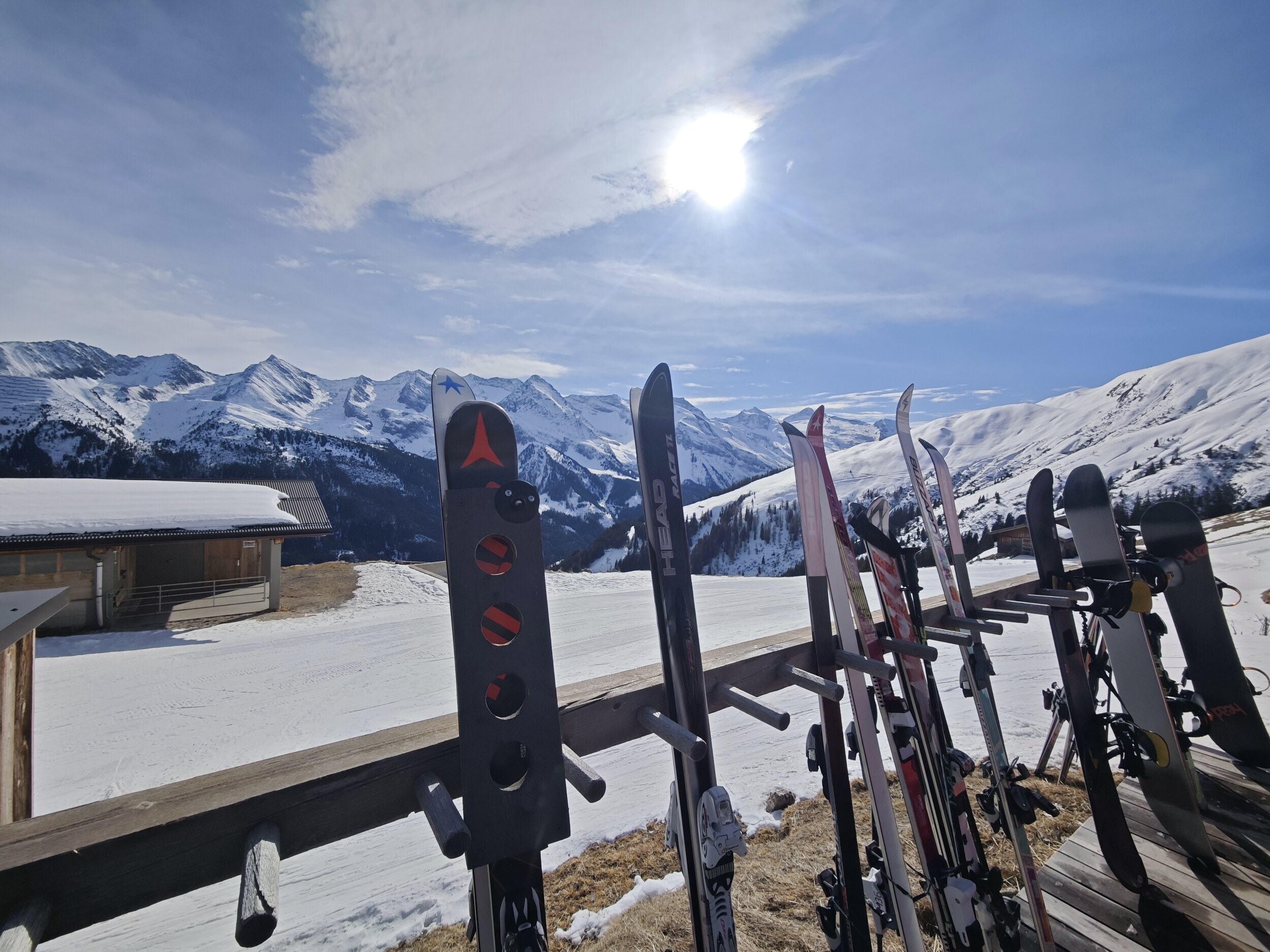Von dort führte der Weg weiter hinüber nach Finkenberg, bevor es mit der legendären 150er Tux hoch Richtung Eggalm ging. Je weiter man kam, verteilte sich die Masse deutlich besser. Die Pisten waren spürbar leerer und boten richtig viel Platz zum Carven. Ein kurzer Stopp für ein Käffchen bei Heidi durfte natürlich nicht fehlen – kleine Pause, große Aussicht. Zum Mittag ging es dann auf die Troppner Alm, eine urige Selbstbedienerhütte, die ihren Charme nicht verloren hat. Der Rückweg führte dann über Vorderlanersbach, und wie zu erwarten war, wurden die unteren Bereiche am Nachmittag zunehmend sulzig. Trotzdem blieben die Bedingungen insgesamt erstaunlich gut. Gleichzeitig zogen langsam Wolken auf, die der Stimmung aber keinen Abbruch taten. Zurück an der Horbergbahn war der Tag noch nicht ganz vorbei: Es ging noch einmal auf eine Abschlussrunde zum Schneekar und zur Möselbahn, bevor der Skitag über den Lärchenwald mit einem wohlverdienten Drink an der Horberggondel ausklang. Ein perfekter Abschluss, bevor es endgültig ins Tal ging.