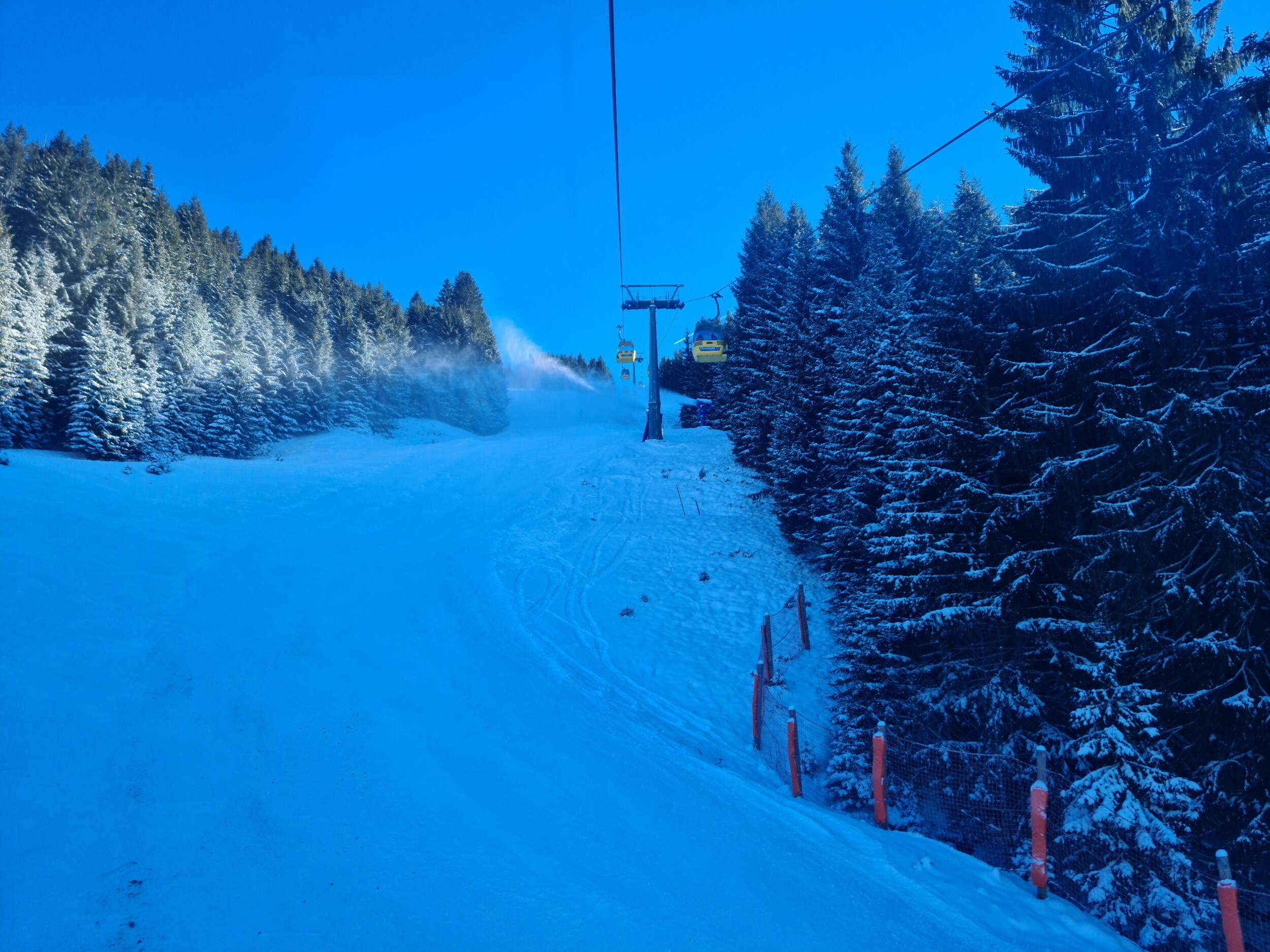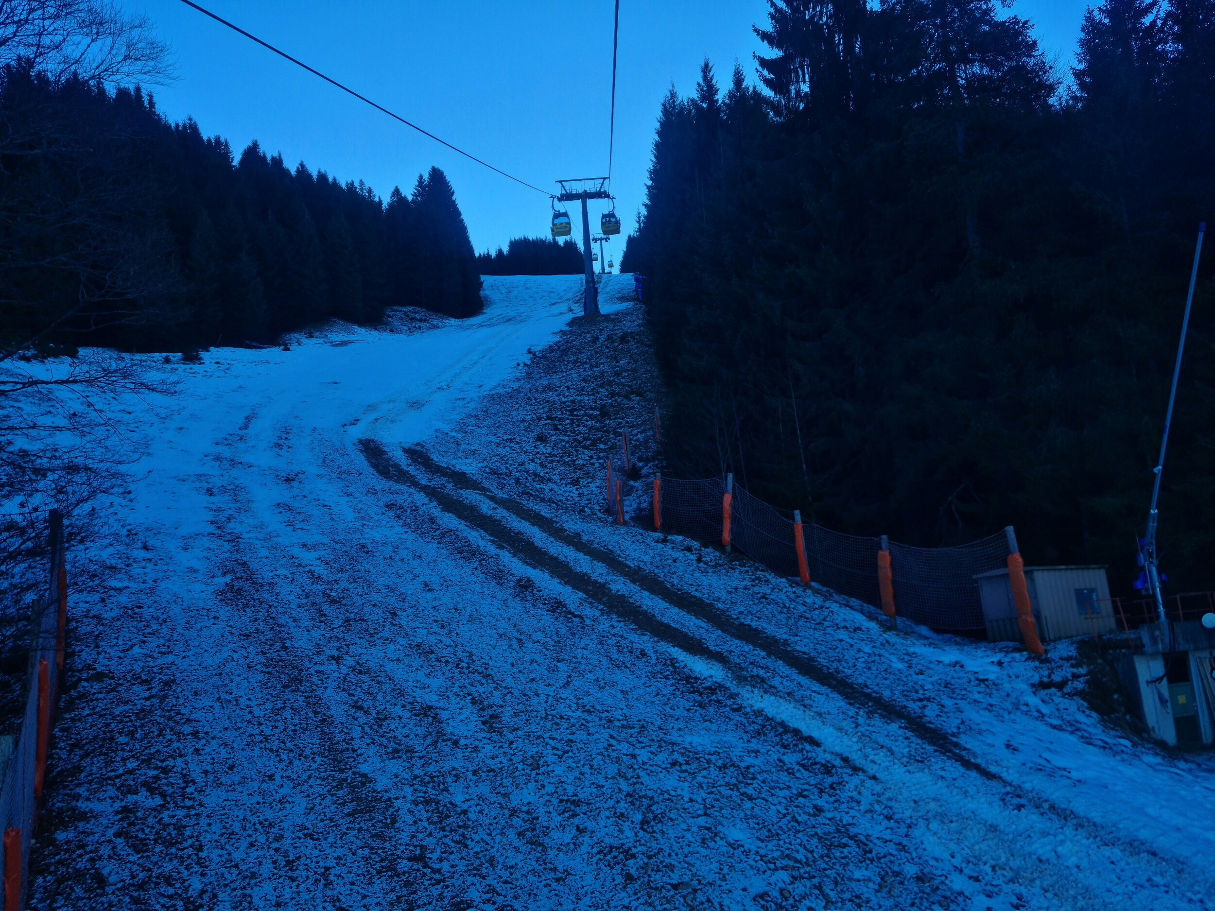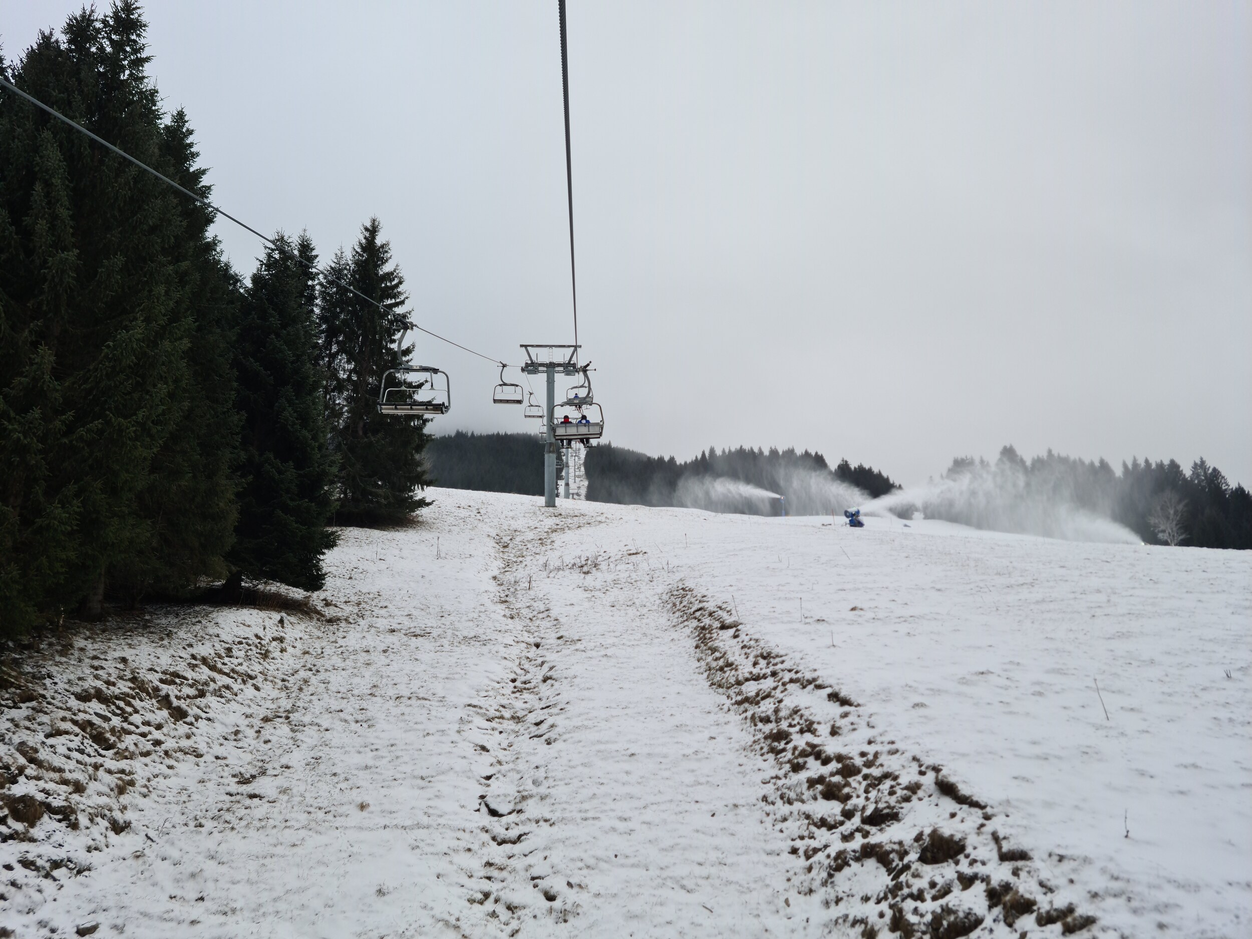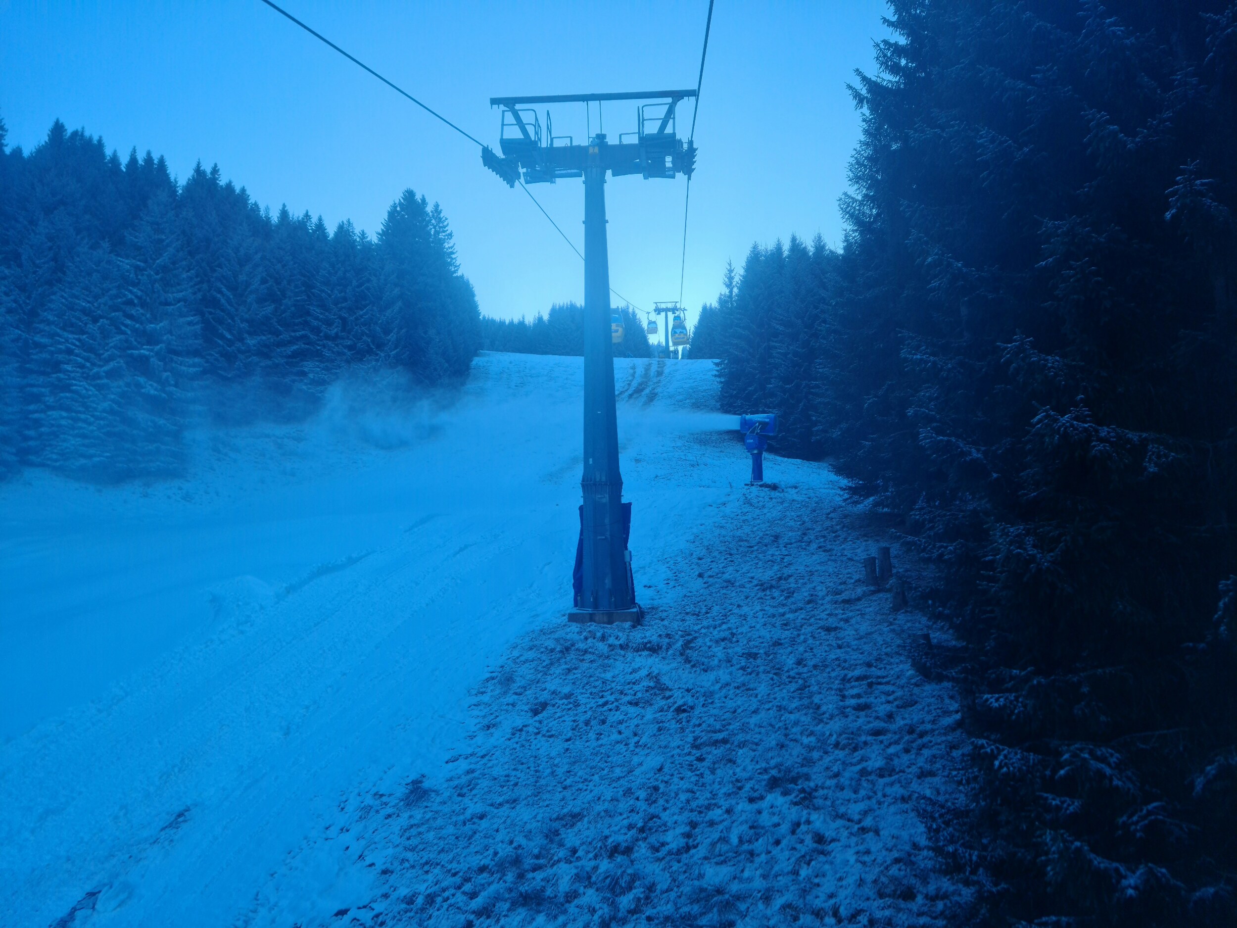 Und nochmal ein (sehr) kurzer Bericht aus Zöblen: Es ist kalt genug zum Beschneien. Unten wird die Piste in die Breite beschneit, oben momentan nicht (Anfangs lief ganz oben noch eine Kanone). Sie machen es schon sehr gut, dass man beim Skifahren kaum eingeschneit wird und gleichzeitig das Kältefenster genutzt wird. Lediglich auf wenigen Metern im Sessellift bekommt man die Ausläufer der Beschneiung ab.